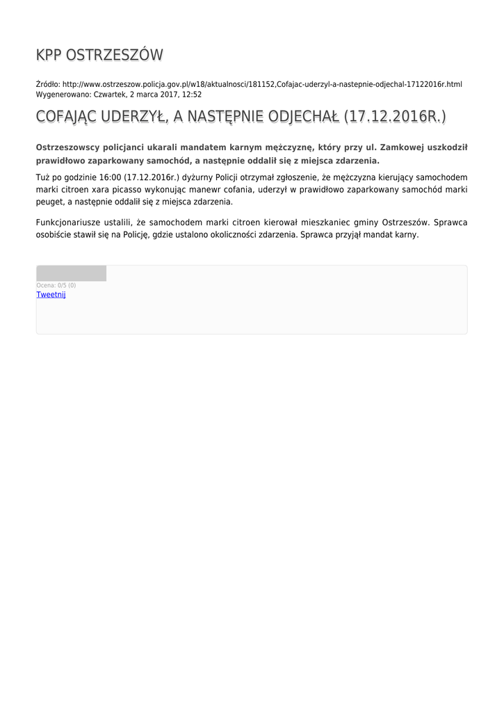 KPP OSTRZESZÓW Źródło: http://www.ostrzeszow.policja.gov.pl/w18/aktualnosci/181152,Cofajac-uderzyl-a-nastepnie-odjechal-17122016r.html Wygenerowano: Czwartek, 2 marca 2017, 12:52 COFAJĄC UDERZYŁ, A NASTĘPNIE ODJECHAŁ (17.12.2016R.) Ostrzeszowscy policjanci ukarali mandatem karnym mężczyznę, który przy ul. Zamkowej uszkodził prawidłowo zaparkowany samochód, a następnie oddalił się z miejsca zdarzenia. Tuż po godzinie 16:00 (17.12.2016r.) dyżurny Policji otrzymał zgłoszenie, że mężczyzna kierujący samochodem marki citroen xara picasso wykonując manewr cofania, uderzył w prawidłowo zaparkowany samochód marki peuget, a następnie oddalił się z miejsca zdarzenia. Funkcjonariusze ustalili, że samochodem marki citroen kierował mieszkaniec gminy Ostrzeszów. Sprawca osobiście stawił się na Policję, gdzie ustalono okoliczności zdarzenia. Sprawca przyjął mandat karny. Ocena: 0/5 (0) Tweetnij