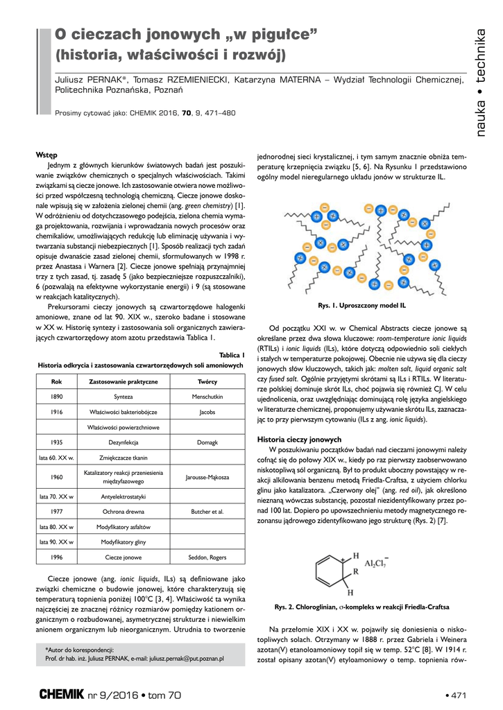 (historia, właściwości i rozwój) Juliusz PERNAK*, Tomasz RZEMIENIECKI, Katarzyna MATERNA – Wydział Technologii Chemicznej, Politechnika Poznańska, Poznań Prosimy cytować jako: CHEMIK 2016, 70, 9, 471–480 Wstęp Jednym z głównych kierunków światowych badań jest poszukiwanie związków chemicznych o specjalnych właściwościach. Takimi związkami są ciecze jonowe. Ich zastosowanie otwiera nowe możliwości przed współczesną technologią chemiczną. Ciecze jonowe doskonale wpisują się w założenia zielonej chemii (ang. green chemistry) [1]. W odróżnieniu od dotychczasowego podejścia, zielona chemia wymaga projektowania, rozwijania i wprowadzania nowych procesów oraz chemikaliów, umożliwiających redukcję lub eliminację używania i wytwarzania substancji niebezpiecznych [1]. Sposób realizacji tych zadań opisuje dwanaście zasad zielonej chemii, sformułowanych w 1998 r. przez Anastasa i Warnera [2]. Ciecze jonowe spełniają przynajmniej trzy z tych zasad, tj. zasadę 5 (jako bezpieczniejsze rozpuszczalniki), 6 (pozwalają na efektywne wykorzystanie energii) i 9 (są stosowane w reakcjach katalitycznych). Prekursorami cieczy jonowych są czwartorzędowe halogenki amoniowe, znane od lat 90. XIX w., szeroko badane i stosowane w XX w. Historię syntezy i zastosowania soli organicznych zawierających czwartorzędowy atom azotu przedstawia Tablica 1. Tablica 1 Historia odkrycia i zastosowania czwartorzędowych soli amoniowych Rok Zastosowanie praktyczne Twórcy 1890 Synteza Menschutkin 1916 Właściwości bakteriobójcze Jacobs Właściwości powierzchniowe 1935 Dezynfekcja lata 60. XX w. Zmiękczacze tkanin 1960 Katalizatory reakcji przeniesienia międzyfazowego lata 70. XX w Antyelektrostatyki 1977 Ochrona drewna lata 80. XX w Modyfikatory asfaltów lata 90. XX w Modyfikatory gliny 1996 Ciecze jonowe Domagk Jarousse-Mąkosza Butcher et al. Rys. 1. Uproszczony model IL Od początku XXI w. w Chemical Abstracts ciecze jonowe są określane przez dwa słowa kluczowe: room-temperature ionic liquids (RTILs) i ionic liquids (ILs), które dotyczą odpowiednio soli ciekłych i stałych w temperaturze pokojowej. Obecnie nie używa się dla cieczy jonowych słów kluczowych, takich jak: molten salt, liquid organic salt czy fused salt. Ogólnie przyjętymi skrótami są ILs i RTILs. W literaturze polskiej dominuje skrót ILs, choć pojawia się również CJ. W celu ujednolicenia, oraz uwzględniając dominującą rolę języka angielskiego w literaturze chemicznej, proponujemy używanie skrótu ILs, zaznaczając to przy pierwszym cytowaniu (ILs z ang. ionic liquids). Historia cieczy jonowych W poszukiwaniu początków badań nad cieczami jonowymi należy cofnąć się do połowy XIX w., kiedy po raz pierwszy zaobserwowano niskotopliwą sól organiczną. Był to produkt uboczny powstający w reakcji alkilowania benzenu metodą Friedla-Craftsa, z użyciem chlorku glinu jako katalizatora. „Czerwony olej” (ang. red oil), jak określono nieznaną wówczas substancję, pozostał niezidentyfikowany przez ponad 100 lat. Dopiero po upowszechnieniu metody magnetycznego rezonansu jądrowego zidentyfikowano jego strukturę (Rys. 2) [7]. Seddon, Rogers Ciecze jonowe (ang. ionic liquids, ILs) są definiowane jako związki chemiczne o budowie jonowej, które charakteryzują się temperaturą topnienia poniżej 100°C [3, 4]. Właściwość ta wynika najczęściej ze znacznej różnicy rozmiarów pomiędzy kationem organicznym o rozbudowanej, asymetrycznej strukturze i niewielkim anionem organicznym lub nieorganicznym. Utrudnia to tworzenie *Autor do korespondencji: Prof. dr hab. inż. Juliusz PERNAK, e-mail: [email protected] nr 9/2016 • tom 70 jednorodnej sieci krystalicznej, i tym samym znacznie obniża temperaturę krzepnięcia związku [5, 6]. Na Rysunku 1 przedstawiono ogólny model nieregularnego układu jonów w strukturze IL. Rys. 2. Chloroglinian, σ-kompleks w reakcji Friedla-Craftsa Na przełomie XIX i XX w. pojawiły się doniesienia o niskotopliwych solach. Otrzymany w 1888 r. przez Gabriela i Weinera azotan(V) etanoloamoniowy topił się w temp. 52°C [8]. W 1914 r. został opisany azotan(V) etyloamoniowy o temp. topnienia rów- • 471 nauka • technika O cieczach jonowych „w pigułce” nauka • technika nej 12°C [9], uważany za pierwszą opisaną niskotemperaturową ciecz jonową. W związku z tym za „ojca” ILs uznawany jest Walden. Z tym stwierdzeniem polemizuje Everts [10], przywołując słowa Boeck o tym, że prace Waldena co prawda dotyczyły przewodnictwa azotanu(V) etyloamoniowego, ale autor nie rozpoznał jego potencjalnego zastosowania. Ponadto Boeck wskazywał, iż sześć lat wcześniej Schall, uczeń Ostwalda (laureata nagrody Nobla, 1909), opublikował pracę o solach organicznych o niskiej temperaturze topnienia, dziś zaliczanych do ILs [11]. Odkrycia te nie zainteresowały środowisk naukowych. Należy przypuszczać, że istotnym powodem była słaba rozpuszczalność tych soli w wodzie, którą uznawano w tamtych latach za uniwersalny rozpuszczalnik. Ciekłymi solami organicznymi zainteresowano się w latach 50. XX w. W 1963 r. Yoke opisał reakcję chlorku miedzi(I) z chlorowodorkiem trietyloamoniowym, w wyniku której powstał ciekły produkt [12]. Na rozwój badań dotyczących ILs, szczególny wpływ miał cykl badań wykonanych w latach 60. oraz 70. XX w. w U.S. Air Force Academy przez Kinga i jego współpr. – Wilkesa oraz Carlina. Celem tych prac było znalezienie elektrolitu dla baterii termicznych. Wykorzystując patenty z 1948 r. [13], opracowano ogniwo z cieczą jonową powstałą w reakcji chlorku glinu z bromkiem 1-etylopirydyniowym w roli elektrolitu [14]. Z kolei zespół badawczy Kocha zastosował chloroglinian 1-etylopirydyniowy w roli rozpuszczalnika w reakcji katalitycznej [15]. Skuteczniejszy okazał się chloroglinian 1-butylopirydyniowy topiący się w temp. 40°C [16]. Jeszcze lepsze efekty uzyskano dla kationu 1