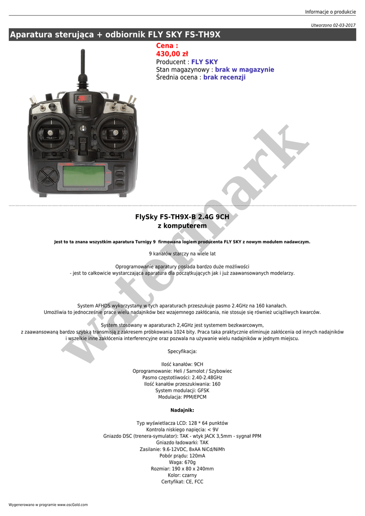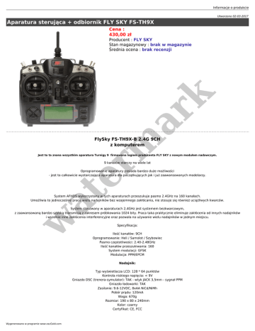 Informacje o produkcie Utworzono 02-03-2017 Aparatura sterująca + odbiornik FLY SKY FS-TH9X Cena : 430,00 zł er m ar k Producent : FLY SKY Stan magazynowy : brak w magazynie Średnia ocena : brak recenzji FlySky FS-TH9X-B 2.4G 9CH z komputerem Jest to ta znana wszystkim aparatura Turnigy 9 firmowana logiem producenta FLY SKY z nowym modułem nadawczym. 9 kanałów starczy na wiele lat at Oprogramowanie aparatury posiada bardzo duże możliwości - jest to całkowicie wystarczająca aparatura dla początkujących jak i już zaawansowanych modelarzy. System AFHDS wykorzystany w tych aparaturach przeszukuje pasmo 2.4GHz na 160 kanałach. Umożliwia to jednocześnie prace wielu nadajników bez wzajemnego zakłócania, nie stosuje się również uciążliwych kwarców. w System stosowany w aparaturach 2,4GHz jest systemem bezkwarcowym, z zaawansowaną bardzo szybką transmisją z zakresem próbkowania 1024 bity. Praca taka praktycznie eliminuje zakłócenia od innych nadajników i wszelkie inne zakłócenia interferencyjne oraz pozwala na używanie wielu nadajników w jednym miejscu. Specyfikacja: Ilość kanałów: 9CH Oprogramowanie: Heli / Samolot / Szybowiec Pasmo częstotliwości: 2.40-2.48GHz Ilość kanałów przeszukiwania: 160 System modulacji: GFSK Modulacja: PPM/EPCM Nadajnik: Typ wyświetlacza LCD: 128 * 64 punktów Kontrola niskiego napięcia: < 9V Gniazdo DSC (trenera-symulator): TAK - wtyk JACK 3,5mm - sygnał PPM Gniazdo ładowarki: TAK Zasilanie: 9.6-12VDC, 8xAA NiCd/NiMh Pobór prądu: 120mA Waga: 670g Rozmiar: 190 x 80 x 240mm Kolor: czarny Certyfikat: CE, FCC Wygenerowano w programie www.oscGold.com Odbiornika: Liczba kanałów: 8 Zasilanie: 4,8V - 6V Pobór Prądu: 9,5mA (dla 4,8V) W zestawie: - nadajnik - moduł 2,4ghz - odbiornik 8 ch - instrukcja -kabel do bindowania w at Gwarancja: 12 miesięcy er m ar k Gwarancja 12 miesięcy