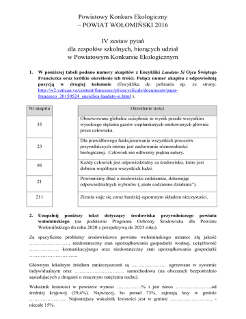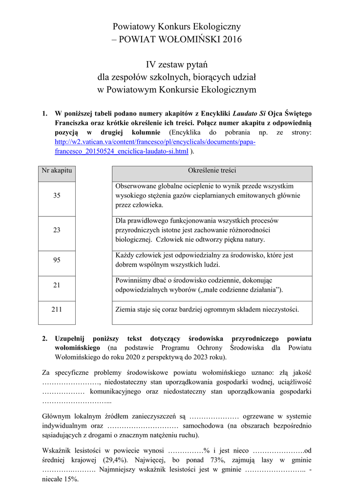Powiatowy Konkurs Ekologiczny – POWIAT WOŁOMIŃSKI 2016 IV zestaw pytań dla zespołów szkolnych, biorących udział w Powiatowym Konkursie Ekologicznym 1. W poniższej tabeli podano numery akapitów z Encykliki Laudato Si Ojca Świętego Franciszka oraz krótkie określenie ich treści. Połącz numer akapitu z odpowiednią pozycją w drugiej kolumnie (Encyklika do pobrania np. ze strony: http://w2.vatican.va/content/francesco/pl/encyclicals/documents/papafrancesco_20150524_enciclica-laudato-si.html ). Nr akapitu 2. Określenie treści 35 Obserwowane globalne ocieplenie to wynik przede wszystkim wysokiego stężenia gazów cieplarnianych emitowanych głównie przez człowieka. 23 Dla prawidłowego funkcjonowania wszystkich procesów przyrodniczych istotne jest zachowanie różnorodności biologicznej. Człowiek nie odtworzy piękna natury. 95 Każdy człowiek jest odpowiedzialny za środowisko, które jest dobrem wspólnym wszystkich ludzi. 21 Powinniśmy dbać o środowisko codziennie, dokonując odpowiedzialnych wyborów („małe codzienne działania”). 211 Ziemia staje się coraz bardziej ogromnym składem nieczystości. Uzupełnij poniższy tekst dotyczący środowiska przyrodniczego powiatu wołomińskiego (na podstawie Programu Ochrony Środowiska dla Powiatu Wołomińskiego do roku 2020 z perspektywą do 2023 roku). Za specyficzne problemy środowiskowe powiatu wołomińskiego uznano: złą jakość ……………………, niedostateczny stan uporządkowania gospodarki wodnej, uciążliwość ……………… komunikacyjnego oraz niedostateczny stan uporządkowania gospodarki ………………………... Głównym lokalnym źródłem zanieczyszczeń są ………………… ogrzewane w systemie indywidualnym oraz ………………………… samochodowa (na obszarach bezpośrednio sąsiadujących z drogami o znacznym natężeniu ruchu). Wskaźnik lesistości w powiecie wynosi ……………% i jest nieco ………………….od średniej krajowej (29,4%). Najwięcej, bo ponad 73%, zajmują lasy w gminie ………….………. Najmniejszy wskaźnik lesistości jest w gminie …………………….. niecałe 15%. 3. Co oznaczają poniższe oznakowania: ……………………… ……………………… 4. …………………. …………………. …………………… ……………………. …………………… ……………………. Podaj, jak nazywają się gatunki, które stanowią zagrożenie dla flory i fauny danego obszaru, gdyż konkurują z gatunkami rodzimymi i mogą doprowadzić do ich wyginięcia? Ich przykłady zostały przedstawione na poniższych zdjęciach. Podaj nazwy roślin ze zdjęć (wystarczy podać nazwę polską). By Popadius - Praca własna, Domena publiczna By Aung - Praca własna Domena publiczna …………………………………………………………….. …………………………………………………………………… By Brosen - Praca własna, CC BY 2.5 Domena publiczna …………………………………………………………….. ……………………………………………………… …………………………………………………………….. ……………………………………………………… 5. Podkreśl prawidłowe odpowiedzi na pytania testowe (jednokrotnego wyboru). I. Który zestaw zawiera tylko nazwy nieodnawialnych źródeł energii? a) energia geotermalna, energia wody, biopaliwa b) energia wody, energia słoneczna, węgiel kamienny c) węgiel kamienny, gaz ziemny, ropa naftowa d) odpowiedzi a i c są prawidłowe II. Jakie są podstawowe funkcje lasu? a) korzenie drzew umacniają glebę, zabezpieczając ją przed erozją b) stabilizuje obieg wody w przyrodzie c) produkcja tlenu d) wszystkie odpowiedzi są prawidłowe III. Zaznacz prawidłowe stwierdzenie (na podstawie danych GUS): a) przeciętny mieszkaniec Polski wytworzył w 2014 r. 268 kg odpadów b) przeciętny mieszkaniec Polski wytworzył w 2014 r. 587 kg odpadów c) przeciętny mieszkaniec Polski wytworzył w 2014 r. 150 kg odpadów d) żadna odpowiedz nie jest prawidłowa