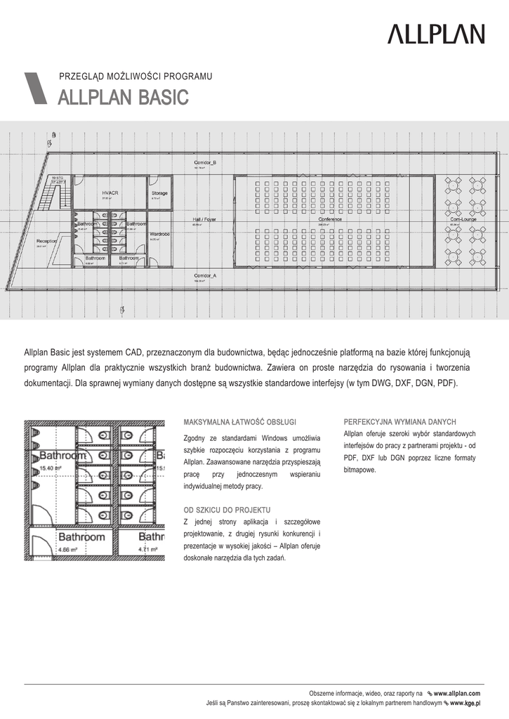 PRZEGLĄD MOŻLIWOŚCI PROGRAMU ALLPLAN BASIC Allplan Basic jest systemem CAD, przeznaczonym dla budownictwa, będąc jednocześnie platformą na bazie której funkcjonują programy Allplan dla praktycznie wszystkich branż budownictwa. Zawiera on proste narzędzia do rysowania i tworzenia dokumentacji. Dla sprawnej wymiany danych dostępne są wszystkie standardowe interfejsy (w tym DWG, DXF, DGN, PDF). MAKSYMALNA ŁATWOŚĆ OBSŁUGI Zgodny ze standardami Windows umożliwia szybkie rozpoczęciu korzystania z programu Allplan. Zaawansowane narzędzia przyspieszają pracę przy jednoczesnym wspieraniu PERFEKCYJNA WYMIANA DANYCH Allplan oferuje szeroki wybór standardowych interfejsów do pracy z partnerami projektu - od PDF, DXF lub DGN poprzez liczne formaty bitmapowe. indywidualnej metody pracy. OD SZKICU DO PROJEKTU Z jednej strony aplikacja i szczegółowe projektowanie, z drugiej rysunki konkurencji i prezentacje w wysokiej jakości – Allplan oferuje doskonałe narzędzia dla tych zadań. Obszerne informacje, wideo, oraz raporty na www.allplan.com Jeśli są Panstwo zainteresowani, proszę skontaktować się z lokalnym partnerem handlowym www.kge.pl Łatwość stosowania Intuicyjny interfejs użytkownika z palety jest dowolnie konfigurowany za pomocą Drag&Drop, uchwytów, menu skrótów i skrótów zgodnych z Window. Niezwykle szybkie tworzenie elementu jest aktywne z prawego przycisku myszy w oparciu o funkcję Asystenci. Można skorzystać z formatu malarza w celu szybkiego transferu elementów formatu. Zeskanowane plany mogą być także zintegrowane i w prosty sposób edytowane. Wszechstronne narzędzia do projektowania Funkcje inteligentnego wprowadzania punktu „przyjaznego dla użytkownika” umożliwiają rysowanie poprzez zaledwie kilka kliknięć. Pakiet oferuje praktyczne wsparcie projektu, takie jak dynamiczna siatka w małej skali lub siatka osi budynków i linii konstrukcyjnych. Dzięki automatycznemu wykrywaniu konturu można szybko narysować wypełnienie, kreskowanie, wzory i obszary bitmapy. Dostępne są, takie typy linii jak np. rozbiórka obiektów modernizowanych. Można wstawać teksturę, kreskowanie, wypełnienie. Narzędzia do wymiarowania oferują możliwości wstawiania linii wymiarowych w oparciu o konfigurowalne reguły (np. DIN, EC2) oraz wyszukiwanie błędów. Profesjonalne kalki i projektowanie Program łączy szybko rysunki, obrazy i teksty do tworzenia wyplotów płyt i prezentacji. Funkcje do ustawiania i dystrybuowania elementów wspierają profesjonalne projektowanie. Dostępny jest szeroki zakres symboli (np. meble, samochody i drzewa) i tekstur. Można używać tych tekstur na przykład do tworzenia realistycznych obrazów, jak również do wypełnienia kolorami i przejrzystością ustawienia świateł. Możliwe są również edycje właściwości elementów. Modyfikacja może być stosowana do tekstów i wymiarów, jak pozostałe funkcje dostępna jest z palet. Rysunki mogą być przedstawiane w skali szarości oraz w kolorach. Skuteczna wymiana danych poprzez PDF Dla sprawnej komunikacji z klientami jest możliwość zapisania rysunków w formacie PDF. Format PDF-A może być użyty do archiwizacji. Standaryzacja ISO zapewnia czytelność przez wiele lat. Importowanie danych PDF jest również obsługiwane: w ten sposób można łatwo importować dane lub rysunki producenta za pomocą Drag & Drop. Nieograniczona interoperacyjność Niezależnie od tego czy wybierzesz DXF, DWG, DGN oraz IFC, Allplan oferuje praktycznie nieograniczone możliwości wymiany danych. Technologia interfejsu wymiany danych „ulubionych” gwarantuje wysokiej jakości wymiany danych. Oprogramowanie Facility management może być łatwo zintegrowane na platformie Allplan. Wydajne zarządzanie danymi Przechowywanie danych w postaci rysunków pozwala na jednoczesne otwieranie do 60 plików jednocześnie. Allplan wykorzystuje moc obliczeniową komputera i decyduje, że ładowane są tylko wymagane warstwy obiektu. Rysowanie i plot Operacje "rysowanie" i "plotowanie" są w programie Allplan oddzielone. Podczas rysowania elementów, nie trzeba decydować, o późniejszym plotowaniu. Program oferuje przyjazne dla użytkownika kalki z funkcją obcinania rysunków ponadgabarytowych. Do prezentacji detali, można użyć okna kalki, który przyjmie formę dowolnego wielokąta. Inne zalety to szybki wydruk z podglądem oraz driver rastrowy RTL dla optymalnego wydruku, dla rysunków o dużej ilości danych rozmiaru bitmapy. AKTUALNE WYMAGANIA SYSTEMOWE DOSTĘPNE SĄ NA WWW.ALLPLAN.COM/INFO/SYSINFO OSIĄGNIJ WIĘCEJ Z ALLPLAN – UMOWA SERWISOWA PLUS! Minimalne wymagania systemowe: - karta graficzna z pamięcią 1 GB RAM - system Windows 64Bit. W ramach Umowy serwisowej plus oprócz naszych usług oferujemy dodatkowo ciągłą aktualizację programu Allplan więcej informacji na: http://kge.pl KGE Sp. z.o.o. Sp. k. ul. Krokwi 32 lok.25 Tel +48 22 300 25 00 03-114 WARSZAWA Fax +48 22 300 25 01 www.kge.pl © 07.2016 Allplan GmbH, Munich, Germany PRZEGLĄD MOŻLIWOŚCI