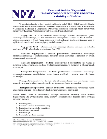 Pomorski Oddział Wojewódzki NARODOWEGO FUNDUSZU ZDROWIA z siedzibą w Gdańsku W celu jednolicenia wykonywania i rozliczania badań TK i NMR Pomorski Oddział Wojewódzki Narodowego Funduszu Zdrowia w uzgodnieniu z Wojewódzkim Konsultantem w Dziedzinie Radiologii i Diagnostyki Obrazowej zamieszcza definicje badań obrazowych zawartych w Katalogu Ambulatoryjnych Świadczeń Diagnostycznych. Angiografia TK – obrazowanie anatomicznego obszaru unaczynienia (jedna sekwencja) zrekonstrukcją 3D lub obrazowanie unaczynienia narządu w trzech fazach – tętniczej, pośredniej i żylnej (jedna sekwencja przed podaniem środka cieniującego oraz w trybie trzech oddzielnych sekwencji po podaniu kontrastu). Angiografia NMR – obrazowanie anatomicznego obszaru unaczynienia techniką napływową(TOF) lub techniką kontrastującą fazę (PC) Rezonans magnetyczny - badanie podstawowe: obrazowanie określonego obszaruanatomicznego z zastosowaniem minimum trzech sekwencji i minimum w dwóch płaszczyznach obrazowych Rezonans magnetyczny - badanie sekwencyjne z kontrastem :jak wyżej: z minimum jednąsekwencją po podaniu środka kontrastującego, w minimum 2 płaszczyznach obrazowych Tomografia komputerowa - badanie podstawowe: obrazowanie określonego rejonuanatomicznego umożliwiające ocenę tkanek miękkich i struktur kostnych (jedna sekwencja) Tomografia komputerowa - badanie z kontrastem: obrazowanie określonego rejonu anatomicznego po dożylnym podaniu środka kontrastowego (jedna sekwencja) Tomografia komputerowa - badanie dwufazowe : obrazowanie określonego rejonu anatomicznego przed i po podaniu środka kontrastowego (dwie sekwencje) Wykaz badań, które w zrozumieniu katalogu świadczeń stanowią jedno badanie diagnostyczne (po uwzględnieniu liczby skanów i autonomicznej badania której wymaga określony narząd): 1. 2. 3. 4. 5. 6. badanie głowy badanie celowane kości skroniowej badanie celowane siodła tureckiego badanie twarzoczaszki badanie szyi badanie kręgosłupa szyjnego Adres Centrali NFZ: ul. Grójecka 186, 02-390 Warszawa Sekretariat Gabinetu Prezesa: tel.: ( 0-22 ) 572 60 12, fax: 572 63 30 Adres Oddziału: ul. Podwale Staromiejskie 69, 80-844 Gdańsk, tel.: (0-58) 321 85 39 fax (058) 321 85 15 ades e-mail: [email protected]; strona internetowa: www.nfz.gov.pl 7. badanie klatki piersiowej 8. badanie kręgosłupa piersiowego 9. badanie jamy brzusznej 10. badanie kregosłupa lędźwiowego 11. badanie stawu 12. badanie kończyny (jeden odcinek zawarty pomiędzy dwoma najbliższymi stawami) Uwagi: a. Jama brzuszna w całości stanowi jeden obszar anatomiczny, nie ma uzasadnienia badania jamy brzusznej na podstawie dwóch skierowań – „jamy brzusznej” i „miednicy małej”. Można ograniczyć badania jej odcinka (nadbrzusza lub miednicy małej), jeżeli istnieją wskazania lekarskie (np. w przypadku monitorowania określonego procesu patologicznego lub na okoliczność ochrony przeciwpromiennej). b. Badanie angio obejmujące kilka odcinków anatomicznych (np. aorty odcinka piersiowego i brzusznego lub tętnic kończyn dolnych) należy traktować jako jedno badanie pojedyncze. c. Badania typu „polytrauma” obejmujące kilka odcinków anatomicznych np. szyi, klatka piersiowa i jamy brzusznej należy traktować jako trzy oddzielne badania. Powyższe informacje są obowiązujące od dnia ich zamieszczenia
