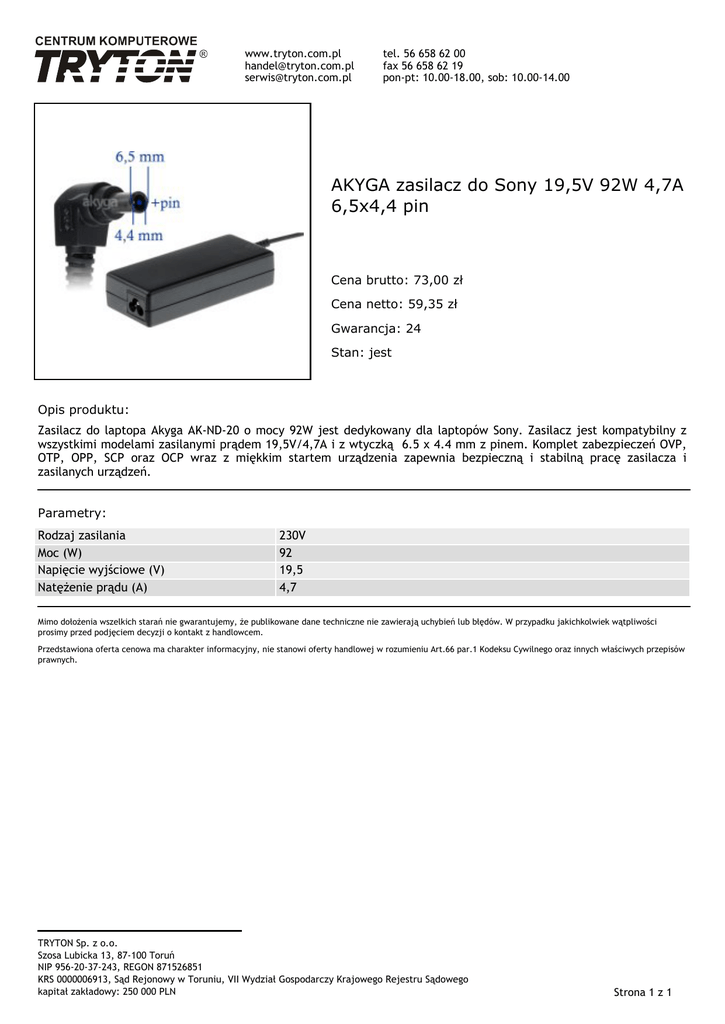 www.tryton.com.pl [email protected] [email protected] tel. 56 658 62 00 fax 56 658 62 19 pon-pt: 10.00-18.00, sob: 10.00-14.00 AKYGA zasilacz do Sony 19,5V 92W 4,7A 6,5x4,4 pin Cena brutto: 73,00 zł Cena netto: 59,35 zł Gwarancja: 24 Stan: jest Opis produktu: Zasilacz do laptopa Akyga AK-ND-20 o mocy 92W jest dedykowany dla laptopów Sony. Zasilacz jest kompatybilny z wszystkimi modelami zasilanymi prądem 19,5V/4,7A i z wtyczką 6.5 x 4.4 mm z pinem. Komplet zabezpieczeń OVP, OTP, OPP, SCP oraz OCP wraz z miękkim startem urządzenia zapewnia bezpieczną i stabilną pracę zasilacza i zasilanych urządzeń. Parametry: Rodzaj zasilania Moc (W) Napięcie wyjściowe (V) Natężenie prądu (A) 230V 92 19,5 4,7 Mimo dołożenia wszelkich starań nie gwarantujemy, że publikowane dane techniczne nie zawierają uchybień lub błędów. W przypadku jakichkolwiek wątpliwości prosimy przed podjęciem decyzji o kontakt z handlowcem. Przedstawiona oferta cenowa ma charakter informacyjny, nie stanowi oferty handlowej w rozumieniu Art.66 par.1 Kodeksu Cywilnego oraz innych właściwych przepisów prawnych. TRYTON Sp. z o.o. Szosa Lubicka 13, 87-100 Toruń NIP 956-20-37-243, REGON 871526851 KRS 0000006913, Sąd Rejonowy w Toruniu, VII Wydział Gospodarczy Krajowego Rejestru Sądowego kapitał zakładowy: 250 000 PLN Strona 1 z 1