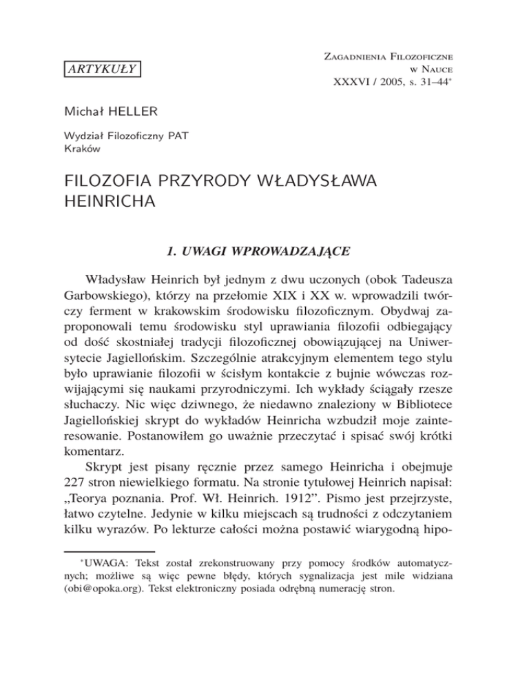 Zagadnienia Filozoficzne w Nauce XXXVI / 2005, s. 31–44∗ ARTYKUŁY Michał HELLER Wydział Filozoficzny PAT Kraków FILOZOFIA PRZYRODY WŁADYSŁAWA HEINRICHA 1. UWAGI WPROWADZAJĄCE Władysław Heinrich był jednym z dwu uczonych (obok Tadeusza Garbowskiego), którzy na przełomie XIX i XX w. wprowadzili twórczy ferment w krakowskim środowisku filozoficznym. Obydwaj zaproponowali temu środowisku styl uprawiania filozofii odbiegający od dość skostniałej tradycji filozoficznej obowiązującej na Uniwersytecie Jagiellońskim. Szczególnie atrakcyjnym elementem tego stylu było uprawianie filozofii w ścisłym kontakcie z bujnie wówczas rozwijającymi się naukami przyrodniczymi. Ich wykłady ściągały rzesze słuchaczy. Nic więc dziwnego, że niedawno znaleziony w Bibliotece Jagiellońskiej skrypt do wykładów Heinricha wzbudził moje zainteresowanie. Postanowiłem go uważnie przeczytać i spisać swój krótki komentarz. Skrypt jest pisany ręcznie przez samego Heinricha i obejmuje 227 stron niewielkiego formatu. Na stronie tytułowej Heinrich napisał: „Teorya poznania. Prof. Wł. Heinrich. 1912”. Pismo jest przejrzyste, łatwo czytelne. Jedynie w kilku miejscach są trudności z odczytaniem kilku wyrazów. Po lekturze całości można postawić wiarygodną hipo∗ UWAGA: Tekst został zrekonstruowany przy pomocy środków automatycznych; możliwe są więc pewne błędy, których sygnalizacja jest mile widziana ([email protected]). Tekst elektroniczny posiada odrębną numerację stron. 2 Michał HELLER tezę, że wykład, choć zatytułowany „Teorya poznania”, był zamierzony jako ogólne wprowadzenie do filozofii dla studentów, którzy dotychczas nie mieli z nią bliższego kontaktu. Całość jest wprawdzie skomponowana pod kątem teorii poznania, ale materiał obejmuje również zagadnienia typowe dla filozofii przyrody i filozofii nauki. W niniejszych uwagach skupię się na problematyce filozoficzno-przyrodniczej, ale w perspektywie całości poglądów przedstawionych w skrypcie. Rozpocznę od ukazania punktu wyjścia filozofowania Heinricha, który tę perspektywę ukazuje, a zakończę kilkoma uwagami na temat filozofii nauki (metodologii) Heinricha. Pisząc mój komentarz do wykładów Heinricha, celowo postawiłem się w sytuacji jego początkującego słuchacza, który o poglądach wykładowcy wie tylko tyle, ile on zechce ujawnić na sali wykładowej. Porównanie treści skryptu z innymi opublikowanymi pracami Władysława Heinricha wymagałoby odrębnego studium. 2. PUNKT WYJŚCIA FILOZOFOWANIA Istnieją dwa zasadniczo różne sposoby uprawiania filozofii. Według zwolenników pierwszego, podstawowym działem filozofii jest ontologia i systematyczny wykład filozofii powinien zaczynać się od kwestii ontologicznych. Zwolennicy drugiego za podstawowy dział filozofii uważają teorię poznania i wykład filozofii rozpoczynają od pytań teoriopoznawczych. Heinrich niewątpliwie należy do tych drugich. Pierwsze zdanie jego manuskryptu brzmi: „Wszelkie filozofowanie opiera się na dokładnie ustalonych teoretyczno–poznawczych podstawach” [s. 5]. Ale już drugie zdanie wskazuje, że Heinrich jest daleki od epistemologicznego fundamentalizmu: „Ale z drugiej strony także zagadnienia teorii poznania i sposób ich rozwiązania zależą od kierunku filozoficznego” [tamże]. W punkcie wyjścia filozofii należy zatem ustalić zasady teoriopoznawcze i uświadomić sobie, z jakiej filozoficznej motywacji one wypływają. Jest rzeczą interesującą, że Heinrich nie chce uzależniać FILOZOFIA PRZYRODY WŁADYSŁAWA HEINRICHA 3 się od żadnego konkretnego systemu filozoficznego; pragnie natomiast nawiązywać do historycznego rozwoju filozofii. Rozwój pociąga za sobą zawsze powstawanie nowych problemów, które będą wymagały odpowiedzi. Formy odpowiedzi będą różne. Jedne będą się starały problematy te przystosować do starych warunków, drugie będą ujęciami nowemi. Ze względu na warunki powstania nowych ujęć mamy historyczną konsekwencję, która polega na tem, że i te nowe próby nie są dowolnym tworem indywidualnej spekulacji. Pogląd musi oczywiście być wypowiedzianym przez indywiduum, ale istnieje pewna ogólna atmosfera umysłowa, stosownie do której reaguje to indywiduum. Pomimo rozmaitości poglądów istnieje pewna kierunkowość w ich powstawaniu. Każde rozwiązanie nowe musi być przygotowanem [s. 19–20]. Należy się zatem kierować tą „historyczną konsekwencją”, a nie jakimiś założeniami systemowymi. Co więcej, „historyczna konsekwencja” powinna obejmować nie tylko najnowsze poglądy. „Aby więc stworzyć podstawę ważną dla wszystkich ujęć filozoficznych, trzeba się tak zoryentować, aby punkt wyjścia pozwalał na równorzędne ujęcie stanowiska tak starożytnych, jak też i nowożytnych myślicieli” [s. 22]. Wprawdzie „nie może istnieć bezwzględne rozwiązanie zagadki świata”, lecz tylko „zależne od historycznego rozwoju” [s. 24–25], ale nawet tego rodzaju względne rozwiązanie musimy oceniać z perspektywy „czegoś stałego”. Zdaniem Heinricha, czymś takim jest „bezpośrednio dana całość świata” [s. 25]. To oczywiście wymaga wyjaśnienia. Współcześni myśliciele za pośrednio dane uważają wrażenia (Mach) lub „to, co jest objawem świadomości” (Pearson). Heinrich poglądy te nazywa „podmiotowością metafizyczną” i sam opowiada się za stanowiskiem, które nazywa „podmiotowością poznawczą”. „Jeżeli przyjmiemy bezpośrednio dany świat, tak, jak on jest dany, to rezultatem filozofowania będą rozmaite tłumaczenia, rozmaite ujęcia tego świata. One będą różne, ale będą tłumaczeniami tegoż świata. Świat dany nam był przed ujęciami” [s. 24]. Przy takim podejściu 4 Michał HELLER zarówno stanowisko „podmiotowości metafizycznej”, jak i stanowiska tradycyjne, zgodnie z którymi „człowiek może wniknąć 