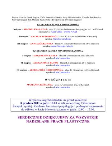 Jury w składzie: Jacek Rogala, Zofia Zamojska-Pabich, Jerzy Mikuśkiewicz, Urszula Sokołowska, Justyna Mroczek-Gil, Monika Rudkowska i Iwona Musik przyznało nagrody: KATEGORIA SZKOŁA PODSTAWOWA I miejsce - MAGDALENA ŁATAŚ - klasa III, Szkoła Podstawowa Integracyjna nr 11 w Kielcach opiekunowie Anna Urban i Dorota Nowak II miejsce - NATALIA JUSZKIEWICZ - klasa V, Szkoła Podstawowa w Łukowej opiekun Stanisława Żądecka III miejsce - ANNA ZIÓŁKOWSKA - klasa IV, Szkoła Podstawowa nr 24 w Kielcach opiekun Anna Gierczak - Macek KATEGORIA SZKOŁA PONADPODSTAWOWA I miejsce - MAGDALENA KRALA - klasa II, Gimnazjum nr 23 w Kielcach opiekun Lidia Laskowska II miejsce - ALEKSANDRA BAWÓŁ - klasa II, Gimnazjum nr 23 w Kielcach opiekun Lidia Laskowska III miejsce - ALEKSANDRA GROCHOWSKA - klasa II, Gimnazjum nr 23 w Kielcach opiekun Lidia Laskowska WYRÓŻNIENIE MARIANNA RÓŻALSKA - klasa II, Gimnazjum nr 23 w Kielcach opiekun Lidia Laskowska Wręczenie nagród odbędzie się przed koncertem 8 grudnia 2011 o godz. 18.00 w sali koncertowej Filharmonii Świętokrzyskiej. Każdemu laureatowi przysługuje 1 podwójne zaproszenie do odbioru w kasie biletowej czynnej w godz. 10.00 – 17.00. SERDECZNIE DZIĘKUJEMY ZA WSZYSTKIE NADESŁANE PRACE PLASTYCZNE