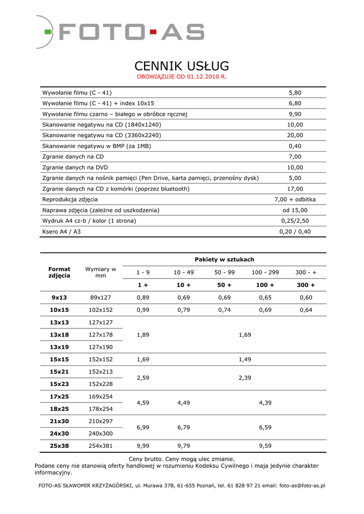 CENNIK USŁUG OBOWIĄZUJE OD 01.12.2010 R. Wywołanie filmu (C - 41) 5,80 Wywołanie filmu (C - 41) + index 10x15 6,80 Wywołanie filmu czarno – białego w obróbce ręcznej 9,90 Skanowanie negatywu na CD (1840x1240) 10,00 Skanowanie negatywu na CD (3360x2240) 20,00 Skanowanie negatywu w BMP (za 1MB) 0,40 Zgranie danych na CD 7,00 Zgranie danych na DVD 10,00 Zgranie danych na nośnik pamięci (Pen Drive, karta pamięci, przenośny dysk) 5,00 Zgranie danych na CD z komórki (poprzez bluetooth) 17,00 Reprodukcja zdjęcia 7,00 + odbitka Naprawa zdjęcia (zależne od uszkodzenia) od 15,00 Wydruk A4 cz-b / kolor (1 strona) 0,25/2,50 Ksero A4 / A3 0,20 / 0,40 Pakiety w sztukach Format zdjęcia Wymiary w mm 1-9 10 - 49 50 - 99 100 - 299 300 - + 1+ 10 + 50 + 100 + 300 + 9x13 89x127 0,89 0,69 0,69 0,65 0,60 10x15 102x152 0,99 0,79 0,74 0,69 0,64 13x13 127x127 13x18 127x178 13x19 127x190 15x15 152x152 15x21 152x213 15x23 152x228 17x25 169x254 18x25 178x254 21x30 210x297 24x30 240x300 25x38 254x381 1,89 1,69 1,69 1,49 2,59 2,39 4,59 4,49 4,39 6,99 6,79 6,59 9,99 9,79 9,59 Ceny brutto. Ceny mogą ulec zmianie. Podane ceny nie stanowią oferty handlowej w rozumieniu Kodeksu Cywilnego i maja jedynie charakter informacyjny. FOTO-AS SŁAWOMIR KRZYŻAGÓRSKI, ul. Murawa 37B, 61-655 Poznań, tel. 61 828 97 21 email: [email protected] Rodzaj zdjęcia Ilość Cena Dowód, prawo jazdy, legitymacja wykonane na miejscu (35x45 mm) 6 20,00 Dowód, prawo jazdy, legitymacja wykonane z nośnika (35x45 mm) 6 15,00 Dowód, prawo jazdy, legitymacja wykonane ze zdjęcia (35x45 mm) 6 27,00 Paszport biometryczny (35x45 mm) 4 25,00 Maturalne (37x52 mm) 4 20,00 1 kpl. 25,00 Dyplom wykonany na miejscu (45x65 mm) 6 30,00 Dyplom wykonany z nośnika cyfrowego (45x65 mm) 6 25,00 Elektroniczna wiza USA (1 CD + 1 zdjęcie 50x50 mm) Na zamówienie możliwe także inne formaty wg podanych kryteriów. Powiększenia wielkoformatowe Papier Laminowanie folią Papier mat połysk / mat mat plus pianka 5 mm (max szer. 106 cm) (max szer. 106 cm) (max szer. 62 cm) Format zdjęcia Powierzchnia w m2 30x30 0,090 12,60 7,20 23,67 30x40 0,120 16,80 9,60 31,56 30x45 0,135 18,90 10,80 35,50 40x40 0,160 22,40 12,80 42,08 40x50 0,200 28,00 16,00 52,60 40x60 0,240 33,60 19,20 63,12 50x50 0,250 35,00 20,00 65,75 50x60 0,300 42,00 24,00 78,90 50x70 0,350 49,00 28,00 92,05 60x60 0,360 50,40 28,80 94,68 60x80 0,480 67,20 38,40 126,24 60x90 0,540 75,60 43,20 142,02 70x100 0,700 98,00 56,00 - m kw 1,000 140,00 80,00 263,00 Ceny brutto. Ceny mogą ulec zmianie. Podane ceny nie stanowią oferty handlowej w rozumieniu Kodeksu Cywilnego i maja jedynie charakter informacyjny. FOTO-AS SŁAWOMIR KRZYŻAGÓRSKI, ul. Murawa 37B, 61-655 Poznań, tel. 61 828 97 21 email: [email protected] Płótno ze zdjęcia naciągnięte na krosno i pokryte werniksem zabezpieczającym Rozmiar płótna Cena 20x30 45,90 24x30 52,00 30x30 57,03 30x40 66,78 30x45 71,65 40x50 98,00 40x60 117,53 50x60 134,78 50x70 156,53 60x80 180,00 Na zamówienie możliwe także inne formaty Fotogadżety z wykorzystaniem zdjęć Nazwa Cena Fotokalendarz wiszący mały (17x25 cm) – 12 stron + 1 okładka 33,00 Fotokalendarz wiszący duży (25x38 cm) – 12 stron +1 okładka 60,00 Fotokalendarz biurkowy poziomy (17x25 cm) – 12 stron + okładka 37,00 Fotopodkładka ze zdjęciem (19x24 cm) 20,00 Fotomages (ok. 13x18) od 7,00 Fotokubek (zadruk 9,5x21 cm) 24,90 Zegar ze zdjęciem (pion i poziom od 25x38 cm) 36,60 Ceny brutto. Ceny mogą ulec zmianie. Podane ceny nie stanowią oferty handlowej w rozumieniu Kodeksu Cywilnego i maja jedynie charakter informacyjny. FOTO-AS SŁAWOMIR KRZYŻAGÓRSKI, ul. Murawa 37B, 61-655 Poznań, tel. 61 828 97 21 email: [email protected]