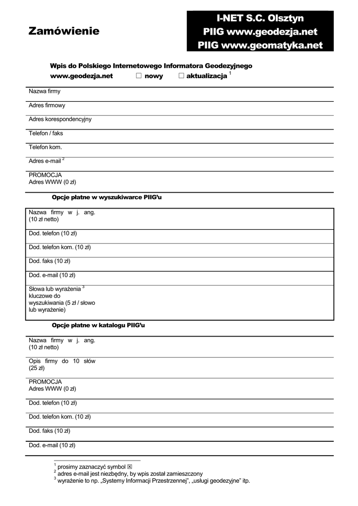 I-NET S.C. Olsztyn PIIG www.geodezja.net PIIG www.geomatyka.net Zamówienie Wpis do Polskiego Internetowego Informatora Geodezyjnego www.geodezja.net nowy aktualizacja 1 Nazwa firmy Adres firmowy Adres korespondencyjny Telefon / faks Telefon kom. Adres e-mail 2 PROMOCJA Adres WWW (0 zł) Opcje płatne w wyszukiwarce PIIG’u Nazwa firmy w j. ang. (10 zł netto) Dod. telefon (10 zł) Dod. telefon kom. (10 zł) Dod. faks (10 zł) Dod. e-mail (10 zł) 3 Słowa lub wyraŜenia kluczowe do wyszukiwania (5 zł / słowo lub wyraŜenie) Opcje płatne w katalogu PIIG’u Nazwa firmy w j. ang. (10 zł netto) Opis firmy do 10 słów (25 zł) PROMOCJA Adres WWW (0 zł) Dod. telefon (10 zł) Dod. telefon kom. (10 zł) Dod. faks (10 zł) Dod. e-mail (10 zł) 1 prosimy zaznaczyć symbol adres e-mail jest niezbędny, by wpis został zamieszczony 3 wyraŜenie to np. „Systemy Informacji Przestrzennej”, „usługi geodezyjne” itp. 2 Zamówienia moŜna składać w pakietach – proszę zaznaczyć, jeśli są Państwo zainteresowani rozliczeniem powyŜszych wpisów wg specyfikacji pakietu: PAKIET I Cena: 160 zł netto Składają się na niego: • • • • wpis do katalogu i wyszukiwarki PIIG zawierający adres WWW, opis do 7 słów oraz 10 słów kluczowych banner na głównej stronie PIIGu umieszczony przez 2 miesiące roczny abonament na konto e-mail, 100 MB pojemności, domena geodezja.pl, ochrona antywirusowa, antyspam wraz z dostępem przez WWW i WAP zgłoszenie Państwa strony do 300 światowych wyszukiwarek i katalogów PAKIET II Cena: 115 zł netto Składają się na niego: • • • wpis do katalogu i wyszukiwarki PIIG zawierający adres WWW, opis do 10 słów oraz 10 słów kluczowych banner na głównej stronie PIIGu umieszczony przez 2 miesiące zgłoszenie Państwa strony do 300 światowych wyszukiwarek PAKIET I Cena: 30 zł netto To : • wpis do katalogu i wyszukiwarki PIIG zawierający adres WWW, opis do 10 słów oraz 10 słów kluczowych 4 Oświadczamy, Ŝe jesteśmy / nie jesteśmy płatnikiem podatku VAT i upowaŜniamy firmę I-NET S.C. Artur Janowski i Jakub Szulwic z siedzibą w Olsztynie przy ul. Kołobrzeskiej 14b lok. 90, NIP 739-32-26-181, do wystawienia faktury VAT bez naszego podpisu. Oświadczenie niniejsze jest waŜne w bieŜącym roku kalendarzowym. Pieczęć firmowa lub imię i nazwisko osoby fizycznej Podpis osoby upowaŜnionej do złoŜenia zamówienia Zamówienie prosimy przesłać na adres I-NET S.C. ul. Kołobrzeska 14b lok.90, 10-443 Olsztyn, faks 0-58 7 421 871, 0-89 6 790 366, faks GSM 0-609 571 570 lub mail [email protected]. Po otrzymaniu zamówienia, skontaktujemy się z Państwem w celu ustalenia szczegółów realizacji Wpisy zawierające opcje płatne dodawane są w trybie ekspresowym bez dopłaty. Wpisy bez opcji płatnych są dodawane w ciągu 2 tygodni bez dopłaty, a ekspresowo – w ciągu 24 godzin – po dopłacie 15 zł. Do cen naleŜy doliczyć 22% VAT. 4 niepotrzebne informacje prosimy skreślić śyczenia, uwagi Uwagi, Ŝyczenia, informacje dodatkowe: I-NET S.C. Olsztyn