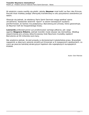Transfer Neymara niemożliwy? PSGFC.pl - Polskie centrum kibiców Paris Saint-Germain - News W ostatnim czasie nasiliły się plotki, jakoby Neymar miał trafić na Parc des Princes. Paryski klub miałoby podjąć ofensywę transferową w celu pozyskania zawodnika już latem. Okazuje się jednak, że włodarzy Paris Saint Germain mogą spotkać spore utrudnienia. Kataloński dziennik "Sport" w swoim dzisiejszym wydaniu poinformował, że Santos ma podpisaną z Barceloną pre-umowę, która gwarantuje, że Neymar trafi do hiszpańskiego klubu. Leonardo próbował ponoć już przekonywać samego piłkarza, jak i jego agenta Wagnera Ribeiro, jednak transfer może okazać się niemożliwy. Według wspomnianej pre-umowy dotychczasowy klub Neymara musiałby zapłacić Barcelonie aż 40 milionów euro kary. Nie wiadomo jednak, ile jest prawdy w doniesieniach katalońskiej prasy. Brazylijski napastnik w obecnym sezonie strzelił już 8 bramek w 9 rozegranych spotkaniach, co czyni go jeszcze bardziej atrakcyjnym kąskiem dla największych europejskich klubów. Autor: Don Patrizio 1/1 Powered by TCPDF (www.tcpdf.org)