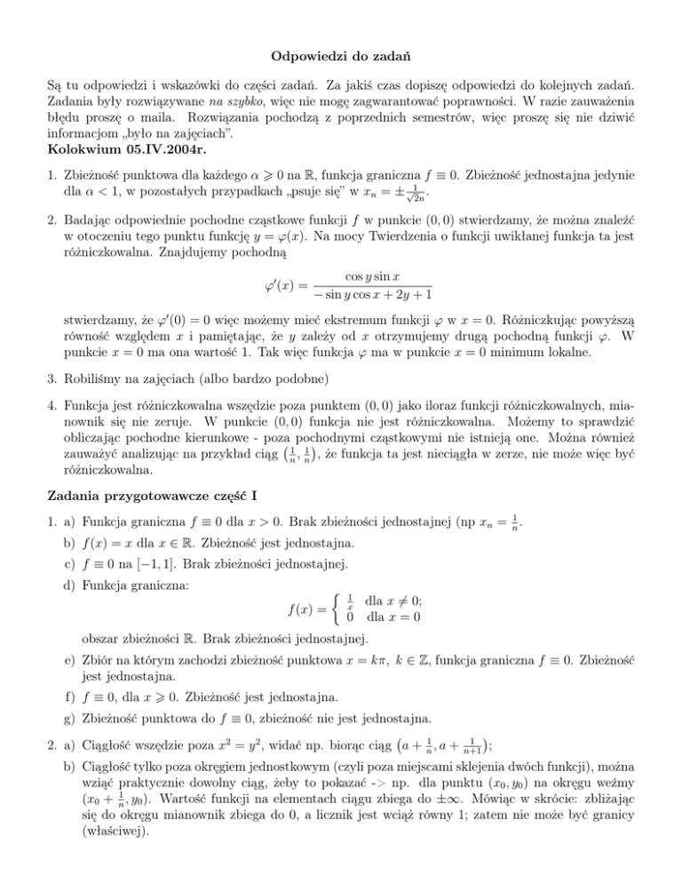 1. a) Funkcja graniczna f ≡ 0 dla x > 0. Brak zbieżności jednostajnej (np xn = n1 .