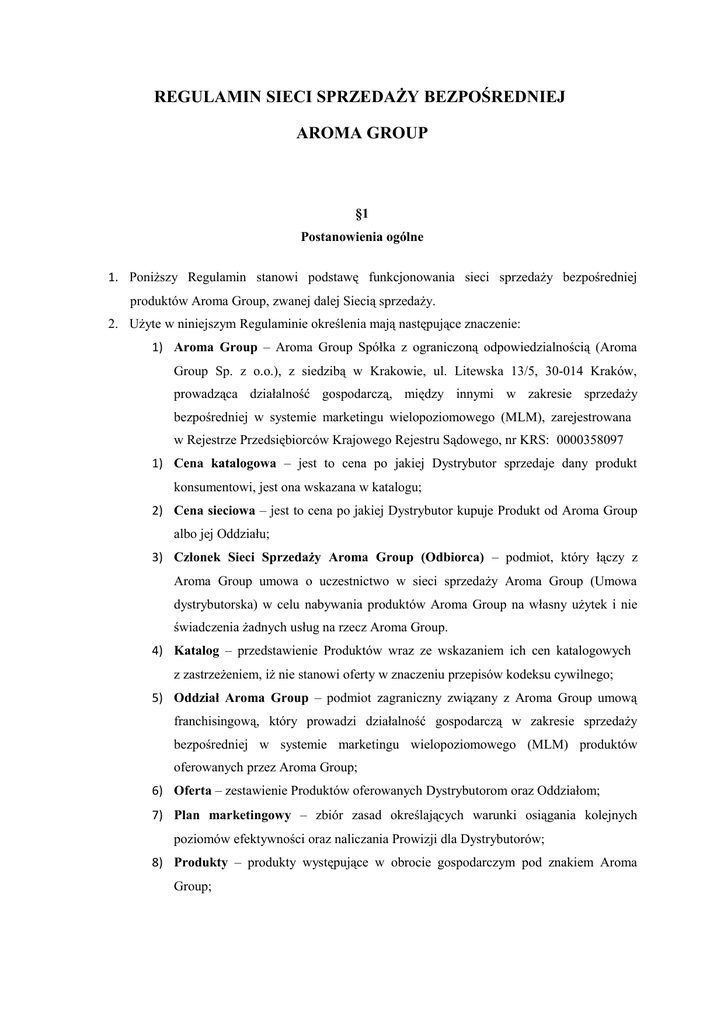 REGULAMIN SIECI SPRZEDAŻY BEZPOŚREDNIEJ AROMA GROUP §1 Postanowienia ogólne 1. Poniższy Regulamin stanowi podstawę funkcjonowania sieci sprzedaży bezpośredniej produktów Aroma Group, zwanej dalej Siecią sprzedaży. 2. Użyte w niniejszym Regulaminie określenia mają następujące znaczenie: 1) Aroma Group – Aroma Group Spółka z ograniczoną odpowiedzialnością (Aroma Group Sp. z o.o.), z siedzibą w Krakowie, ul. Litewska 13/5, 30-014 Kraków, prowadząca działalność gospodarczą, między innymi w zakresie sprzedaży bezpośredniej w systemie marketingu wielopoziomowego (MLM), zarejestrowana w Rejestrze Przedsiębiorców Krajowego Rejestru Sądowego, nr KRS: 0000358097 1) Cena katalogowa – jest to cena po jakiej Dystrybutor sprzedaje dany produkt konsumentowi, jest ona wskazana w katalogu; 2) Cena sieciowa – jest to cena po jakiej Dystrybutor kupuje Produkt od Aroma Group albo jej Oddziału; 3) Członek Sieci Sprzedaży Aroma Group (Odbiorca) – podmiot, który łączy z Aroma Group umowa o uczestnictwo w sieci sprzedaży Aroma Group (Umowa dystrybutorska) w celu nabywania produktów Aroma Group na własny użytek i nie świadczenia żadnych usług na rzecz Aroma Group. 4) Katalog – przedstawienie Produktów wraz ze wskazaniem ich cen katalogowych z zastrzeżeniem, iż nie stanowi oferty w znaczeniu przepisów kodeksu cywilnego; 5) Oddział Aroma Group – podmiot zagraniczny związany z Aroma Group umową franchisingową, który prowadzi działalność gospodarczą w zakresie sprzedaży bezpośredniej w systemie marketingu wielopoziomowego (MLM) produktów oferowanych przez Aroma Group; 6) Oferta – zestawienie Produktów oferowanych Dystrybutorom oraz Oddziałom; 7) Plan marketingowy – zbiór zasad określających warunki osiągania kolejnych poziomów efektywności oraz naliczania Prowizji dla Dystrybutorów; 8) Produkty – produkty występujące w obrocie gospodarczym pod znakiem Aroma Group; 9) Prowizja – kwota przysługująca Dystrybutorowi z tytułu uzyskania określonego Planem marketingowym, poziomu efektywności, może zostać przyznana w postaci rabatu na Produkty albo wynagrodzenia; 10) Regulamin – niniejszy Regulamin Sieci sprzedaży; 11) Sponsor – Dystrybutor, który zarekomendował kandydata na przyszłego Dystrybutora; 12) Dystrybutor – podmiot związany ze spółką Aroma Group albo jej oddziałem, umową o uczestnictwo w Sieci sprzedaży o statusie innym niż odbiorca; 13) Zestaw startowy – zestaw próbek Produktów znajdujących się w Ofercie wraz z materiałami szkoleniowymi i reklamowymi. §2 Przystąpienie do Sieci sprzedaży 1. Dystrybutorem w Sieci sprzedaży może być: a) osoba fizyczna, posiadająca pełną zdolność do czynności prawnych, w tym osoba fizyczna prowadząca indywidualną działalność gospodarczą, b) osoba prawna, c) osoba będąca wspólnikiem spółki z ograniczoną odpowiedzialnością, wykonująca działalność gospodarczą w oparciu o dzierżawę zorganizowanej części przedsiębiorstwa, która zostanie zarekomendowana przez uczestniczącego w Sieci sprzedaży sponsora. 2. Zarekomendowany kandydat na dystrybutora zawiera umowę o uczestnictwo w Sieci sprzedaży. 3. Kandydat zostaje uczestnikiem Sieci sprzedaży (Dystrybutorem) z chwilą otrzymania podpisanej przez przedstawiciela Sieci sprzedaży umowy uczestnictwa w sieci sprzedaży oraz dokonania zakupu zestawu startowego i wprowadzenia danych Kandydata do informatycznego systemu ewidencji Dystrybutorów. §3 Prawa i obowiązki Dystrybutorów 1. Dystrybutor ma obowiązek aktualizacji danych zawartych w umowie uczestnictwa w Sieci sprzedaży za każdym razem, gdy wystąpią w nich zmiany. 2. Każdy dystrybutor może posiadać tylko jeden numer ID w bazie dystrybutorów Sieci sprzedaży. W przypadku zawarcia umowy o przekazaniu praw i obowiązków dystrybutora, dystrybutor przyjmujący kontynuuje pracę wyłącznie pod numerem ID przejętym od ustępującego dystrybutora. 3. Dystrybutorzy pozostający w związku małżeńskim, wspólnicy spółki osobowej oraz spółki cywilnej prowadzącej działalność gospodarczą obejmującą sprzedaż bezpośrednią produktów oferowanych przez sieć sprzedaży Aroma Group, mogą otrzymać jeden wspólny numer ID po złożeniu wniosku w przedmiotowym zakresie. 4. Prawa Dystrybutora nie przechodzą na osoby trzecie i nie mogą być przekazywane ani przenoszone na osoby trzecie, z wyłączeniem przypadków gdy stroną takiej czynności jest: a) współmałżonek, b) wspólnik spółki osobowej, c) wspólnik spółki cywilnej. 5. Wspólnik spółki osobowej lub wspólnik spółki cywilnej, który został zgłoszony jako prowadzący wspólną działalność jako Dystrybutor Sieci sprzedaży, może kontynuować samodzielną działalność, jeśli dotychczasowy Dystrybutor rozwiązał umowę uczestnictwa w Sieci sprzedaży albo zmarł. 6. Dystrybutor może za zgodą Aroma Group wprowadzić na swoje miejsce w Sieci sprzedaży dowolną pełnoletnią osobę fizyczną, na podstawie pisemnej umowy o przekazaniu praw i obowiązków ustępującego Dystrybutora, przy czym osobą wprowadzoną na miejsce ustępującego Dystrybutora nie może być osoba uprzednio pozbawiona praw Dystrybutora za naruszenie zasad niniejszego regulaminu albo spółka prawa handlowego powstała w wyniku połączenia lub przekształcenia osoby prawnej mającej status Dystrybutora. 7. W przypadku zmiany formy działalności przez osobę fizyczną lub osobę prawną mającą status Dystrybutora, może ona prowadzić dalszą działalność jako Dystrybutor pod dotychczasowym numerem ID. §4 Zasady i warunki działalności 1. Zasady ustalania punktów przysługujących Dystrybutorowi za wyniki sprzedaży poszczególnych Produktów oraz przysługujące za to rabaty albo wynagrodzenie określa Plan marketingowy. 2. Dystrybutor będący osobą fizyczną, nie prowadzący na własny rachunek działalności gospodarczej polegającej na sprzedaży bezpoś