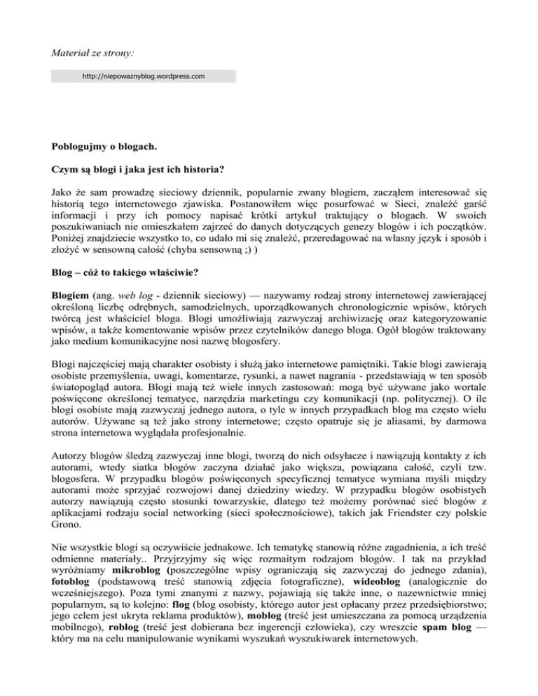 Materiał ze strony: http://niepowaznyblog.wordpress.com Poblogujmy o blogach. Czym są blogi i jaka jest ich historia? Jako że sam prowadzę sieciowy dziennik, popularnie zwany blogiem, zacząłem interesować się historią tego internetowego zjawiska. Postanowiłem więc posurfować w Sieci, znaleźć garść informacji i przy ich pomocy napisać krótki artykuł traktujący o blogach. W swoich poszukiwaniach nie omieszkałem zajrzeć do danych dotyczących genezy blogów i ich początków. Poniżej znajdziecie wszystko to, co udało mi się znaleźć, przeredagować na własny język i sposób i złożyć w sensowną całość (chyba sensowną ;) ) Blog – cóż to takiego właściwie? Blogiem (ang. web log - dziennik sieciowy) — nazywamy rodzaj strony internetowej zawierającej określoną liczbę odrębnych, samodzielnych, uporządkowanych chronologicznie wpisów, których twórcą jest właściciel bloga. Blogi umożliwiają zazwyczaj archiwizację oraz kategoryzowanie wpisów, a także komentowanie wpisów przez czytelników danego bloga. Ogół blogów traktowany jako medium komunikacyjne nosi nazwę blogosfery. Blogi najczęściej mają charakter osobisty i służą jako internetowe pamiętniki. Takie blogi zawierają osobiste przemyślenia, uwagi, komentarze, rysunki, a nawet nagrania - przedstawiają w ten sposób światopogląd autora. Blogi mają też wiele innych zastosowań: mogą być używane jako wortale poświęcone określonej tematyce, narzędzia marketingu czy komunikacji (np. politycznej). O ile blogi osobiste mają zazwyczaj jednego autora, o tyle w innych przypadkach blog ma często wielu autorów. Używane są też jako strony internetowe; często opatruje się je aliasami, by darmowa strona internetowa wyglądała profesjonalnie. Autorzy blogów śledzą zazwyczaj inne blogi, tworzą do nich odsyłacze i nawiązują kontakty z ich autorami, wtedy siatka blogów zaczyna działać jako większa, powiązana całość, czyli tzw. blogosfera. W przypadku blogów poświęconych specyficznej tematyce wymiana myśli między autorami może sprzyjać rozwojowi danej dziedziny wiedzy. W przypadku blogów osobistych autorzy nawiązują często stosunki towarzyskie, dlatego też możemy porównać sieć blogów z aplikacjami rodzaju social networking (sieci społecznościowe), takich jak Friendster czy polskie Grono. Nie wszystkie blogi są oczywiście jednakowe. Ich tematykę stanowią różne zagadnienia, a ich treść odmienne materiały.. Przyjrzyjmy się więc rozmaitym rodzajom blogów. I tak na przykład wyróżniamy mikroblog (poszczególne wpisy ograniczają się zazwyczaj do jednego zdania), fotoblog (podstawową treść stanowią zdjęcia fotograficzne), wideoblog (analogicznie do wcześniejszego). Poza tymi znanymi z nazwy, pojawiają się także inne, o nazewnictwie mniej popularnym, są to kolejno: flog (blog osobisty, którego autor jest opłacany przez przedsiębiorstwo; jego celem jest ukryta reklama produktów), moblog (treść jest umieszczana za pomocą urządzenia mobilnego), roblog (treść jest dobierana bez ingerencji człowieka), czy wreszcie spam blog — który ma na celu manipulowanie wynikami wyszukań wyszukiwarek internetowych. Pingbacki, trackbacki, blogrolle... - o co chodzi w tej blogosferze? Wraz z rozwojem blogów i narzędzi udostępnianych tworzącym je osobom, narodziło się pojęcie blogosfery. Terminu "blogosfera" po raz pierwszy użył (w formie żartu) Brad L. Graham, 10 września 1999r. Określenie to jest wiązane ze słowem "logosphere", który od gr. "logos" (słowo) oznacza "świat słów", "świat dyskusji". Jego powszechne użycie datuje się od 2002. Blogosfera (ang. blogosphere), termin określający wszystkie blogi jako społeczność lub sieć społeczną. Wiele blogów jest połączonych między sobą, tworząc swego rodzaju „pajęczynę” powiązań. Autorzy jednych blogów czytają inne, zostawiają komentarze do wpisów innych osób, umieszczają do nich linki, odnoszą się też w treści wpisów. Tak połączone blogi wytworzyły własną kulturę. Podczas gdy blogi jako takie, pozostają wciąż formą publikacji - blogosfera jest zjawiskiem społecznym i jak inne podlegającym badaniom socjologicznym. Jednak aby powstanie blogosfery było możliwe, potrzebne są wyżej wspomniane połączenia pomiędzy poszczególnymi stronami w Sieci. Te zaś można utworzyć wykorzystując odpowiednie narzędzia. Omówię teraz krótko najważniejsze z nich. Pierwszym narzędziem, które nasuwa się na myśl, to oczywiście system komentarzy. Możliwość pozostawiania komentarzy to funkcja, którą oferują praktycznie wszystkie systemy blogowe. Tylko niektórzy autorzy z niej rezygnują. Komentarze można śledzić za pomocą RSS lub wyspecjalizowanych serwisów takich jak choćby co.mments.com Inną przydatną funkcją są trackbacki. Jest to narzędzie umożliwiające cytowanie w blogosferze. Trackback ułatwia pozostawienie w komentarzach do danego artykułu informacji o nawiązaniu do niego gdzie indziej, najczęściej na innym blogu. Kolejnym narzędziem jest tzw. blogroll, z którego nie wszyscy korzystają, aczkolwiek myślę, że jest on funkcją przydatną i ciekawą. Angielski termin blogroll oznacza listę linków do innych blogów. Autorzy często umieszczają w blogrollach linki do blogów, które cieszą się ich własnym zainteresowaniem i uwagą, inni – linkują do blogów które polecają ich własne, dzieje się to na zasadzie wzajemności. Linki z innych blogów mają duże znaczenie w określaniu wskaźnika PageRank, a tym samym pozycji bloga w wyszukiwarce Google, a jak wiadomo, wyższa pozycja w wyszukiwarce to marzenia każdego autora. Zatem: im więcej osób do nas linkuje, tym lepiej dla naszego bloga. Warto również wspomnieć o agregatorach, które korzystają z technologii pingbacków. Wyjaśnijmy te dwa pojęcia. Publikacja nowego wpisu na blogu powoduje wysłanie tzw. pinga do serwisu