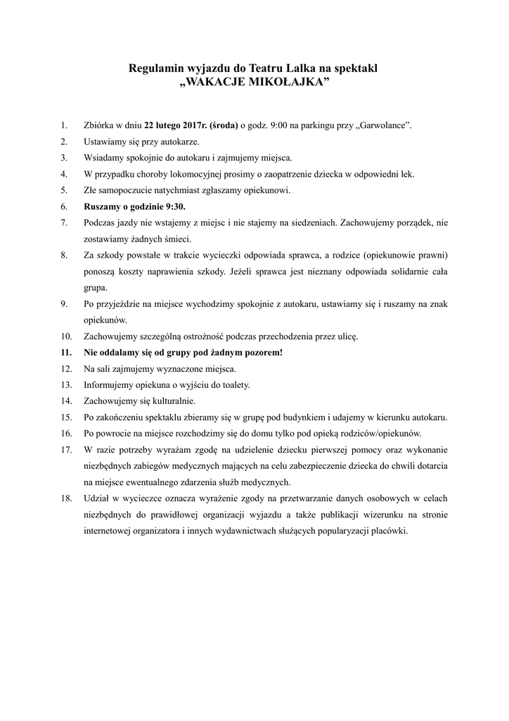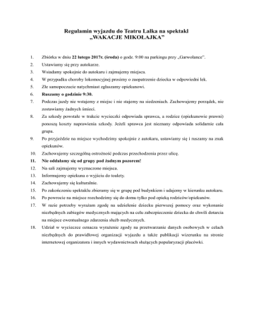 Regulamin wyjazdu do Teatru Lalka na spektakl „WAKACJE MIKOŁAJKA” 1. Zbiórka w dniu 22 lutego 2017r. (środa) o godz. 9:00 na parkingu przy „Garwolance”. 2. Ustawiamy się przy autokarze. 3. Wsiadamy spokojnie do autokaru i zajmujemy miejsca. 4. W przypadku choroby lokomocyjnej prosimy o zaopatrzenie dziecka w odpowiedni lek. 5. Złe samopoczucie natychmiast zgłaszamy opiekunowi. 6. Ruszamy o godzinie 9:30. 7. Podczas jazdy nie wstajemy z miejsc i nie stajemy na siedzeniach. Zachowujemy porządek, nie zostawiamy żadnych śmieci. 8. Za szkody powstałe w trakcie wycieczki odpowiada sprawca, a rodzice (opiekunowie prawni) ponoszą koszty naprawienia szkody. Jeżeli sprawca jest nieznany odpowiada solidarnie cała grupa. 9. Po przyjeździe na miejsce wychodzimy spokojnie z autokaru, ustawiamy się i ruszamy na znak opiekunów. 10. Zachowujemy szczególną ostrożność podczas przechodzenia przez ulicę. 11. Nie oddalamy się od grupy pod żadnym pozorem! 12. Na sali zajmujemy wyznaczone miejsca. 13. Informujemy opiekuna o wyjściu do toalety. 14. Zachowujemy się kulturalnie. 15. Po zakończeniu spektaklu zbieramy się w grupę pod budynkiem i udajemy w kierunku autokaru. 16. Po powrocie na miejsce rozchodzimy się do domu tylko pod opieką rodziców/opiekunów. 17. W razie potrzeby wyrażam zgodę na udzielenie dziecku pierwszej pomocy oraz wykonanie niezbędnych zabiegów medycznych mających na celu zabezpieczenie dziecka do chwili dotarcia na miejsce ewentualnego zdarzenia służb medycznych. 18. Udział w wycieczce oznacza wyrażenie zgody na przetwarzanie danych osobowych w celach niezbędnych do prawidłowej organizacji wyjazdu a także publikacji wizerunku na stronie internetowej organizatora i innych wydawnictwach służących popularyzacji placówki. OŚWIADCZENIE RODZICÓW/OPIEKUNÓW 1. Wyrażam zgodę na udział mojego dziecka ………………………………………………… lat ….. w wycieczce do Warszawy do Teatru Lalka na spektakl „Wakacje Mikołajka” organizowanej przez Centrum Sportu i Kultury w Garwolinie, która odbędzie się w dniu 22 lutego 2017 r. 2. Zobowiązuję się do zapewnienia bezpieczeństwa mojemu dziecku w drodze pomiędzy domem a miejscem zbiórki i rozwiązaniem wycieczki. 3. Oświadczam, w wycieczce. że moje dziecko nie ma przeciwwskazań zdrowotnych do udziału 4. Wyrażam zgodę na pokrycie ewentualnych szkód wyrządzonych przez moje dziecko w trakcie trwania wycieczki. 5. Oświadczam, że zapoznałem (-am) się z Regulaminem Wycieczki i akceptuję wszystkie warunki tego Regulaminu. 6. Wyrażam zgodę na otrzymywanie informacji o ofercie Centrum Sportu i Kultury w Garwolinie drogą elektroniczną/sms. (e-mail)……………………...………………………………….………….. (tel.)………………………. ………………………….. miejscowość i data ….….…...………….……………… podpis rodzica/prawnego opiekuna OŚWIADCZENIE RODZICÓW/OPIEKUNÓW 1. Wyrażam zgodę na udział mojego dziecka ……………………………………….…….…… lat …... w wycieczce do Warszawy do Teatru Lalka na spektakl „Wakacje Mikołajka” organizowanej przez Centrum Sportu i Kultury w Garwolinie, która odbędzie się w dniu 22 lutego 2017 r. 2. Zobowiązuję się do zapewnienia bezpieczeństwa mojemu dziecku w drodze pomiędzy domem a miejscem zbiórki i rozwiązaniem wycieczki. 3. Oświadczam, w wycieczce. że moje dziecko nie ma przeciwwskazań zdrowotnych do udziału 4. Wyrażam zgodę na pokrycie ewentualnych szkód wyrządzonych przez moje dziecko w trakcie trwania wycieczki. 5. Oświadczam, że zapoznałem (-am) się z Regulaminem Wycieczki i akceptuję wszystkie warunki tego Regulaminu. 6. Wyrażam zgodę na otrzymywanie informacji o ofercie Centrum Sportu i Kultury w Garwolinie drogą elektroniczną/sms. (e-mail)……………………...………………………………………….…. (tel.)………………………. ………………………….. miejscowość i data …………….................…………….. podpis rodzica/prawnego opiekuna