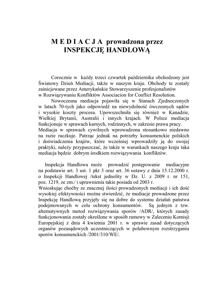 M E D I A C J A prowadzona przez INSPEKCJĘ HANDLOWĄ Corocznie w każdy trzeci czwartek października obchodzony jest Światowy Dzień Mediacji, także w naszym kraju. Obchody te zostały zainicjowane przez Amerykańskie Stowarzyszenie profesjonalistów w Rozwiązywaniu Konfliktów Associacion for Conflict Resolution. Nowoczesna mediacja pojawiła się w Stanach Zjednoczonych w latach 70-tych jako odpowiedź na niewydolność ówczesnych sądów i wysokie koszty procesu. Upowszechniła się również w Kanadzie, Wielkiej Brytanii, Australii i innych krajach. W Polsce mediacja funkcjonuje w sprawach karnych, rodzinnych, w zakresie prawa pracy. Mediacja w sprawach cywilnych wprowadzona stosunkowo niedawno na razie raczkuje. Patrząc jednak na potrzeby konsumenckie polskich i doświadczenia krajów, które wcześniej wprowadziły ją do swojej praktyki, należy przypuszczać, że także w warunkach naszego kraju taka mediacja będzie dobrym środkiem rozwiązywania konfliktów. Inspekcja Handlowa może prowadzić postępowanie mediacyjne na podstawie art. 3 ust. 1 pkt 3 oraz art. 36 ustawy z dnia 15.12.2000 r. o Inspekcji Handlowej /tekst jednolity w Dz. U. z 2009 r. nr 151, poz. 1219, ze zm./ i uprawnienia takie posiada od 2003 r. Wnioskując choćby ze znacznej ilości prowadzonych mediacji i ich dość wysokiej efektywności można stwierdzić, że mediacje prowadzone przez Inspekcję Handlową przyjęły się na dobre do systemu działań państwa podejmowanych w celu ochrony konsumentów. Są jednym z tzw. alternatywnych metod rozwiązywania sporów /ADR/, których zasady funkcjonowania zostały określone w sposób ramowy w Zaleceniu Komisji Europejskiej z dnia 4 kwietnia 2001 r. w sprawie zasad dotyczących organów pozasądowych uczestniczących w polubownym rozstrzyganiu sporów konsumenckich /2001/310/WE/. 1. Czym jest mediacja? Zgodnie z definicją określoną przez Społeczną Radę ds. Alternatywnych Metod Rozwiązywania konfliktów i Sporów przy Ministrze Sprawiedliwości „przez mediację rozumie się dobrowolny i poufny proces, w którym fachowo przygotowana, niezależna i bezstronna osoba, za zgodą stron, pomaga im poradzić sobie z konfliktem. Mediacja pozwala jej uczestnikom określić kwestie sporne, zmniejszyć bariery komunikacyjne, opracować propozycje rozwiązań i, jeśli jest taka wola stron, zawrzeć wzajemnie satysfakcjonujące porozumienie. 2. W jakich sprawach Inspekcja Handlowa może wszcząć postępowanie mediacyjne? Inspekcja Handlowa ma kompetencje do prowadzenia mediacji w zakresie sporów cywilnoprawnych powstałych między konsumentem, a przedsiębiorcą, np. na tle sposobu załatwienia reklamacji towaru lub usługi przez przedsiębiorcę. Inspekcja Handlowa nie posiada uprawnień do wszczynania mediacji w sporach między osobami fizycznymi /obie strony sporu są osobami prywatnymi/ lub w sporach między przedsiębiorcami. W takich wypadkach zainteresowani mogą dochodzić swoich roszczeń wyłącznie na drodze sądowej. W ustawie o Inspekcji Handlowej zamieszczono zapisy wyłączające dodatkowo stosowanie przepisów tej ustawy /nie można prowadzić mediacji/ w sprawach dotyczących: -banków oraz prowadzonej przez nie działalności bankowej, -ubezpieczeń i działalności ubezpieczeniowej, -usług pocztowych i telekomunikacyjnych, -usług pośrednictwa finansowego, - usług informatycznych, - usług naukowo-badawczych, - usług w zakresie edukacji, - usług w zakresie ochrony zdrowia i opieki społecznej, - nawozów i środków wspomagających uprawę roślin -przedsiębiorców produkujących energię elektryczną lub prowadzących hurtowy i detaliczny handel energią, -przedsiębiorców produkujących paliwa, -przedsiębiorców działających na terenach zamkniętych, podlegających ministrowi właściwemu do spraw wewnętrznych, Ministrowi Obrony Narodowej i Ministrowi Sprawiedliwości. W tego rodzaju sprawach konsument może zwrócić się o pomoc do miejscowego powiatowego /miejskiego/ rzecznika konsumentów, organizacji konsumenckich, np. Federacja Konsumentów, lub w poszczególnych dziedzinach do rzecznika ubezpieczonych, bankowego arbitra konsumenckiego, rzecznika praw pacjenta, rzecznika odbiorców energii elektrycznej. 3. Jakie są ogólne warunki wszczęcia postępowania mediacyjnego przez Wojewódzkiego Inspektora Inspekcji Handlowej? Wojewódzki Inspektor Inspekcji Handlowej podejmuje działania mediacyjne, jeżeli przemawia za tym charakter sprawy. Postępowanie mediacyjne jest wszczynane co do reguły na wniosek konsumenta lub z urzędu, jeżeli wymaga tego ochrona interesu konsumenta /o wiele rzadziej/. 4. Gdzie można otrzymać formularz wniosku o mediację? Formularz wniosku konsumenta o wszczęcie procedury mediacji jest dostępny w siedzibie każdego Wojewódzkiego Inspektoratu Inspekcji Handlowej. Pracownicy Wydziału Ochrony Konsumentów służą konsumentowi pomocą w wypełnieniu takiego wniosku. Do wniosku o mediację należy dołączyć kopie posiadanych dokumentów. W razie braku dokumentów niezbędny będzie skrupulatny opis okoliczności sprawy. Wniosek o wszczęcie procedury mediacji jest dostępny również na stronie internetowej naszego Inspektoratu w Poznaniu www.poznan.wiih.gov.pl pod zakładką: procedura mediacyjna. Na stronie internetowej można znaleźć również statystykę prowadzonych przez Inspektorat mediacji, poradniki dla konsumentów oraz Zalecenie Komisji Europejskiej z dnia 4 kwietnia 2001 r. w sprawie zasad dotyczących organów pozasądowych uczestniczących w polubownym rozstrzyganiu sporów konsumenckich /2001/310/WE/. 5. Czy Inspekcja Handlowa może wydać decyzję administracyjną w sprawie konsumenckiej? Inspekcja Handlowa nie posiada kompetencji do działań władczych, by nakazać w tym zakresie stronom sporu wykonanie określonych działań, lub zaniechań, w tym nakazania przedsiębiorcy uwzględnienia roszczeń zgłoszonych przez konsumentów, nawet w przypadku słuszności tych ros