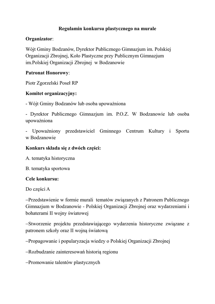 Regulamin konkursu plastycznego na murale Organizator: Wójt Gminy Bodzanów, Dyrektor Publicznego Gimnazjum im. Polskiej Organizacji Zbrojnej, Koło Plastyczne przy Publicznym Gimnazjum im.Polskiej Organizacji Zbrojnej w Bodzanowie Patronat Honorowy: Piotr Zgorzelski Poseł RP Komitet organizacyjny: - Wójt Gminy Bodzanów lub osoba upoważniona - Dyrektor Publicznego Gimnazjum im. P.O.Z. W Bodzanowie lub osoba upoważniona - Upoważniony przedstawiciel Gminnego Centrum Kultury i Sportu w Bodzanowie Konkurs składa się z dwóch części: A. tematyka historyczna B. tematyka sportowa Cele konkursu: Do części A Przedstawienie w formie murali tematów związanych z Patronem Publicznego Gimnazjum w Bodzanowie - Polskiej Organizacji Zbrojnej oraz wydarzeniami i bohaterami II wojny światowej Stworzenie projektu przedstawiającego wydarzenia historyczne związane z patronem szkoły oraz II wojną światową Propagowanie i popularyzacja wiedzy o Polskiej Organizacji Zbrojnej Rozbudzanie zainteresowań historią regionu Promowanie talentów plastycznych Wykonanie i ekspozycja nagrodzonych prac w przestrzeni (mur na terenie gimnazjum) Do części B Przedstawienie w formie murali tematów związanych ze sportem Stworzenie projektu przedstawiającego różne dyscypliny sportowe Rozbudzanie zainteresowań tematyką sportową Promowanie talentów plastycznych Wykonanie i ekspozycja nagrodzonych prac w przestrzeni (mur na terenie gimnazjum) Regulamin konkursu: Udział w konkursie wiąże się z wykonaniem projektu w formie papierowej A3 oraz samodzielnym wykonaniem muralu po wybraniu zwycięzców Uczestnicy konkursu przygotowują projekty muralu w wersji papierowej, które po wyłonieniu zwycięskich prac zostaną przez autorów wykonane na wskazanym murze znajdującym się na terenie Gimnazjum w Bodzanowie Uczestnicy konkursu są autorami i wykonawcami prac Autorami prac mogą być grupy dwu osobowe lub osoby indywidualne Konkurs przeznaczony jest dla następujących grup : a . gimnazjum b. szkoły ponadgimnazjalne c . domy kultury, ogniska plastyczne itp. d. osoby dorosłe Organizatorzy zapewniają niezbędne materiały do wykonania muralu Każdy uczestnik może zgłosić dwie samodzielnie wykonane prace nigdzie wcześniej nie publikowane Prace powinny być nowatorskie i nawiązujące do podanej tematyki: A. Polska Organizacja Zbrojna , bohaterowie i wydarzenia związane z II wojną światową. B. Dyscypliny sportowe Przesłane prace powinny zostać opisane w następujący sposób: a. imię i nazwisko autora projektu b. grupa wiekowa , wiek autora c.. nazwisko opiekuna w przypadku osób niepełnoletnich, oświadczenie opiekuna o przetwarzaniu danych osobowych d. adres do korespondencji, telefon Autorzy prac zakwalifikowanych do realizacji zostaną poinformowani drogą elektroniczną lub pocztą tradycyjną. Autorzy prac zwycięskich i wyróżnionych, przekazują prawa autorskie na rzecz Publicznego Gimnazjum w Bodzanowie. Rozstrzygnięcie konkursu: Komitet organizacyjny dokona wyboru najlepszych projektów w wersji papierowej. Zwycięskie projekty zostaną zrealizowane w formie muralu na terenie gimnazjum w Bodzanowie. Zwycięzcy zostaną nagodzeni i wyróżnieni. Decyzje Komitetu organizacyjnego są ostateczne. Termin składania prac 20 sierpnia 2015 roku (wersja papierowa) Realizacja nagrodzonych projektów 01-14 września 2015 roku Informacje dodatkowe: Wszystkie prace przechodzą na własność Publicznego Gimnazjum im. Polskiej Organizacji Zbrojnej w Bodzanowie. Organizator zastrzega sobie prawo do wykorzystywania prac nagrodzonych. Organizator oświadcza, że wszystkie dane osobowe będą wykorzystane jedynie w celach informacyjnych dotyczących konkursu. Jednocześnie uczestnicy konkursu zgadzają się na przetwarzanie danych osobowych w celach informacyjnych dotyczących konkursu. Opisane prace – wersja papierowa prosimy składać osobiście w Publicznym Gimnazjum im. Polskiej Organizacji Zbrojnej w Bodzanowie (do 30 czerwca lub przesłać odpowiednio zabezpieczone na adres: Publiczne Gimnazjum im. Polskiej Organizacji Zbrojnej w Bodzanowie ul. Wyszogrodzka 3, 09-470 Bodzanów do dnia 20 sierpnia) Opieka merytoryczna i dodatkowe informacje: Jolanta Leszczyńska – nauczyciel Publicznego Gimnazjum w Bodzanowie tel. 24 2607824 Zapraszamy Oświadczenie Wyrażam zgodę na przetwarzanie danych osobowych mojego dziecka ………………………………………………………………………………... (imię i nazwisko) przez Publiczne Gimnazjum im. P.O.Z. w Bodzanowie ul. Wyszogrodzka 3, zgodnie z ustawą z dnia 29 sierpnia 1997 r. o ochronie danych (Dz. U. z 2002r. Nr101, poz. 926, z późniejszymi zmianami). Wyrażam zgodę na nieodpłatne wykorzystanie wizerunku dziecka przez organizatora konkursu, zgodnie z ustawą z dnia 4 lutego 1994 r. o prawie autorskim i prawach pokrewnych na cele związane z promocją konkursu (np. internet). Oświadczam, że zostałem poinformowany o przysługującym mi prawie wglądu do danych, możliwości poprawienia ich, a także usunięcia z bazy danych. ………………………………………………….. data i podpis rodzica (opiekuna) Prawa autorskie – oświadczenie o przekazaniu praw autorskich.