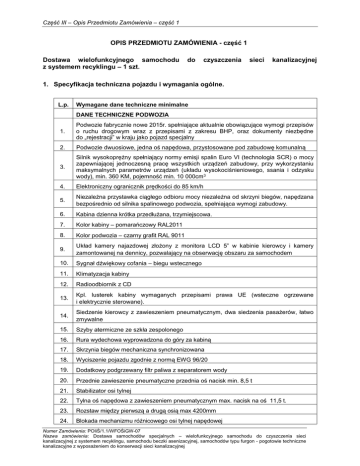 Część III – Opis Przedmiotu Zamówienia – część 1 OPIS PRZEDMIOTU ZAMÓWIENIA - część 1 Dostawa wielofunkcyjnego samochodu z systemem recyklingu – 1 szt. do czyszczenia sieci kanalizacyjnej 1. Specyfikacja techniczna pojazdu i wymagania ogólne. L.p. Wymagane dane techniczne minimalne DANE TECHNICZNE PODWOZIA 1. Podwozie fabrycznie nowe 2015r. spełniające aktualnie obowiązujące wymogi przepisów o ruchu drogowym wraz z przepisami z zakresu BHP, oraz dokumenty niezbędne do „rejestracji” w kraju jako pojazd specjalny 2. Podwozie dwuosiowe, jedna oś napędowa, przystosowane pod zabudowę komunalną 3. Silnik wysokoprężny spełniający normy emisji spalin Euro VI (technologia SCR) o mocy zapewniającej jednoczesną pracę wszystkich urządzeń zabudowy, przy wykorzystaniu maksymalnych parametrów urządzeń (układu wysokociśnieniowego, ssania i odzysku wody), min. 360 KM, pojemność min. 10 000cm3 4. Elektroniczny ogranicznik prędkości do 85 km/h 5. Niezależna przystawka ciągłego odbioru mocy niezależna od skrzyni biegów, napędzana bezpośrednio od silnika spalinowego podwozia, spełniająca wymogi zabudowy. 6. Kabina dzienna krótka przedłużana, trzymiejscowa. 7. Kolor kabiny – pomarańczowy RAL2011 8. Kolor podwozia – czarny grafit RAL 9011 9. Układ kamery najazdowej złożony z monitora LCD 5” w kabinie kierowcy i kamery zamontowanej na dennicy, pozwalający na obserwację obszaru za samochodem 10. Sygnał dźwiękowy cofania – biegu wstecznego 11. Klimatyzacja kabiny 12. Radioodbiornik z CD 13. Kpl. lusterek kabiny wymaganych przepisami prawa UE (wsteczne ogrzewane i elektrycznie sterowane). 14. Siedzenie kierowcy z zawieszeniem pneumatycznym, dwa siedzenia pasażerów, łatwo zmywalne 15. Szyby atermiczne ze szkła zespolonego 16. Rura wydechowa wyprowadzona do góry za kabiną 17. Skrzynia biegów mechaniczna synchronizowana 18. Wyciszenie pojazdu zgodnie z normą EWG 96/20 19. Dodatkowy podgrzewany filtr paliwa z separatorem wody 20. Przednie zawieszenie pneumatyczne przednia oś nacisk min. 8,5 t 21. Stabilizator osi tylnej 22. Tylna oś napędowa z zawieszeniem pneumatycznym max. nacisk na oś 11,5 t. 23. Rozstaw między pierwszą a drugą osią max 4200mm 24. Blokada mechanizmu różnicowego osi tylnej napędowej Numer Zamówienia: POIiŚ/1.1/WFOŚiGW-07 Nazwa zamówienia: Dostawa samochodów specjalnych – wielofunkcyjnego samochodu do czyszczenia sieci kanalizacyjnej z systemem recyklingu, samochodu beczki asenizacyjnej, samochodów typu furgon - pogotowie techniczne kanalizacyjne z wyposażeniem do konserwacji sieci kanalizacyjnej Część III – Opis Przedmiotu Zamówienia – część 1 25. Przełożenie tylnego mostu odpowiednio dobrane do specyfiki pracy samochodu – w terenie zabudowanym 26. Regulacja pilotem wysokości tylnego zawieszenia 27. Hamulce tarczowe osi przedniej i tylnej 28. Układ hamulcowy z systemem ABS, ASR i korektorem siły hamowania 29. Hamulec postojowy pneumatyczny 30. Hamulec silnikowy 31. Wlot powietrza do chłodzenia silnika z góry. 32. Zabezpieczenie boczne, zapobiegające wjechaniu pod pojazd 33. Osuszacz sprężonego powietrza podgrzewany. 34. Układ kierowniczy ze wspomaganiem 35. Koło kierownicy z regulowaną wysokością i pochyleniem 36. Elektroniczna blokada zapłonu – immobilizer 37. Akumulatory 12 V minimum 175 Ah - 2 szt. 38. Mechaniczny wyłącznik akumulatorów poza kabiną kierowcy 39. Zbiornik paliwa min 300 ltr. z zamykanym korkiem zabezpieczonym przed dostępem osób postronnych 40. Oświetlenie zewnętrzne pojazdu zgodne z obowiązującymi przepisami ruchu drogowego 41. Tachograf cyfrowy, posiadający legalizację 42. Wyposażony w lodówkę przez producenta podwozia 43. Instrukcja obsługi nadwozia i podwozia w języku polskim 44. Katalog części zamiennych nadwozia i podwozia, schematy elektryczne, pneumatyczne i hydrauliczne pojazdu wraz z zabudową w języku polskim lub innym EU 45. Lampa ostrzegawcza LED (światło stroboskopowe) koloru żółtego zespolona z napisem WODOCIĄGI nad kabiną pojazdu, 3 szt. światła ostrzegawcze LED (światło stroboskopowe) koloru żółtego zamontowane w tylnej części pojazdu. 46. Koło zapasowe, 2 szt. kliny pod koła, trójkąt, podręczny sprzęt gaśniczy, apteczka pierwszej pomocy, klucz do kół, podnośnik hydrauliczny, lampa ostrzegawcza, wąż 47. Fartuchy przeciwbłotne 48. Wysokość pojazdu po zabudowie nie większa niż 3800 mm (w najwyższym wystającym elemencie zabudowy pojazdu), nie dłuższy niż 9 800mm 49. Dopuszczalna masa całkowita pojazdu z zabudową 18 000 kg 50. Ogumienie dostosowane do nośności osi z kołem zapasowym; Oś przednia 385/65 R 22,5 Osie tylne 315/80 R 22,5 51. Rejestrator pracy zgodny z eksploatowanym systemem zarządzania flotą (XTRACK) Numer Zamówienia: POIiŚ/1.1/WFOŚiGW-07 Nazwa zamówienia: Dostawa samochodów specjalnych – wielofunkcyjnego samochodu do czyszczenia sieci kanalizacyjnej z systemem recyklingu, samochodu beczki asenizacyjnej, samochodów typu furgon - pogotowie techniczne kanalizacyjne z wyposażeniem do konserwacji sieci kanalizacyjnej Część III – Opis Przedmiotu Zamówienia – część 1 DANE TECHNICZNE ZABUDOWY. L.p. Wymagane dane funkcjonalno - techniczne ZABUDOWA 1 Zabudowa ciśnieniowo - ssąca z odzyskiem wody 2 Spełniająca aktualnie obowiązujące wymogi BHP, przepisy o ruchu drogowym na terenie UE. 3 Kolor zabudowy – pomarańczowy RAL- 2011 4 Objętość użytkowa zbiorników max 7,5 m 3 5 Zbiornik cylindryczny wykonany z blachy stalowej niskostopowej o podwyższonej wytrzymałości, pojemność min. 7,0 m 3 maks. 7,5m3 6 Grubość płaszcza zbiornika min. 6mm, pokryty powłokami antykorozyjnymi 7 Dennica tylna wypukła uszczelniona uszczelką NBR 8 Zabudowa posadzona na ramie pośredniej, przy zachowaniu wymagań producenta podwozia 9 Kontrola stanu napełnienia przez zewnętrzny wskaźnik pływakowy znajdujący się w dennicy. Stany napełnienia zbio