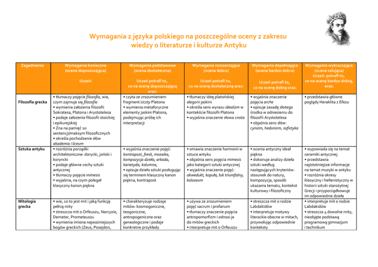 Wymagania z języka polskiego na poszczególne oceny z zakresu wiedzy o literaturze i kulturze Antyku Zagadnienia Wymagania konieczne (ocena dopuszczająca) Uczeń: Filozofia grecka Sztuka antyku Mitologia grecka • tłumaczy pojęcie filozofia, wie, czym zajmuje się filozofia • wymienia założenia filozofii Sokratesa, Platona i Arystotelesa • podaje założenia filozofii stoickiej i epikurejskiej • Zna na pamięć 10 sentencji/maksym filozoficznych • określa pochodzenie słów akademia i liceum • rozróżnia porządki architektoniczne: dorycki, joński i koryncki • podaje główne cechy sztuki antycznej • tłumaczy pojęcie mimesis • wyjaśnia, na czym polegał klasyczny kanon piękna • wie, co to jest mit i jaką funkcję pełnią mity • streszcza mit o Orfeuszu, Narcyzie, Demeter, Prometeuszu • wymienia imiona najważniejszych bogów greckich (Zeus, Posejdon, Wymagania podstawowe (ocena dostateczna) Wymagania rozszerzające (ocena dobra) Wymagania dopełniające (ocena bardzo dobra) Uczeń potrafi to, co na ocenę dostateczną oraz: Uczeń potrafi to, co na ocenę dobrą oraz: • tłumaczy ideę platońskiej alegorii jaskini • określa sens wyrazu idealizm w kontekście filozofii Platona • wyjaśnia znaczenie słowa cnota • wyjaśnia znaczenie pojęcia arche • opisuje zasadę złotego środka w odniesieniu do filozofii Arystotelesa • objaśnia sens słów: cynizm, hedonizm, sofistyka • przedstawia główne poglądy Heraklita z Efezu • wyjaśnia znaczenie pojęć: kontrapost, fresk, mozaika, kompozycja dzieła, arkada, kariatyda, kolumna, • opisuje dzieło sztuki posługując się terminem klasyczny kanon piękna, kontrapost • omawia znaczenie harmonii w sztuce antyku • objaśnia sens pojęcia mimesis jako kategorii sztuki antycznej • wyjaśnia znaczenie pojęć: akwedukt, kopuła, łuk triumfalny, koloseum • ocenia antyczny ideał piękna • dokonuje analizy dzieła sztuki według następujących kryteriów: stosunek do natury, kompozycja, sposób ukazania tematu, kontekst kulturowy i filozoficzny • charakteryzuje rodzaje mitów: kosmogoniczne, teogoniczne, antropogeniczne oraz genealogiczne i podaje konkretne przykłady • używa ze zrozumieniem pojęć sacrum i profanum • tłumaczy znaczenie pojęcia antropomorfizm i odnosi je do mitów greckich • interpretuje mit o Orfeuszu • streszcza mit o rodzie Labdakidów • interpretuje motywy literackie obecne w mitach, przywołując odpowiednie konteksty • wypowiada się na temat ceramiki antycznej • przedstawia najistotniejsze informacje na temat muzyki w antyku • rozróżnia okresy klasyczny i hellenistyczny w historii sztuki starożytnej Grecji i przyporządkowuje im odpowiednie dzieła • interpretuje mit o rodzie Labdakidów • streszcza 4 dowolne mity, nieobjęte podstawą programową gimnazjum i technikum Uczeń potrafi to, co na ocenę dopuszczającą oraz: • czyta ze zrozumieniem fragment Uczty Platona • wymienia metaforyczne elementy jaskini Platona, podejmując próbę ich interpretacji Wymagania wykraczające (ocena celująca) Uczeń: potrafi to, co na ocenę bardzo dobrą, oraz: Literatura starożytnych Homer – początki epiki Teatr antyczny Hades, Hera, Hestia, Demeter, Afrodyta, Apollo, Ares, Atena, Hermes i Hefajstos) • potrafi wymienić motywy literackie obecne w mitach • odróżnia politeizm od monoteizmu każdego z nich • tłumaczy pojęcie sacrum i profanum i Narcyzie • potrafi porównać motywy literackie obecne w mitach • przywołuje konteksty • wie, kim była Safona i Tyrteusz • podaje cechy erotyku • określa cechy poezji tyrtejskiej • wie, co to jest i na czym polega patriotyzm • określa podmiot liryczny i wskazuje jego emocje • potrafi opowiedzieć przebieg pojedynku Apolla i Marsjasza • wyjaśnia termin Iliada • opisuje przebieg pojedynku Achillesa i Hektora • wymienia cechy eposu homeryckiego • próbuje udowodnić tezę interpretacyjną • stawia tezę interpretacyjną i ją udowadnia • używa swobodnie pojęcia liryzm • • tłumaczy miarę strofy safickiej • podaje cechy i genezę epigramatu • wyjaśnia, na czym polega specyfika porównania homeryckiego i wskazuje przykłady w tekście • relacjonuje główny wątek Iliady • ocenia przebieg pojedynku Hektora z Achillesem • wskazuje na zabiegi służące obiektywizacji relacji narratora • relacjonuje główne wątki Iliady • rozpoznaje i wskazuje cechy stylu podniosłego • charakteryzuje głównych bohaterów Iliady • wymienia drugoplanowych bohaterów utworu • podaje genezę Iliady • streszcza historię wojny trojańskiej • odróżnia inwokację od apostrofy • omawia na przykładach istotę patosu • charakteryzuje głównych bohaterów Iliady • wymienia imiona drugoplanowych bohaterów Iliady: Andromacha, Priam, Kasandra, Helena, Parys, Laokoon • konfrontuje historię o Laokoonie z rzeźbą Grupa Laukona • wskazuje podstawowe elementy budowy teatru greckiego – orchestrę, proscenium, skene, parodos i zna ich polskie • posługuje się pojęciami i wyrażeniami: dytyramb, koryfeusz, chór, koturny, maska • wymienia elementy kompozycji • omawia historię narodzin teatru • podaje cechy komedii • swobodnie posługuje się • określa rolę trzech pisarzy – Ajschylosa, Eurypidesa i Sofoklesa – w rozwoju dramatu • omawia wpływ tragików greckich: Ajschylosa, Eurypidesa i Sofoklesa na rozwój teatru Król Edyp odpowiedniki • definiuje pojęcie tragedia • podaje cechy tragedii • wyjaśnia, na czym polegała zasada trzech jedności • wyjaśnia, na czym polegała idea katharsis • określa znaczenie chóru dla tragedii greckiej • streszcza Króla Edypa • definiuje pojęcia: tragizm, hybris, zbłądzenie tragiczne, Fatum • charakteryzuje Edypa, biorąc pod uwagę, jak zmienia się bohater podczas śledztwa • wymienia argumenty świadczące o tym, że Edyp jest bohaterem tragicznym tragedii: par