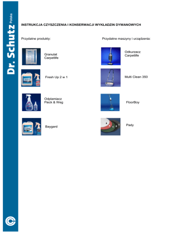 Polska INSTRUKCJA CZYSZCZENIA I KONSERWACJI WYKŁADZIN DYWANOWYCH Przydatne produkty: Granulat Carpetlife Fresh Up 2 w 1 Odplamiacz Fleck & Weg Baygard Przydatne maszyny i urządzenia: Odkurzacz Carpetlife Multi Clean 350 FloorBoy Pady Polska 1. PIELĘGNACJA CODZIENNA a) codziennie przeprowadzać odkurzanie całej powierzchni wykładziny odkurzaczem kolumnowym z szczotką walcową Odkurzacz Carpetlife b) powstałe plamy usuwać natychmiast Odplamiaczem Fleck & Weg lub Ściereczką Fleck & Weg c) - używając odplamiacza należy spryskać białą bawełnianą ściereczkę odplamiaczem i przyduszając spryskaną część ściereczki do plamy usuwać zabrudzenie; uwaga: nie wcierać zabrudzeń w strukturę włókna – plamę usuwać przez dociskanie ściereczki z odplamiaczem do powstałego zabrudzenia - Chusteczka Fleck & Weg jest gotowa do użytku - po usunięciu plamy, bawełnianą ściereczkę zamoczyć w czystej wodzie i przyciskając do plamy usunąć pozostałości odplamiacza - nanieść na czyszczoną powierzchnię impregnat Baygard zabezpieczający wykładziny przed intensywnym brudzeniem 2. PIELĘGNACJA OKRESOWA UWAGA: nie prać powierzchni metodą mokrą – współczesnych wykładzin dywanowych nie należy poddawać czyszczeniu z udziałem wody. Wykładziny dywanowe należy czyścić jedynie metodą „suchą” w okresie co 6 do 8 miesięcy (zależne od intensywności użytkowania i zabrudzenia). Czyszczenie metodą suchą produktem Granulat Carpetlife. Przebieg czyszczenia. a) odkurzanie powierzchni odkurzaczem kolumnowym Odkurzacz Carpetlife b) usuwanie plam środkiem Odplamiacz Fleck & Weg c) rozsypanie na powierzchni ok. 6 m2 produktu Granulat Carpetlife d) szczotkowanie urządzeniem z szczotkami walcowymi Odkurzacz Carpetlife lub Multi Clean 350 e) po wyczyszczeniu całej powierzchni odkurzenie pozostałego, suchego granulatu urządzeniem Odkurzacz Carpetlife f) zabezpieczenie wykładziny impregnatem Baygard firmy Dr. Schutz, który chroni wykładzinę przed intensywnym brudzeniem g) pozostawienie do wyschnięcia na okres ok. 2 godzin. Czyszczenie metodą suchą produktem Fresh Up 2 w 1. Przebieg czyszczenia. a) odkurzanie powierzchni odkurzaczem kolumnowym Odkurzacz Carpetlife b) usuwanie plam środkiem Odplamiacz Fleck & Weg c) rozpylenie na powierzchni ok. 6 m2 produktu Fresh Up 2 w 1 d) czyszczenie urządzeniem FloorBoy z padem z mikrofibry e) zabezpieczenie wykładziny impregnatem Baygard, który chroni wykładzinę przed intensywnym brudzeniem f) pozostawienie do wyschnięcia na okres ok. 2 godzin. Polska 3. OPIS PRODUKTÓW Granulat Carpetlife - granulat do czyszczenia na sucho – do wykładzin dywanowych z włókien syntetycznych, nie stosować do włókien naturalnych (oprócz juty, trawy morskiej, kokosu itp.) oraz do wykładzin i dywanów o wysokości runa pow. 10 mm; podczas czyszczenia podłoże nadaje się do użytkowania; - wydajność 1 kg = 15 do 20 m2 - pojemność 1,00 kg, index 10500001 - pojemność 10,00 kg, index 10500010 Baygard, Impregnat do Wykładzin Dywanowych – zapobiega intensywnemu brudzeniu się wykładzin i dywanów oraz filcowaniu włókien - PH – 6,5 - wydajność 1 l = 40 m2 - pojemność 0,500 l, index 15050500 - pojemność 5,000 l, index 15050005 Odplamiacz Fleck & Weg – usuwa plamy z syntetycznych i elastycznych wykładzin, laminatów i wodoodpornych powierzchni. Dzięki aktywnemu tlenowi likwiduje uporczywe plamy po czerwonym winie, herbacie, a także ślady po obcasach, gumie itp. - pojemność 0,100 l, index 15400100 - pojemność 0,400 l, index 15418400 - sposób użycia – bezpośrednio na miejsce czyszczone. Fresh – Up 2 w 1 – wiąże i neutralizuje nieprzyjemne zapachy z wykładzin podłogowych i mebli tapicerowanych; skutecznie usuwa plamy i zabrudzenia; przeznaczony także do intensywnego czyszczenia przy użyciu padów - PH = 10,0 - pojemność 0,50 l, index 12300500 - pojemność 5,00 l, index 12300005 ul. Batorego 126a, 65-001 Zielona Góra, tel 068 3240312, 3290091 fax 0683290092, kom. 601 500781