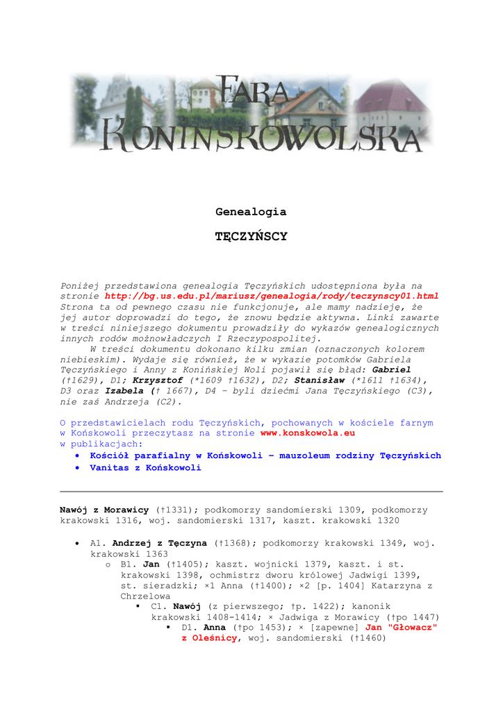Genealogia TĘCZYŃSCY Poniżej przedstawiona genealogia Tęczyńskich udostępniona była na stronie http://bg.us.edu.pl/mariusz/genealogia/rody/teczynscy01.html Strona ta od pewnego czasu nie funkcjonuje, ale mamy nadzieję, że jej autor doprowadzi do tego, że znowu będzie aktywna. Linki zawarte w treści niniejszego dokumentu prowadziły do wykazów genealogicznych innych rodów możnowładczych I Rzeczypospolitej. W treści dokumentu dokonano kilku zmian (oznaczonych kolorem niebieskim). Wydaje się również, że w wykazie potomków Gabriela Tęczyńskiego i Anny z Konińskiej Woli pojawił się błąd: Gabriel (†1629), D1; Krzysztof (*1609 †1632), D2; Stanisław (*1611 †1634), D3 oraz Izabela († 1667), D4 – byli dziećmi Jana Tęczyńskiego (C3), nie zaś Andrzeja (C2). O przedstawicielach rodu Tęczyńskich, pochowanych w kościele farnym w Końskowoli przeczytasz na stronie www.konskowola.eu w publikacjach: • Kościół parafialny w Końskowoli – mauzoleum rodziny Tęczyńskich • Vanitas z Końskowoli Nawój z Morawicy (†1331); podkomorzy sandomierski 1309, podkomorzy krakowski 1316, woj. sandomierski 1317, kaszt. krakowski 1320 • A1. Andrzej z Tęczyna (†1368); podkomorzy krakowski 1349, woj. krakowski 1363 o B1. Jan (†1405); kaszt. wojnicki 1379, kaszt. i st. krakowski 1398, ochmistrz dworu królowej Jadwigi 1399, st. sieradzki; ×1 Anna (†1400); ×2 [p. 1404] Katarzyna z Chrzelowa C1. Nawój (z pierwszego; †p. 1422); kanonik krakowski 1408-1414; × Jadwiga z Morawicy (†po 1447) D1. Anna (†po 1453); × [zapewne] Jan "Głowacz" z Oleśnicy, woj. sandomierski (†1460) C2. Andrzej (z pierwszego; †p. 1414); podstoli krakowski 1408, kaszt. wojnicki 1412; × [p. 1410] Anna z Goraja D1. Jan (†1470); podkomorzy krakowski 1415, kaszt. i st. biecki 1434, kaszt. wojnicki 1435 woj. sandomierski 1438, krakowski 1438, kaszt. krakowski 1458; × Barbara (Dąbrowska?) E1. Andrzej (†1503); kaszt. małogoski 1474, sądecki 1475, wojnicki 1479; × [p. 1475] Katarzyna ze Szczekocin E2. Zbigniew (†1498); podstoli sandomierski 1479, podkomorzy krakowski 1481, st. malborski 1485-1495, st. lwowski 1497-1498; × [p. 1487] Katarzyna z Pleszewa F1. Jan (†1532); dworzanin królewski 1503, podkomorzy krakowski 1517, hr. S.I.R. 1527; × [p. 1531] Anna Fogelweder (†po 1534) F2. Andrzej (†1536); dworzanin królewski 1503, sekretarz królewski 1510, referendarz koronny 1512, podkomorzy sandomierski 1510, kaszt. biecki 1511, woj. lubelski 1515, podkomorzy krakowski 1515, woj. sandomierski 1519, krakowski 1527, hr. S.I.R. 1527, kaszt. krakowski 1532, st. sandomierski, bełski, chełmski, trembowelski, krasnostawski, hrubieszowski, sokalski, ojcowski, ratneński, tyszowiecki; × [p. 1518] Katarzyna Sienieńska (†po 1530) F3. Anna (†po 19.V.1525); ×1 [m. 31.X.1504 i 10.VI.1506] Mikołaj III, ks. raciborski ((*1478?) †3.XI.1506); ×2 [p. 1533] Jan Kościelecki, woj. inowrocławski (†1553) E3. Jan (z Łętkowic) (†po 1478) F1. Stanisław (†po 1478) E4. Stanisław (†1497); podkomorzy chełmski 1468, woj. bełski 1496; × [p. 1466] Barbara Zawiszanka z Rożnowa (*ok. 1447 †1517); (2°-v. Jan Amor Tarnowski, kaszt. krakowski) F1. Barbara; × Piotr z Nowego Miasta F2. Zofia; × Feliks Ligęza, burgrabia krakowski F3. Agnieszka Beata (†1531/1535); ×1 Jakub Sieklucki, kaszt. wojnicki; ×2 Jan "Ciężki" Tarnowski, kaszt. sądecki (*p. 1479 †1527) F4. Elżbieta (†p. 1533); × [p. 1503] Stanisław z Mielca, kaszt. zawichostski (†1532) F5. Dorota (†po 1534); × [p. 1497] Prokop Ossoliński, chorąży lubelski (†p. 1533) E5. Sędziwój (z Chrobrza) (†po 1473); kanonik krakowski 1461, oficjał krakowski 1473, sekretarz królewski, rektor Uniwersytetu Jagiellońskiego E6. Barbara (†po 1506); × Jakub Koniecpolski, kaszt. przemyski (†1480) E7. Beata (†1517); × Jan Odrowąż ze Sprowy, woj. podolski i ruski (†1485) E8. Mikołaj (†1497); miecznik krakowski 1490, woj. bełski 1495-1496, woj. i st. ruski 1497; × Aleksandra z Chożowa (†1519/1520) [ojciec: Olechno z Chożowa, woj. wileński] F1. Anna (†po 1523); × [zapewne 1502/1503] Mikołaj Szydłowiecki, kaszt. radomski (*1480 (?) †1532) F2. Jan (*ok. 1492 †1541); miecznik krakowski i podkomorzy chełmski 1515, kaszt. chełmski 1525, woj. bełski 1528, podolski 1533, ruski 1536, sandomierski 1537, st. bełski, chełmski, krasnostawski, ratneński; × [p. 1521] Katarzyna Łaska (†1568) G1. Zofia (†ok. 1588); × [1544/1545] Stanisław Ostroróg, kaszt. międzyrzecki (*ok. 1520 †1568) G2. Katarzyna (†1567); ×1 [1549] Jan Boner, kaszt. oświęcimski (†1562); ×2 Stanisław Barzi, woj. krakowski F3. Stanisław (†1521/1527); dworzanin królewski, st. lubomelski F4. Jadwiga (†1549/1560); ×1 Adam Kurozwęcki vel Rytwiański, st. brzeźnicki (†p. 1511); ×2 [p. 1520] Piotr Opaliński, kaszt. gnieźnieński (†1551) F5. Barbara (*ok. 1490 †1521); × [p. 1512] Jan Amor Tarnowski, kaszt. krakowski i hetman wielki koronny (*1488 †1561) E9. Gabriel (†1497); × Anna z Konińskiej Woli (†po 1520)(lub zm. po 1534, jak wynika z ustaleń J.Kurtyki); po nim POTOMSTWO D2. Nawój (†ok. 1427) D3. Anna (†1445/1451); × [zapewne 1420] Zbigniew z Brzezia i Włodzisławia, marszałek koronny (†1425) D4. Andrzej z Rabsztyna (†1461); st. rabsztyński 1441, chełmiński 1455; × [p. 1442] Jadwiga z Książa (*ok. 1427 †1449/1458) E1. Jan z Rabsztyna (†1498/1499); kaszt. zawichost. 1479, wiślicki 1483-1490, st. sandomierski; × Barbara z Konińskiej Woli (†po 1507) F1. Andrzej Rabsztyński (†ok. 1509); kanonik krakowski, st. płocki F2. Jan Rabsztyński (†1505); marszałek nadworny koronny 1502, st. sandomierski i płocki; × Barbara ze Sprowy (z Sienna?) (†po 1507) F3. Zofia; × Mikołaj Słabosz z Putnowic E2. Anna; × Paweł ze Szczekocin, st. olsztyński C3. Jan (z pierwszego; †1401) C4. Piotr (z pierwszego; †p. 1417) C5. Prakseda (Prachna); ×1 Jan z Chrz