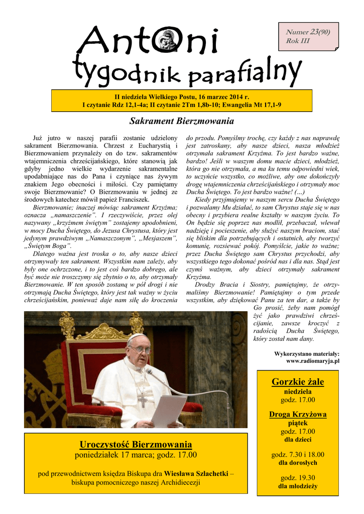 AntOni Numer 23(90) Rok III II niedziela Wielkiego Postu, 16 marzec 2014 r. I czytanie Rdz 12,1-4a; II czytanie 2Tm 1,8b-10; Ewangelia Mt 17,1-9 Sakrament Bierzmowania Już jutro w naszej parafii zostanie udzielony sakrament Bierzmowania. Chrzest z Eucharystią i Bierzmowaniem przynależy on do tzw. sakramentów wtajemniczenia chrześcijańskiego, które stanowią jak gdyby jedno wielkie wydarzenie sakramentalne upodabniające nas do Pana i czyniące nas żywym znakiem Jego obecności i miłości. Czy pamiętamy swoje Bierzmowanie? O Bierzmowaniu w jednej ze środowych katechez mówił papież Franciszek. Bierzmowanie; inaczej mówiąc sakrament Krzyżma; oznacza „namaszczenie”. I rzeczywiście, przez olej nazywany „krzyżmem świętym” zostajemy upodobnieni, w mocy Ducha Świętego, do Jezusa Chrystusa, który jest jedynym prawdziwym „Namaszczonym”, „Mesjaszem”, „Świętym Boga”. Dlatego ważna jest troska o to, aby nasze dzieci otrzymywały ten sakrament. Wszystkim nam zależy, aby były one ochrzczone, i to jest coś bardzo dobrego, ale być może nie troszczymy się zbytnio o to, aby otrzymały Bierzmowanie. W ten sposób zostaną w pół drogi i nie otrzymają Ducha Świętego, który jest tak ważny w życiu chrześcijańskim, ponieważ daje nam siłę do kroczenia do przodu. Pomyślmy trochę, czy każdy z nas naprawdę jest zatroskany, aby nasze dzieci, nasza młodzież otrzymała sakrament Krzyżma. To jest bardzo ważne, bardzo! Jeśli w waszym domu macie dzieci, młodzież, która go nie otrzymała, a ma ku temu odpowiedni wiek, to uczyńcie wszystko, co możliwe, aby one dokończyły drogę wtajemniczenia chrześcijańskiego i otrzymały moc Ducha Świętego. To jest bardzo ważne! (…) Kiedy przyjmujemy w naszym sercu Ducha Świętego i pozwalamy Mu działać, to sam Chrystus staje się w nas obecny i przybiera realne kształty w naszym życiu. To On będzie się poprzez nas modlił, przebaczał, wlewał nadzieję i pocieszenie, aby służyć naszym braciom, stać się bliskim dla potrzebujących i ostatnich, aby tworzyć komunię, rozsiewać pokój. Pomyślcie, jakie to ważne; przez Ducha Świętego sam Chrystus przychodzi, aby wszystkiego tego dokonać pośród nas i dla nas. Stąd jest czymś ważnym, aby dzieci otrzymały sakrament Krzyżma. Drodzy Bracia i Siostry, pamiętajmy, że otrzymaliśmy Bierzmowanie! Pamiętajmy o tym przede wszystkim, aby dziękować Panu za ten dar, a także by Go prosić, żeby nam pomógł żyć jako prawdziwi chrześcijanie, zawsze kroczyć z radością Ducha Świętego, który został nam dany. Wykorzystano materiały: www.radiomaryja.pl Gorzkie żale niedziela godz. 17.00 Droga Krzyżowa piątek godz. 17.00 Uroczystość Bierzmowania dla dzieci poniedziałek 17 marca; godz. 17.00 godz. 7.30 i 18.00 pod przewodnictwem księdza Biskupa dra Wiesława Szlachetki – biskupa pomocniczego naszej Archidiecezji dla dorosłych godz. 19.30 dla młodzieży Wiara szuka zrozumienia Ks. Krystian Wilczyński ([email protected]) Jak współpracować z Duchem Świętym wykorzystując Jego dary? Żeby odpowiedzieć na to pytanie, trzeba przypomnieć najważniejsze przestrzenie działania Ducha Świętego. Oczywiście nie ogranicza się On jedynie do nich, ale warto wiedzieć gdzie działa na pewno: „w Pismach, które On natchnął; w Tradycji, której zawsze aktualnymi świadkami są Ojcowie Kościoła; w Nauczycielskim Urzędzie Kościoła, któremu On asystuje; w liturgii sakramentalnej, w której przez jej słowa i symbole Duch Święty prowadzi nas do komunii z Chrystusem; w modlitwie, w której wstawia się za nami; w charyzmatach i urzędach, które budują Kościół; w znakach życia apostolskiego i misyjnego; w świadectwie świętych, w którym ukazuje swoją świętość i kontynuuje dzieło zbawienia” (Katechizm KK n. 688). Tam można bezpośrednio odczuć Ducha Świętego. A jaki ma On cel?... To znaczy jak rozpoznać Jego wolę i spróbować współpracy? – Na pewno warto pamiętać, że On zawsze nas wyprzedza w swoich natchnieniach i że nigdy nie przewidzimy co wymyśli, żeby dać człowiekowi umiejętność, aby bardziej kochać. Podobnie jak zakochani są w stanie zrobić dla siebie nieprzewidywalne rzeczy, tak o wiele bardziej Duch, który jest miłością, będzie pomysłowy w jej okazywaniu. Dary, które Katechizm wymienia w liczbie siedmiu, nie wyczerpują, bynajmniej, działania Trzeciej Osoby Boskiej. Doświadczenie Ducha Świętego może być jak opisane poniżej, choć zawsze jest bardzo indywidualne i osobiste. Doświadcza się Ducha Świętego jako osoby. Jest to coś na kształt przyjaźni i zażyłości. Przyzywając Go ma się poczucie wielkiej bliskości. Spotkanie odbywa się prostymi aktami, na poziomie serca. Duch Święty jest bardzo radosny, ale daleki od bycia dowcipkowatym. Zawsze jest rozpromieniony i ciągle aktywny w udzielaniu. Daje i daje, i ciągle daje, nie przestając. Wzywany zawsze jest, nie wzywany – jest również. Ciągle uwielbia Ojca w pełni i zawsze jednoczy z Jezusem. Czasem potrzeba walczyć z widzeniem Go jako człowieka, choć siłą rzeczy w wyobraźni pojawia się niejasny kształt ludzki, z twarzą oddającą bogactwo działania i odczuwania. Jest gotowy na każde nasze pragnienie miłości – zawsze wspiera i potęguje jej przepływ – jakby miał nieograniczone środki dotacji na jakikolwiek przejaw miłości i swobodnie nimi dysponuje. Uprzedza każdą modlitwę i prośbę, wstawia się za tymi, których Mu powierzamy. Nie ma granic w swoim działaniu i traktuje nas jak Jezusa, bo ochrzczeni i miłujący, jesteśmy do Niego podobni. Smuci się z powodu grzechów i przekonuje o nich, prowadząc do źródeł sakramentu miłosierdzia. Karmi swoimi owocami (por. Ga 5,22n) i zawsze ma w pogotowiu odpowiedni dar dla wzmocnienia. Nie może się doczekać, kiedy przeniknie nas do reszty w Niebie i całych wypełni tak, jak przenikał i wypełniał Syna Człowieczeg