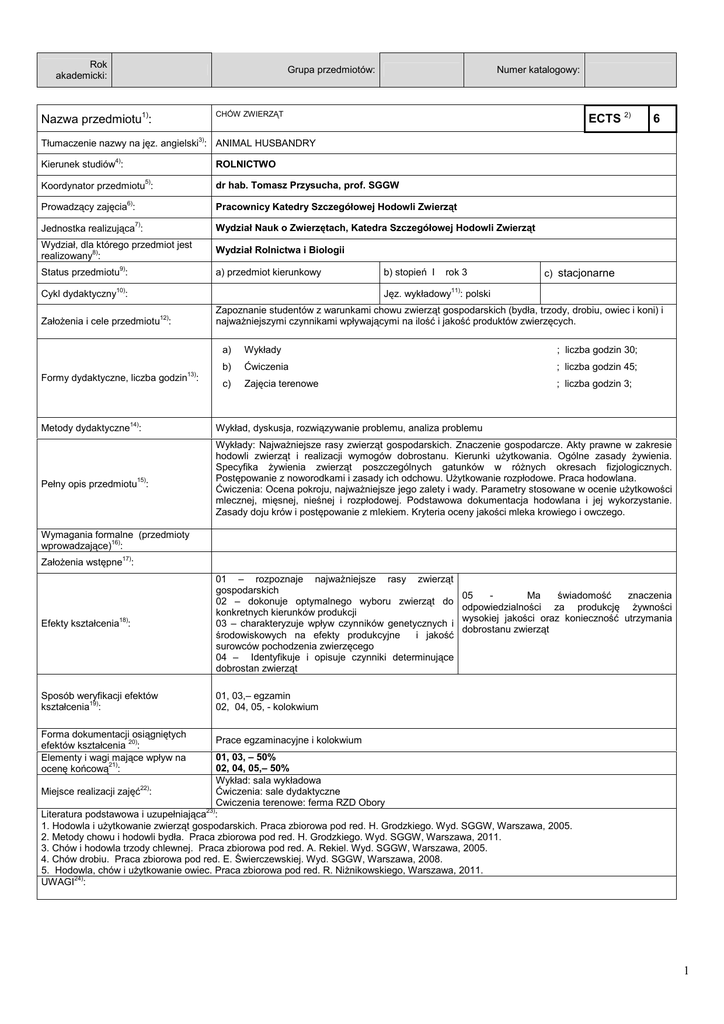 Rok akademicki: Grupa przedmiotów: Nazwa przedmiotu1): Numer katalogowy: CHÓW ZWIERZĄT ECTS 2) 6 Tłumaczenie nazwy na jęz. angielski3): ANIMAL HUSBANDRY Kierunek studiów4): ROLNICTWO 5) Koordynator przedmiotu : dr hab. Tomasz Przysucha, prof. SGGW Prowadzący zajęcia6): Pracownicy Katedry Szczegółowej Hodowli Zwierząt 7) Jednostka realizująca : Wydział Nauk o Zwierzętach, Katedra Szczegółowej Hodowli Zwierząt Wydział, dla którego przedmiot jest realizowany8): Wydział Rolnictwa i Biologii 9) Status przedmiotu : a) przedmiot kierunkowy Cykl dydaktyczny10): Założenia i cele przedmiotu12): Formy dydaktyczne, liczba godzin13): b) stopień I rok 3 c) stacjonarne Jęz. wykładowy11): polski Zapoznanie studentów z warunkami chowu zwierząt gospodarskich (bydła, trzody, drobiu, owiec i koni) i najważniejszymi czynnikami wpływającymi na ilość i jakość produktów zwierzęcych. a) Wykłady ; liczba godzin 30; b) Ćwiczenia ; liczba godzin 45; c) Zajęcia terenowe ; liczba godzin 3; Metody dydaktyczne14): Wykład, dyskusja, rozwiązywanie problemu, analiza problemu Pełny opis przedmiotu15): Wykłady: Najważniejsze rasy zwierząt gospodarskich. Znaczenie gospodarcze. Akty prawne w zakresie hodowli zwierząt i realizacji wymogów dobrostanu. Kierunki użytkowania. Ogólne zasady żywienia. Specyfika żywienia zwierząt poszczególnych gatunków w różnych okresach fizjologicznych. Postępowanie z noworodkami i zasady ich odchowu. Użytkowanie rozpłodowe. Praca hodowlana. Ćwiczenia: Ocena pokroju, najważniejsze jego zalety i wady. Parametry stosowane w ocenie użytkowości mlecznej, mięsnej, nieśnej i rozpłodowej. Podstawowa dokumentacja hodowlana i jej wykorzystanie. Zasady doju krów i postępowanie z mlekiem. Kryteria oceny jakości mleka krowiego i owczego. Wymagania formalne (przedmioty wprowadzające)16): Założenia wstępne17): Efekty kształcenia18): 01 – rozpoznaje najważniejsze rasy zwierząt gospodarskich 02 – dokonuje optymalnego wyboru zwierząt do konkretnych kierunków produkcji 03 – charakteryzuje wpływ czynników genetycznych i środowiskowych na efekty produkcyjne i jakość surowców pochodzenia zwierzęcego 04 – Identyfikuje i opisuje czynniki determinujące dobrostan zwierząt Sposób weryfikacji efektów kształcenia19): 01, 03,– egzamin 02, 04, 05, - kolokwium Forma dokumentacji osiągniętych efektów kształcenia 20): Elementy i wagi mające wpływ na ocenę końcową21): 05 Ma świadomość znaczenia odpowiedzialności za produkcję żywności wysokiej jakości oraz konieczność utrzymania dobrostanu zwierząt Prace egzaminacyjne i kolokwium 01, 03, – 50% 02, 04, 05,– 50% Wykład: sala wykładowa Miejsce realizacji zajęć22): Ćwiczenia: sale dydaktyczne Cwiczenia terenowe: ferma RZD Obory Literatura podstawowa i uzupełniająca23): 1. Hodowla i użytkowanie zwierząt gospodarskich. Praca zbiorowa pod red. H. Grodzkiego. Wyd. SGGW, Warszawa, 2005. 2. Metody chowu i hodowli bydła. Praca zbiorowa pod red. H. Grodzkiego. Wyd. SGGW, Warszawa, 2011. 3. Chów i hodowla trzody chlewnej. Praca zbiorowa pod red. A. Rekiel. Wyd. SGGW, Warszawa, 2005. 4. Chów drobiu. Praca zbiorowa pod red. E. Świerczewskiej. Wyd. SGGW, Warszawa, 2008. 5. Hodowla, chów i użytkowanie owiec. Praca zbiorowa pod red. R. Niżnikowskiego, Warszawa, 2011. UWAGI24): 1 Wskaźniki ilościowe charakteryzujące moduł/przedmiot25) : Szacunkowa sumaryczna liczba godzin pracy studenta (kontaktowych i pracy własnej) niezbędna dla osiągnięcia zakładanych efektów 175 h kształcenia18) - na tej podstawie należy wypełnić pole ECTS2: Łączna liczba punktów ECTS, którą student uzyskuje na zajęciach wymagających bezpośredniego udziału nauczycieli akademickich: 3 ECTS Łączna liczba punktów ECTS, którą student uzyskuje w ramach zajęć o charakterze praktycznym, takich jak zajęcia laboratoryjne, projektowe, itp.: 2 ECTS Tabela zgodności kierunkowych efektów kształcenia efektami przedmiotu 26) Nr /symbol efektu 01 Opisuje najważniejsze rasy zwierząt gospodarskich K_W10 02 dokonuje optymalnego wyboru zwierząt do konkretnych kierunków produkcji K_U03 03 charakteryzuje wpływ czynników genetycznych i środowiskowych na efekty produkcyjne i jakość surowców pochodzenia zwierzęcego Identyfikuje i opisuje czynniki determinujące dobrostan zwierząt K_W10, K_W15 K_U17 Ma świadomość znaczenia odpowiedzialności za produkcję żywności wysokiej jakości oraz K_K05 04 05 Wymienione w wierszu efekty kształcenia: Odniesienie do efektów dla programu kształcenia na kierunku konieczność utrzymania dobrostanu zwierząt 2 Instrukcja wypełniania pól opisu modułu kształcenia/przedmiotu Opis przedmiotu kształcenia jest dokumentem ogólnodostępnym. Wypełnienie opisu przedmiotu stanowi zobowiązanie, że treści przedmiotu, jego zaliczenie (wpływ poszczególnych elementów na ocenę ostateczną), dokumentowanie osiąganych efektów kształcenia i inne zawarte w nim elementy będą prowadzone zgodnie z opisem. 1. 2. 3. 4. 5. 6. 7. 8. 9. 10. 11. 12. 13. 14. 15. 16. 17. 18. 19. „Nazwa przedmiotu” - dokładna, jednoznaczna nazwa modułu/przedmiotu. Wpisana do formularza nazwa zostanie umieszczona w systemie HMS i będzie powielana w dokumentach dot. przebiegu studiów (protokoły zaliczeń, karty przebiegu studiów, wykazy zajęć, itp.) oraz wydrukowana w suplemencie do dyplomu. „Punkty ECTS” - liczba całkowita, należy wpisać liczbę punktów ECTS przyporządkowaną przedmiotowi wynikającą z sumarycznej liczby godzin pracy studenta potrzebnych do osiągnięcia efektów kształcenia dla modułu/przedmiotu (sumy godzin wymagających bezpośredniego udziału nauczyciela akademickiego oraz godzin pracy własnej studenta) Objaśnienia dot. punktów ECTS znajdują się w punkcie dotyczącym wskaźników ilościowych charakteryzujących 25) przedmiot . 1) „Tłumaczenie nazwy na język angielski” - informacja ta, podobnie jak „Nazw
