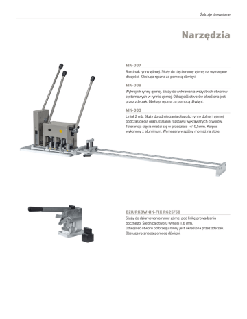 Żaluzje drewniane Narzędzia MK-007 Rozcinak rynny górnej. Służy do cięcia rynny górnej na wymagane długości. Obsługa ręczna za pomocą dźwigni. MK-009 Wykrojnik rynny górnej. Służy do wykrawania wszystkich otworów systemowych w rynnie górnej. Odległość otworów określona jest przez zderzak. Obsługa ręczna za pomocą dźwigni. MK-003 Liniał 2 mb. Służy do odmierzania długości rynny dolnej i górnej podczas cięcia oraz ustalania rozstawu wykrawanych otworów. Tolerancja cięcia mieści się w przedziale +/-0,5mm. Korpus wykonany z aluminium. Wymagany wspólny montaż na stole. DZIURKOWNIK-FIX RG25/50 Służy do dziurkowania rynny górnej pod linkę prowadzenia bocznego. Średnica otworu wynosi 1,6 mm. Odległość otworu od brzegu rynny jest określona przez zderzak. Obsługa ręczna za pomocą dźwigni. Żaluzje drewniane M400 RD jest półatomatyczną maszyną do produkcji żaluzji drewnianych. CECHY MASZYNY ■■Wszytkie otwory wykrawane jednocześnie ■■Zakres szerokości piór: 24-52 mm ■■Ręczne podawanie i wyjmowanie piór DODATKOWE WYPOSAŻENIE ■■System wykrawania otworów prowadzenia bocznego Szerokość pióra Maksymalna długość pióra Liczba stacji dziurkujących Minimalna odległość otworu od brzegu pióra Zasilanie Moc Waga netto Waga brutto Opakowanie – 1 skrzynia drewniana 25 mm, 35 mm, 50 mm 2500 mm 4 70 mm 3x400 V / 50-60 Hz 0,75 kW 160 kg 310 kg Wysokość =2750 mm Szerokość = 670 mm Głębokość =1670 mm M400RD Żaluzje drewniane 216WAF jest w pełni zautomatyzowaną maszyną do produkcji żaluzji drewnianych. CECHY MASZYNY ■■Wszytkie otwory wykrawane jednocześnie ■■Zastosowanie: pióra drewniane lub drewnopodobne w zakresie szerokości 24-52 mm ■■Precyzyjne ustawianie długości piórka oraz pozycji stacji dziurkujących ■■Łatwość obsługi i konserwacji ■■Dostępne zapasowe dziurkowniki ■■216WAF może być dozbrojona do wersji 216W-219W DODATKOWE WYPOSAŻENIE ■■Kontrola szybkości ■■Zestaw części zamiennych ■■Umowa serwisowa Zasilanie Wymagania sprzętu pneumatycznego 3 x 220/240V (50/60 Hz) lub 3 x 380/415V (50/60 Hz) ok. 6 bar przy 30 L/min. 216WAF Żaluzje drewniane 216W-219W jest w pełni zautomatyzowaną maszyną do produkcji żaluzji drewnianch. CECHY MASZYNY ■■Wszytkie otwory wykrawane jednocześnie ■■Zastosowanie: pióra drewniane lub drewnopodobne w zakresie szerokości 24-52 mm ■■Przystosowana do różnych szerkości piór i typów drabinki ■■Precyzyjne ustawianie długości piórka oraz pozycji stacji dziurkujących ■■Łatwość obsługi i konserwacji ■■Dostępne zapasowe dziurkowniki DODATKOWE WYPOSAŻENIE ■■Magazynek na drabinkę taśmową ■■Kontrola szybkości ■■Zestaw części zamiennych ■■Umowa serwisowa Zasilanie Wymagania sprzętu pneumatycznego 3 x 220/240V (50/60 Hz) lub 3 x 380/415V (50/60 Hz) ok. 6 bar przy 30 L/min. 216W-219W