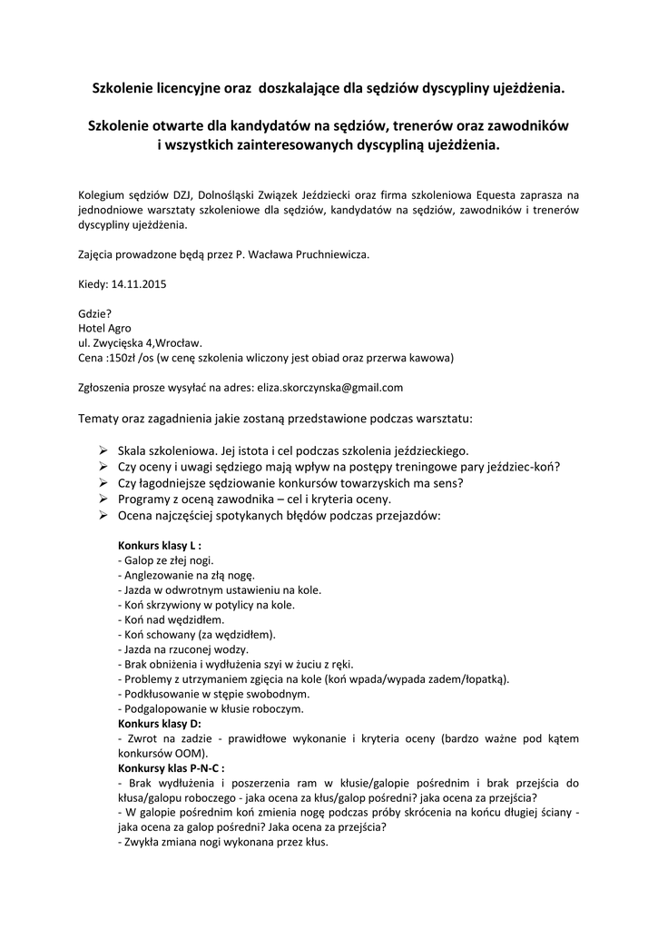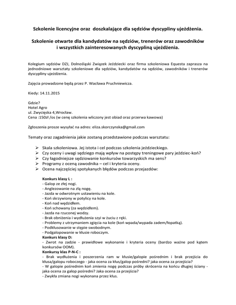 Szkolenie licencyjne oraz doszkalające dla sędziów dyscypliny ujeżdżenia. Szkolenie otwarte dla kandydatów na sędziów, trenerów oraz zawodników i wszystkich zainteresowanych dyscypliną ujeżdżenia. Kolegium sędziów DZJ, Dolnośląski Związek Jeździecki oraz firma szkoleniowa Equesta zaprasza na jednodniowe warsztaty szkoleniowe dla sędziów, kandydatów na sędziów, zawodników i trenerów dyscypliny ujeżdżenia. Zajęcia prowadzone będą przez P. Wacława Pruchniewicza. Kiedy: 14.11.2015 Gdzie? Hotel Agro ul. Zwycięska 4,Wrocław. Cena :150zł /os (w cenę szkolenia wliczony jest obiad oraz przerwa kawowa) Zgłoszenia prosze wysyłać na adres: [email protected] Tematy oraz zagadnienia jakie zostaną przedstawione podczas warsztatu: Skala szkoleniowa. Jej istota i cel podczas szkolenia jeździeckiego. Czy oceny i uwagi sędziego mają wpływ na postępy treningowe pary jeździec-koń? Czy łagodniejsze sędziowanie konkursów towarzyskich ma sens? Programy z oceną zawodnika – cel i kryteria oceny. Ocena najczęściej spotykanych błędów podczas przejazdów: Konkurs klasy L : - Galop ze złej nogi. - Anglezowanie na złą nogę. - Jazda w odwrotnym ustawieniu na kole. - Koń skrzywiony w potylicy na kole. - Koń nad wędzidłem. - Koń schowany (za wędzidłem). - Jazda na rzuconej wodzy. - Brak obniżenia i wydłużenia szyi w żuciu z ręki. - Problemy z utrzymaniem zgięcia na kole (koń wpada/wypada zadem/łopatką). - Podkłusowanie w stępie swobodnym. - Podgalopowanie w kłusie roboczym. Konkurs klasy D: - Zwrot na zadzie - prawidłowe wykonanie i kryteria oceny (bardzo ważne pod kątem konkursów OOM). Konkursy klas P-N-C : - Brak wydłużenia i poszerzenia ram w kłusie/galopie pośrednim i brak przejścia do kłusa/galopu roboczego - jaka ocena za kłus/galop pośredni? jaka ocena za przejścia? - W galopie pośrednim koń zmienia nogę podczas próby skrócenia na końcu długiej ściany jaka ocena za galop pośredni? Jaka ocena za przejścia? - Zwykła zmiana nogi wykonana przez kłus. - Zwykła zmiana nogi wykonana przez stęp z lewej nogi na lewą / z prawej na prawą (po błędzie w kontrgalopie). - Półpiruet w stępie zebranym - koń stoi zadem, brak zgięcia, wypada zadem, bardzo obszerny (jak półwolta). - Brak różnicy między kłusem/galopem pośrednim i wyciągniętym. - ciąg w kłusie pokazany jak ustępowanie od łydki (brak zgięcia) - lotna zmiana nogi wykonana przez kłus/stęp Sytuacje niestandardowe podczas zawodów. Analiza i omówienie. Grupa szkoleniowa – dla kogo szkolenie? Niniejszy warsztat ma za zadanie pomóc w udoskonaleniu umiejętności oceniania przejazdów, uważnego obserwowania przejazdów, umiejętności odnalezienia się w niestandardowych sytuacjach pojawiających sie podczas zawodów ujeżdżeniowych. Podczas zajęć uczestnicy będą zachęcani do aktywnego uczestnictwa w dyskusjach, aby wspólnie analizować najczęściej pojawiajce się błędy podczas przejazdów, oraz aby ujednolicić system oceniania poszczególnych figur w trakcie przejazdu zawodnika na czworoboku. Warsztat skierowany jest do sędziów jak i kandydatów na sędziów w dyscyplinie ujeżdżenia, zawodników oraz trenerów. Cele warsztatu to: 1. Przypomnienie istoty i celu skali szkoleniowej. 2. Omówienie i analiza najczęściej pojawiających sie błędów podczas przejazdów zawodników na czworoboku. 3. Ustalenie celów i kryterów oceniania przejazdów z oceną stylu jeźdżca. 4. Ujednolicenie ktyterów sędziowania najniższych klas. 5. Analiza i omówienie niestandardowych sytuacji pojawiających się na zawodach ujezdżeniowych. Zadania szkoleniowe: Zadaniem warsztatu jest ugruntowanie dotychczasowej wiedzy na temat sędziowania przejazdów ujeżdżeniowych przez sędziów a także ujednolicenie kryteriów sędziowania programów ujeżdżeniowych. Po szkoleniu uczestnicy mają także wiedzieć jak odnajdywać się w sytuacjach niestandardowych, jak wybronić swoje oceny w przypadku pytań ze strony zawodnika czy trenera. Uczestnicy po odbyciu szkolenia będa wiedzieć jak wyszkolenie konia w odniesieniu do skali szkoleniowej ma wpływ na końcowe oceny przejazdu. Jaka wiedza zostanie przekazana uczestnikom podczas szkolenia? 1. Cel i zastosowanie skali szkoleniowej. 2. Kryteria oceniania programów z ocena stylu jeźdźca. 3. Prawidłowość wykonania figur na czworoboku w odniesieniu do najczęściej pojawiających się błędów podczas przejazdu zawodnika. Uczestnicy po szkoleniu będa wiedzieć : 1. 2. 3. 4. 5. Jakie są szczeble skali szkoleniowej i jaki ma ona wpływ na trening sportowy. Jakie są kryteria oceniania przejazdów z oceną stylu jeźdźca. Jak odnajdywać się i reagować w sytuacjach niestandardowych. Jakie są kryteria oceniania fugur w poszczególnych klasach. Jak sędziować konkursy towarzyskie. Jak będziemy prowadzić zajęcia? Warsztaty mają charakter interaktywnych ćwiczeń oraz ich analizy połączonych z mini wykładem. Warsztat trwać będzie od godziny 9.00 do 17.00 z przerwami określonymi programem i kontraktem z uczestnikami. Zajęcia prowadzone będą metodą wykładowo – warsztatową. Głównymi metodami pracy z uczestnikami będą: 1. Ćwiczenia teoretyczne na sali. 2. Analiza i dyskusja mareriału wideo. 3. Miniwykłady wprowadzające do zajęć warsztatowych utrwalających prezentowaną wiedzę. Przewidziana jest również sesja pytań i odpowiedzi w zakresie zagadnień problemowych zgłaszanych przez uczestników. Autor programu: Eliza Skórczyńska Współautor programu:Leszek Mazurkiewicz Zapraszamy