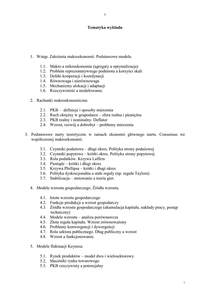 1 Tematyka wykładu 1. Wstęp. ZałoŜenia makroekonomii. Podstawowe modele. 1.1. 1.2. 1.3. 1.4. 1.5. 1.6. Makro a mikroekonomia (agregaty a optymalizacja) Problem reprezentatywnego podmiotu a korzyści skali Defekt kooperacji i koordynacji Równowaga i nierównowaga Mechanizmy alokacji i adaptacji Rzeczywistość a modelowanie. 2. Rachunki makroekonomiczne. 2.1. 2.2. 2.3. 2.4. PKB – definicje i sposoby mierzenia Ruch okręŜny w gospodarce – sfera realna i pienięŜna PKB realny i nominalny. Deflator Wzrost, rozwój a dobrobyt – problemy mierzenia 3. Podstawowe nurty teoretyczne w ramach ekonomii głównego nurtu. Consensus we współczesnej makroekonomii. 3.1. 3.2. 3.3. 3.4. 3.5. 3.6. 3.7. Czynniki podaŜowe – długi okres. Polityka strony podaŜowej Czynniki popytowe – krótki okres. Polityka strony popytowej Rola podatków. Krzywa Laffera Pieniądz – krótki i długi okres Krzywa Phillipsa – krótki i długi okres Polityka dyskrecjonalna a stałe reguły (np. reguła Taylora) Stabilizacja – sterowanie a teoria gier. 4. Modele wzrostu gospodarczego. Źródła wzrostu. 4.1. Istota wzrostu gospodarczego 4.2. Funkcje produkcji a wzrost gospodarczy 4.3. Źródła wzrostu gospodarczego (akumulacja kapitału, nakłady pracy, postęp techniczny) 4.4. Modele wzrostu – analiza porównawcza 4.5. Złota reguła kapitału. Wzrost zrównowaŜony 4.6. Problemy konwergencji i dywergencji 4.7. Rola sektora publicznego. Dług publiczny a wzrost 4.8. Wzrost a funkcjonowanie. 5. Modele fluktuacji Keynesa 5.1. Rynek produktów – model dwu i wielosektorowy 5.2. MnoŜniki rynku towarowego 5.3. PKB rzeczywisty a potencjalny 1 2 5.4. Równowaga rynku produktów, budŜet państwa i bilans handlowy 5.5. Paradoks oszczędności i mnoŜnik zrównowaŜonego budŜetu 6. Konsumpcja i inwestycje –krytyka ujęć keynesowskich 6.1. 6.2. 6.3. 6.4. 6.5. 6.6. 6.7. Międzyokresowe wybory konsumentów Dochód permanentny i dochód a cykl Ŝycia Konsumpcja a oszczędności Problem wielookresowych ograniczeń budŜetowych Problem ekwiwalencji Ricardo Funkcje inwestycji Stopa procentowa a nakłady pracy i kapitału. 7. Pieniądz i polityka monetarna 7.1. 7.2. 7.3. 7.4. 7.5. 7.6. 7.7. 7.8. Rola pieniądza w gospodarce. Agregaty i funkcje pieniądza Istota i narzędzia polityki monetarnej Banku Centralnego Mechanizm transmisyjny polityki monetarnej Funkcje popytu na pieniądz Polityka monetarna a rynki finansowe Państwo a rynek – kryzysy finansowe Instytucje rynku finansowego Przepływy kapitału i pieniądza w globalnej gospodarce – regulacja a deregulacja 7.9. Pieniądz, rynki finansowe a sfera realna. Problem dychotomii klasycznej. 8. Model IS - LM – współdziałanie rynków 8.1. 8.2. 8.3. 8.4. 8.5. 8.6. Właściwości krzywych IS i LM Wyprowadzanie krzywych Problem równowagi i nierównowagi w modelu Wzajemne oddziaływania rynku produktów i rynku finansowego Procesy dostosowawcze na rynkach Skuteczność i zawodność mechanizmów rynkowych 9. Model IS - LM – polityka fiskalna i monetarna. 9.1. 9.2. 9.3. 9.4. 9.5. Ekspansywna i restrykcyjna polityka fiskalna Ekspansywna i restrykcyjna polityka monetarna Skuteczność polityki fiskalnej i monetarnej Zalety i wady modelu IS – LM Problem inflacji – nominalna i realna stopa procentowa. 10. Polityka gospodarcza a gospodarka otwarta 10.1. 10.2. 10.3. 10.4. Rola oczekiwań – oczekiwania adaptacyjne a racjonalne. Krytyka Lucasa Państwo – regulacja i interwencja, za i przeciw. Polityka stabilizacyjna Polityka fiskalna a równowaga finansów publicznych. Złota reguła Dług publiczny i granice zadłuŜenia państwa 2 3 10.5. 10.6. 10.7. 10.8. 10.9. Problem dynamicznej niespójności Dostęp do wspólnego zasobu (CPR) Skuteczność polityki a system kursów Realne kursy walutowe Parytet siły nabywczej a parytet stopy procentowej bez pokrycia 11. Model IS – LM – BP 11.1. 11.2. 11.3. 11.4. 11.5. 11.6. Gospodarka otwarta – bilans płatniczy, kursy walutowe Właściwości krzywej BP Współdziałanie rynków w modelu Polityka monetarna i fiskalna a system kursów walutowych Skuteczność polityki fiskalnej i monetarnej Ograniczenia modelu i sposoby ich przezwycięŜenia. 12. Rynek pracy i bezrobocie 12.1. 12.2. 12.3. 12.4. 12.5. 12.6. 12.7. 12.8. Rynek pracy – ujęcie neoklasyczne, keynesowskie i instytucjonalne Instytucje rynku pracy Postęp techniczny a rynek pracy Popyt i podaŜ pracy a bezrobocie naturalne Przepływy na rynku pracy i bezrobocie równowagi. Segmentacja rynku pracy – heterogeniczność zasobów siły roboczej Istota i rodzaje bezrobocia. Bezrobocie dobrowolne a przymusowe Przyczyny bezrobocia – modele teoretyczne (teoria płacy efektywnościowej, teoria poszukiwań) 12.9. Histereza na rynku pracy. 13. Inflacja a bezrobocie 13.1. 13.2. 13.3. 13.4. 13.5. 13.6. 13.7. 13.8. Istota, rodzaje i przyczyny inflacji Inflacja jako zjawisko pienięŜne Seniorat Inflacja oczekiwana i rzeczywista Koszty inflacji Kontrowersje wokół krzywej Phillipsa (róŜne ujęcia) Sztywności nominalne i realne Polityka dezinflacji 14. Model AD – AS 14.1. 14.2. 14.3. 14.4. 14.5. 14.6. 14.7. Krzywa Phillipsa i prawo Okuna Wyprowadzanie krzywych AD i AS Krzywe AD i AS przy róŜnych kursach walutowych Rynek pracy a model AD-AS Procesy dostosowawcze w modelu przy lepkich cenach Wpływ polityki fiskalnej i monetarnej na zmienne realne Szoki podaŜowe i popytowe a polityka stabilizacyjna. Literatura: 3 4 1. Hall R.E., Taylor J.B.: Makroekonomia. Teoria, funkcjonowanie i polityka, Wydawnictwo Naukowe PWN, 2007. 2. Romer D.: Makroekonomia dla zaawansowanych, Wydawnictwo Naukowe PWN, Warszawa, 2000, rozdział 1 i 9. 3. Garbicz M., Golachowski E.: Elementarne modele makroekonomiczne, Oficyna Wydawnicza SGH, Warszawa, 2006 (V wydanie) 4. Burda M., Wypłosz Ch.: Makroekonomia podręcznik europejski, PWE, Warszawa, 2000. 4