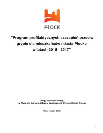 "Program profilaktycznych szczepień przeciw grypie dla mieszkańców miasta Płocka w latach 2015 - 2017" Program opracowany w Wydziale Zdrowia i Spraw Społecznych Urzędu Miasta Płocka Płock, styczeń 2015r. 1 1. Opis problemu zdrowotnego a) Problem zdrowotny Przedstawiony projekt programu zdrowotnego dotyczy dokładnie określonego problemu zdrowotnego, którego rozległość można oszacować i któremu można zapobiegać. Grypa – to ostra wirusowa choroba układu oddechowego, przenoszona pomiędzy ludźmi drogą kropelkową, najczęściej podczas kichania, kaszlu, rozmowy z osobą zakażoną. U zainfekowanej osoby wydalanie wirusów rozpoczyna się zwykle w przeddzień pojawienia się pierwszych objawów i może utrzymywać się przez następne 3 – 5 dni, dlatego rozprzestrzenianie się grypy jest tak szybkie. Okres inkubacji trwa około 3 - 7 dni. Charakterystyczne dla grypy jest to, że choroba najczęściej pojawia się nagle i towarzyszą jej objawy ze strony układu oddechowego: kaszel, ból gardła, katar, jak również objawy ogólnoustrojowe: wysoka temperatura powyżej 38ºC, dreszcze, ból, sztywność mięśni, ból głowy, ból w klatce piersiowej, złe samopoczucie, brak łaknienia, nudności, wymioty. Grypa charakteryzuje się wysoką zakaźnością, wywoływana jest przez 3 typy wirusa grypy należące do rodziny ortomyksowirusów: A, B i C. Najbardziej patogenny jest wirus typu A odpowiedzialny za pandemie i coroczne epidemie. Wywołuje zakażenia u ludzi i zwierząt, powodując czasem powikłania prowadzące do śmierci. Z kolei wirus typu B przyczynia się do wybuchów choroby co 2 – 4 lata wyłącznie u ludzi, zaś wirus typu C występuje zarówno u ludzi, jak i trzody chlewnej i odpowiedzialny jest za rzadkie przypadki łagodnych w przebiegu chorób układu oddechowego. Najbardziej charakterystyczną cechą wirusa grypy jest jego zmienność. Zmiana może przebiegać na dwa sposoby - przesunięcie antygenowe, które powoduje sezonowe epidemie grypy oraz skok antygenowy, który powoduje pandemie. Zmienność wirusa sprawia, że należy corocznie uaktualniać skład szczepionki przeciwko grypie. W umiarkowanym klimacie, takim jak nasz, wirus ten ma wyjątkowo dogodne warunki do przetrwania poza organizmem nosiciela, dlatego co roku w Polsce w okresie jesienno – zimowym mamy do czynienia ze zwiększoną zachorowalnością na grypę. Coroczne sezony grypowe wiążą się z absencją chorobową, wzrostem liczby zgonów, szczególnie osób w starszych grupach wiekowych, przeciążeniem instytucji medycznych i znacznymi kosztami społecznymi. Tym, co różni grypę od pozostałych infekcji układu oddechowego, jest znacznie wyższy wskaźnik groźnych dla zdrowia i życia powikłań, które może ona wywołać, szczególnie u osób z chorobami przewlekłymi. Zachorowanie na grypę zwiększa ryzyko wystąpienia niebezpiecznych incydentów sercowo – naczyniowych, takich jak zawał serca. Ponadto wirus grypy zwiększa ryzyko zaostrzenia choroby u pacjentów cierpiących na przewlekłą obturacyjną chorobę płuc (POChP) i astmę, prowadząc niejednokrotnie do hospitalizacji, a nawet powodując przypadki śmiertelne. Na poważne powikłania narażeni są pacjenci z cukrzycą. Najczęściej spotykanym powikłaniem grypy jest zapalenie płuc. Możliwe jest zaostrzenie współistniejącej choroby przewlekłej, rzadziej zapalenie opon mózgowo – rdzeniowych i mózgu, encefalopatia, zespół Guillaina – Barrego, poprzeczne zapalenie rdzenia, zapalenie mięśni, zapalenie mięśnia sercowego i osierdzia. Do grup ryzyka zalicza się również dzieci do 5 roku życia oraz dorosłych po 65 r.ż. Przebieg grypy u osób starszych, ryzyko wystąpienia powikłań, a przede wszystkim liczba hospitalizacji i zgonów z powodu grypy są znacznie wyższe niż u osób młodszych. W wyniku badań dowiedziono, że pacjenci powyżej 65 roku życia stanowią 63% wszystkich pacjentów leczonych z powodu grypy oraz że w tej grupie wiekowej odnotowuje się aż 85 – 90% zgonów z powodu grypy. Zgony te spowodowane ciężkim przebiegiem grypy lub jej powikłaniami występują przede wszystkim w wyniku zapalenia płuc lub niewydolności krążeniowo – oddechowej. Najskuteczniejszym sposobem zwalczania grypy jest profilaktyka, a jej podstawowym elementem swoista immunizacja w postaci szczepień przeciwgrypowych. Mimo zmienności dominującego w sezonie typu wirusa, co trudno jest przewidzieć, szczepienia, dzięki krzyżowej wrażliwości, są efektywne. Światowe Zgromadzenie Zdrowia w 2003r. wezwało kraje członkowskie do zwiększenia poziomu wyszczepialności osób z grup ryzyka, w tym w wieku podeszłym do 50% w 2006r. i 75% w 2010r. 2 b) Epidemiologia Według szacunków Światowej Organizacji Zdrowia (WHO) na całym świecie na grypę choruje co roku od 5 do 15% populacji, co oznacza od 330 do 1.575 milionów ludzi, 3-5 mln osób cierpi z powodu jej ostrych objawów i umiera w jej następstwie od pół miliona do miliona osób. Zakażenia wirusem grypy występują powszechnie w Polsce. Rejestruje się od kilkuset tysięcy do kilku milionów zachorowań na grypę w zależności od sezonu epidemicznego. Szczyt zachorowań ma miejsce zwykle między styczniem a marcem. Okresami, w których odnotowano najliczniejsze przypadki zachorowań na grypę w Polsce były lata 2010 – 2013 oraz sezon 2002/2003. Skokowy wzrost śmiertelności na grypę z 0 przypadków śmiertelnych w sezonach 2005/2006, 2006/2007, 2007/2008 oraz 2008/2009 aż do odpowiednio 177 i 187 zgonów w sezonach epidemicznych 2009/2010 i 2010/2011 oraz 119 w sezonie 2012/2013 . W sezonie epidemicznym 2012/2013 odnotowano alarmujące dane epidemiologiczne dotyczące zachorowań na grypę, o czym świadczy trzykrotnie wyższa liczba zachorowań i podejrzeń zachorowań na grypę w porównaniu z poprzednim okresem. Odnotowano ponad 2,9 miliona zachorowań i podejrzeń zachorowań na grypę, ponad 13 tysięcy związanyc
