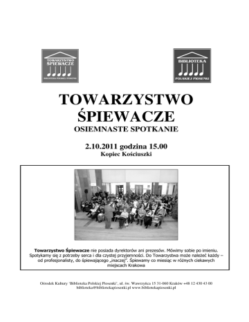 TOWARZYSTWO ŚPIEWACZE OSIEMNASTE SPOTKANIE 2.10.2011 godzina 15.00 Kopiec Kościuszki Towarzystwo Śpiewacze nie posiada dyrektorów ani prezesów. Mówimy sobie po imieniu. Spotykamy się z potrzeby serca i dla czystej przyjemności. Do Towarzystwa może należeć każdy – od profesjonalisty, do śpiewającego „inaczej”. Śpiewamy co miesiąc w różnych ciekawych miejscach Krakowa Ośrodek Kultury ‘Biblioteka Polskiej Piosenki’, ul. św. Wawrzyńca 15 31-060 Kraków +48 12 430 43 00 [email protected] www.bibliotekapiosenki.pl 2 1. WARSZAWO MA (Zakazane piosenki – Zofia Mrozowska) Warszawo ma, o, Warszawo ma, Wciąż płaczę gdy ciebie zobaczę, Warszawo, Warszawo ma! Tam w getcie głód, i nędza, i chłód, I gorsza od głodu, od chłodu, Tęsknota, Warszawo ma! Przez mur przekradam się I biegnę tu jak zgoniony pies! Choć tropi mnie pan władza, Żandarm, Gestapo i SS. Warszawo ma, tak w oku mym łza, Bo nie wiem, czy jeszcze zobaczę Cię jutro Warszawo ma! (2x) 3 2. PAMIĘTASZ, BYŁA JESIEŃ (Sława Przybylska) Pamiętasz, była jesień Mały hotel "Pod Różami", pokój numer osiem Staruszek portier z uśmiechem dał nam klucz. Na schodach niecierpliwie Całowałeś po kryjomu moje włosy Czy więcej złotych liści było wtedy Czy twych pieszczot, miły Dzisiaj nie wiem już. Odszedłeś potem nagle, drzwi otwarte Liść powiewem wiatru padł mi do nóg I wtedy zrozumiałam: to się kończy Pożegnania czas już przekroczyć próg Pamiętasz, była jesień Pokój numer osiem, korytarza mrok Już nigdy nie zapomnę hoteliku "Pod Różami" Choć już minął rok. Kochany, wróć do mnie, ja tęsknię za Tobą I niech rozstania, kochany, nie dzielą nas już Pociągi wstrzymać, niech nigdy już listonosz Złych listów nie przynosi pod hotelik róż. Odszedłeś potem nagle, drzwi otwarte.... 4 3. DESZCZ, JESIENNY DESZCZ Deszcz, jesienny deszcz Smutne pieśni gra, Mokną na nim karabiny, Hełmy kryje rdza. Nieś po błocie w dal, W zapłakany świat, Przemoczone pod plecakiem Osiemnaście lat. Gdzieś daleko stąd Noc zapada znów, Ciemna główka twej dziewczyny Chyli się do snu. Może właśnie dziś Patrzy w mroczną mgłę I modlitwą prosi Boga By zachował cię. Deszcz, jesienny deszcz Bębni w hełmy stal, Idziesz, młody żołnierzyku, Gdzieś w nieznaną dal. Może jednak Bóg Da, że wrócisz znów, będziesz tulił ciemną główkę Miłej twej do snu. 5 4. POBUDKA KRAKUSÓW Dalej, chłopcy, dalej żywo! Otwiera się dla nas żniwo, Rzućwa pługi, rzućwa radło, trza wojować, kiej tak padło. Niechaj baba gospodarzy, niech pilnują roli starzy, My parobcy, zagrodniki, rzućwa pługi, weźwa piki! Albośwa to jacy - jeno chłopcy Krakowiacy! Harda u nas dusa, nie boim się Rusa, Prusa! Dość nas natyrpali, bijwa Prusów i Moskali. Bierzwa za obuszki, pójdźwa wszyscy do Kościuszki! Bierzwa kosy, bierzwa dzidy, otrząśnijwa się z tej biedy, Bijwa wszyscy wraz Moskali, bo nas się dość natyrpali! Nauczwa szołdrę nygusa, że i w nas jest polska dusa, Jeszcze nasza polska kosa potrafi im utrzeć nosa! ref. Albośwa... Wymłócim ich jako snopy, cóż to? Bośwa to nie chłopy? Już ich strzelali za katy przy Słomnikach nasze braty: Zsiekli, skłuli, zmordowali, harmaciska odebrali, Odebrali konie, bryki, dukaciska i rubliki. ref. Albośwa... Jeszcze i nam Bóg poszczęści, nie żałujwa na nich pięści; Mamy ręce po pięć palców, bijwa dobrze tych zuchwalców! Poprzedajwa woły z wozem, spieszwa wszyscy za obozem, Poprzedajwa i poduszki, a przystajwa do Kościuszki! ref. Albośwa... 6 5. BABY, ACH TE BABY! ( A. Zaucha) Tylko spojrzeć się wkrąg, tyle pól, lasów, łąk, tak w słoneczku się mieni i lśni... Aż porywa i rwie, takie piękne są wsie, lecz piękniejsze są bardziej od tych wsi Kochane baby, ach! te baby, człek by je łyżkami jadł Tęgi chłop, co lekko w ręku łamie sztaby, względem baby jest tak, jak dziecko, całkiem słaby. Baby, ach! te baby, czym by bez nich był ten świat... Co tu grać, co tu kryć, spróbuj bez baby żyć, gdy ci uda się taka sztuka, toś jest chwat. Gdy wszystkiego masz dość, kiedy bierze cię złość, a na duszy ci smutno i źle... Kiedyś chmurny i zły, kiedy w oczach masz łzy, jedno tylko rozwieje troski twe: Kochane baby, ach! te baby, człek by je łyżkami jadł Tęgi chłop, co lekko w ręku łamie sztaby, względem baby jest tak, jak dziecko, całkiem słaby. Baby, ach! te baby, czym by bez nich był ten świat... Co tu grać, co tu kryć, spróbuj bez baby żyć, gdy ci uda się taka sztuka, toś jest chwat. 7 6. C'EST LA VIE... (A. Zaucha) C'est la vie - cały twój Paryż z pocztówek i mgły C'est la vie - wymyślony... C'est la vie - ciebie obchodzi, przejmujesz się tym. C'est la vie - podmiejski pociąg rozwozi twe dni C'est la vie - wciąż spóźniony... C'est la vie - cały twój Paryż, dwie drogi na krzyż Knajpa, kościół, widok z mostu Knajpa, kościół i ten bruk - ideał nie tknął go... Knajpa, kościół, widok z mostu Knajpa, kościół i ten bruk - tak realny... Zostałeś tu - ile można tak żyć na palcach Zostałeś tu - przez złudzenia Zostałeś tu - w Krakowie nocą wciaż grają walca Już na rogu kumple jak grzech Odwrotu już nie ma... Pamiętaj, że jest wiele serc, w których masz Miejsce swe... C'est la vie - cały twój Paryż z pocztówek i mgły C'est la vie - wymyślony... C'est la vie - cały twój Paryż, dwie drogi na krzyż Knajpa, kościół, widok z mostu Knajpa, kościół i ten bruk - ideał nie tknął go... C'est la vie.... 8 7. ALI BABA (A. Zaucha) Ali Baba, Arab z bajki, nie chce wina, ani fajki, Ali Baba śpi, choć gra muzyczka. Ali Baba chrapie w barze, choć arlekin tańczyć każe, Chociaż prosi go w tę noc księżniczka. Obudź się czarny Ali Babo, zdmuchnij z brody reszkę snu. Obudź się czarny Ali Babo, zatańcz ze mną tam i tu, i tam, i tu. Obudź się czarny Ali Babo, razem dobrze będzie nam. Obudź się cza
