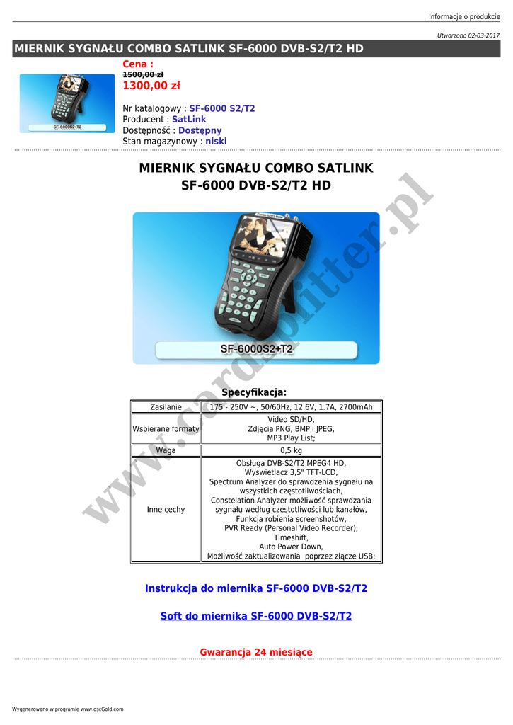 Informacje o produkcie Utworzono 02-03-2017 MIERNIK SYGNAŁU COMBO SATLINK SF-6000 DVB-S2/T2 HD Cena : 1500,00 zł 1300,00 zł Nr katalogowy : SF-6000 S2/T2 Producent : SatLink Dostępność : Dostępny Stan magazynowy : niski ar d sp lit te r .p l MIERNIK SYGNAŁU COMBO SATLINK SF-6000 DVB-S2/T2 HD Specyfikacja: Zasilanie 175 - 250V ~, 50/60Hz, 12.6V, 1.7A, 2700mAh Video SD/HD, Zdjęcia PNG, BMP i JPEG, MP3 Play List; Waga 0,5 kg Inne cechy Obsługa DVB-S2/T2 MPEG4 HD, Wyświetlacz 3,5" TFT-LCD, Spectrum Analyzer do sprawdzenia sygnału na wszystkich częstotliwościach, Constelation Analyzer możliwość sprawdzania sygnału według czestotliwości lub kanałów, Funkcja robienia screenshotów, PVR Ready (Personal Video Recorder), Timeshift, Auto Power Down, Możliwość zaktualizowania poprzez złącze USB; w w w .c Wspierane formaty Instrukcja do miernika SF-6000 DVB-S2/T2 Soft do miernika SF-6000 DVB-S2/T2 Gwarancja 24 miesiące Wygenerowano w programie www.oscGold.com