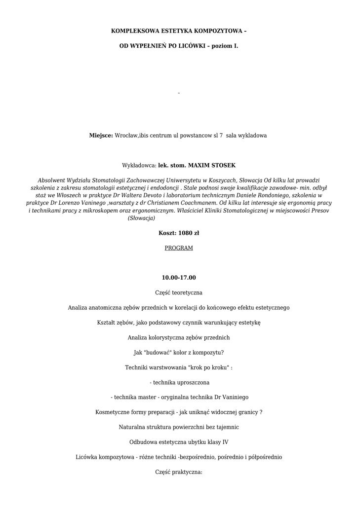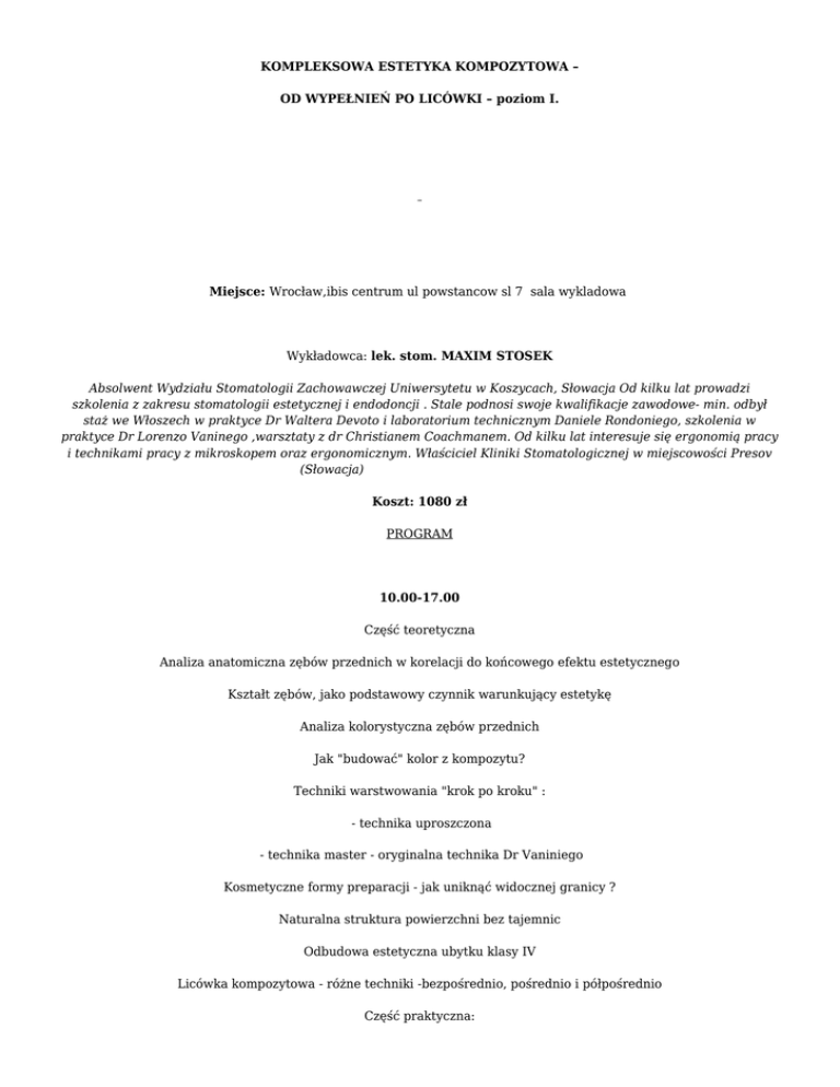 KOMPLEKSOWA ESTETYKA KOMPOZYTOWA – OD WYPEŁNIEŃ PO LICÓWKI – poziom I. Miejsce: Wrocław,ibis centrum ul powstancow sl 7 sala wykladowa Wykładowca: lek. stom. MAXIM STOSEK Absolwent Wydziału Stomatologii Zachowawczej Uniwersytetu w Koszycach, Słowacja Od kilku lat prowadzi szkolenia z zakresu stomatologii estetycznej i endodoncji . Stale podnosi swoje kwalifikacje zawodowe- min. odbył staż we Włoszech w praktyce Dr Waltera Devoto i laboratorium technicznym Daniele Rondoniego, szkolenia w praktyce Dr Lorenzo Vaninego ,warsztaty z dr Christianem Coachmanem. Od kilku lat interesuje się ergonomią pracy i technikami pracy z mikroskopem oraz ergonomicznym. Właściciel Kliniki Stomatologicznej w miejscowości Presov (Słowacja) Koszt: 1080 zł PROGRAM 10.00-17.00 Część teoretyczna Analiza anatomiczna zębów przednich w korelacji do końcowego efektu estetycznego Kształt zębów, jako podstawowy czynnik warunkujący estetykę Analiza kolorystyczna zębów przednich Jak "budować" kolor z kompozytu? Techniki warstwowania "krok po kroku" : - technika uproszczona - technika master - oryginalna technika Dr Vaniniego Kosmetyczne formy preparacji - jak uniknąć widocznej granicy ? Naturalna struktura powierzchni bez tajemnic Odbudowa estetyczna ubytku klasy IV Licówka kompozytowa - różne techniki -bezpośrednio, pośrednio i półpośrednio Część praktyczna: Odbudowa siekacza centralnego Wykonanie licówki kompozytowej Organizator: ESDENT Małgorzata Baziuk, ul. Pomarańczowa 8, 54-058 Wrocław tel. 071 353 83 51, 0 603 441 785 www.szkoleniadent.pl, [email protected] Opłaty za szkolenie prosimy dokonywać na 2 tygodnie przed planowanym kursem, na konto: ING BANK ŚLĄSKI S.A. 90105015751000002257704359 Firma ESDENT Małgorzata Baziuk jest podmiotem uprawnionym do podyplomowego kształcenia lekarzy i lekarzy dentystów. Za każdy kurs medyczny przyznawane są punkty edukacyjne według obowiązujących przepisów.