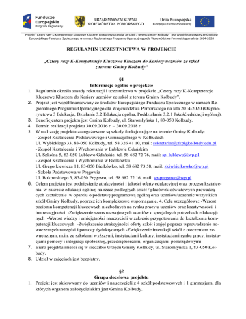 Projekt" Cztery razy K-Kompetencje Kluczowe Kluczem do Kariery uczniów ze szkół z terenu Gminy Kolbudy" jest współfinansowany ze środków Europejskiego Funduszu Społecznego w ramach Regionalnego Programu Operacyjnego dla Województwa Pomorskiego na lata 2014-2020 REGULAMIN UCZESTNICTWA W PROJEKCIE „Cztery razy K-Kompetencje Kluczowe Kluczem do Kariery uczniów ze szkół z terenu Gminy Kolbudy” 1. 2. 3. 4. 5. 6. 7. 8. §1 Informacje ogólne o projekcie Regulamin określa zasady rekrutacji i uczestnictwa w projekcie „Cztery razy K-Kompetencje Kluczowe Kluczem do Kariery uczniów ze szkół z terenu Gminy Kolbudy”. Projekt jest współfinansowany ze środków Europejskiego Funduszu Społecznego w ramach Regionalnego Programu Operacyjnego dla Województwa Pomorskiego na lata 2014-2020 (Oś priorytetowa 3 Edukacja, Działanie 3.2 Edukacja ogólna, Poddziałanie 3.2.1 Jakość edukacji ogólnej). Beneficjentem projektu jest Gmina Kolbudy, ul. Staromłyńska 1, 83-050 Kolbudy. Termin realizacji projektu 30.09.2016 r. – 30.09.2018 r. W realizację projektu zaangażowane są szkoły funkcjonujące na terenie Gminy Kolbudy: - Zespół Kształcenia Podstawowego i Gimnazjalnego w Kolbudach Ul. Wybickiego 33, 83-050 Kolbudy, tel. 58 326 41 10, mail: [email protected] - Zespół Kształcenia i Wychowania w Lublewie Gdańskim Ul. Szkolna 5, 83-050 Lublewo Gdańskie, tel. 58 682 72 76, mail: [email protected] - Zespół Kształcenia i Wychowania w Bielkówku Ul. Gregorkiewicza 11, 83-050 Bielkówko, tel. 58 682 73 58, mail: [email protected] - Szkoła Podstawowa w Pręgowie Ul. Bukowskiego 3, 83-050 Pręgowo, tel. 58 682 72 16, mail: [email protected] Celem projektu jest podniesienie atrakcyjności i jakości oferty edukacyjnej oraz procesu kształcenia w zakresie edukacji ogólnej na rzecz podległych szkół / placówek oświatowych prowadzących kształcenie w oparciu o podstawę programową ogólną oraz uczniów/uczennic wszystkich szkół Gminy Kolbudy, poprzez ich kompleksowe wspomaganie. 4. Cele szczegółowe: -Wzrost poziomu kompetencji kluczowych niezbędnych na rynku pracy u uczniów oraz kreatywności i innowacyjności -Zwiększenie szans rozwojowych uczniów o specjalnych potrzebach edukacyjnych -Wzrost wiedzy i umiejętności nauczycieli w zakresie przygotowania do kształcenia kompetencji kluczowych -Zwiększenie atrakcyjności oferty szkół i zajęć poprzez wprowadzenie nowoczesnych narzędzi i pomocy dydaktycznych -Zwiększenie interakcji szkół z otoczeniem zewnętrznym, m.in. ze szkołami wyższymi, instytucjami kultury, instytucjami rynku pracy, instytucjami pomocy i integracji społecznej, przedsiębiorcami, organizacjami pozarządowymi Biuro projektu mieści się w siedzibie Urzędu Gminy Kolbudy, ul. Staromłyńska 1, 83-050 Kolbudy. Udział w zajęciach jest bezpłatny. §2 Grupa docelowa projektu 1. Projekt jest skierowany do uczniów i nauczycieli z 4 szkół podstawowych i 1 gimnazjum, dla których organem założycielskim jest Gmina Kolbudy. Projekt" Cztery razy K-Kompetencje Kluczowe Kluczem do Kariery uczniów ze szkół z terenu Gminy Kolbudy" jest współfinansowany ze środków Europejskiego Funduszu Społecznego w ramach Regionalnego Programu Operacyjnego dla Województwa Pomorskiego na lata 2014-2020 2. Do projektu Gmina Kolbudy zakwalifikuje nie mniej niż 1019 uczniów i 56 nauczycieli. 3. W ramach projektu przeprowadzone zostaną zajęcia zgodnie z poniższą tabelą: łączna liczba łączna liczba uczniów godzin Zespół Kształcenia Podstawowego i Gimnazjalnego w Kolbudach - GIMNAZJUM Nazwa szkoły Zajęcia matematyczno-przyrodnicze Zajęcia lingwistyczne Zajęcia doradztwa zawodowego 192 1800 48 450 48 300 16 150 152 1626 80 750 24 450 24 225 74 1260 74 630 74 344 74 192 144 960 32 240 32 240 144 320 Zajęcia interdyscyplinarne z wykorzystaniem TIK Zespół Kształcenia Podstawowego i Gimnazjalnego w Kolbudach - PODSTWÓWKA Zajęcia matematyczno-przyrodnicze Zajęcia lingwistyczne Zajęcia specjalistyczne (logoped., psycholog. Pedagog. Zajęcia komputerowe z uwzględnieniem bezpieczeństwa w cyberprzestrzeni Zespół Kształcenia i Wychowania w Lublewie Gdańskim Zajęcia lingwistyczne Zajęcia z matematyki metodą innowacyjną „kuferek tajemnic” Zajęcia logopedyczne Zajęcia z wykorzystaniem technologii TIK Zespół Kształcenia i Wychowania w Bielkówku Interaktywne warsztaty z jęz. angielskiego Badawcze warsztaty przyrodnicze Zajęcia z kreatywnej matematyki Zajęcia z fotografii filmowania i grafiki komputerowej Projekt" Cztery razy K-Kompetencje Kluczowe Kluczem do Kariery uczniów ze szkół z terenu Gminy Kolbudy" jest współfinansowany ze środków Europejskiego Funduszu Społecznego w ramach Regionalnego Programu Operacyjnego dla Województwa Pomorskiego na lata 2014-2020 Warsztaty informatyczne z kodowania Warsztaty informatyczne z elementami robotyki 32 80 32 80 169 560 169 210 169 160 169 450 5 nd 56 nd Szkoła odstawowa w Pręgowie Zajęcia lingwistyczne Zajęcia informatyczne Warsztaty programowania i robotyka Zajęcia matematyczno-przyrodnicze Nauczyciele Studia podyplomowe kursy dla nauczycieli 4. Dla potrzeb realizacji zadań zakupione będą materiały dydaktyczne i przekazane uczniom i nauczycielom biorącym udział w projekcie. 5. Zajęcia stacjonarne dla uczniów, co do zasady odbywać się będą na terenie szkół objętych projektem. W ramach projektu przewidziano realizację części zajęć we współpracy z otoczeniem zewnętrznym poprzez łączenie zajęć stacjonarnych z wyjazdami/wyjściami edukacyjnymi oraz realizację osobnych edukacyjnych form wsparcia o charakterze wyjazdowym. 6. Szkoły udostępnią sale, zakupione wyposażenie i niezbędne materiały dydaktyczne i biurowe do realizacji zajęć dla uczniów, zgodnie z ich charakterem i potrzebami programowymi. We wszystkich przewidzianych formach wsparcia dla uczniów i nauczycieli, przewiduje się wykorzystanie narzędzi ICT, które będą zakupion