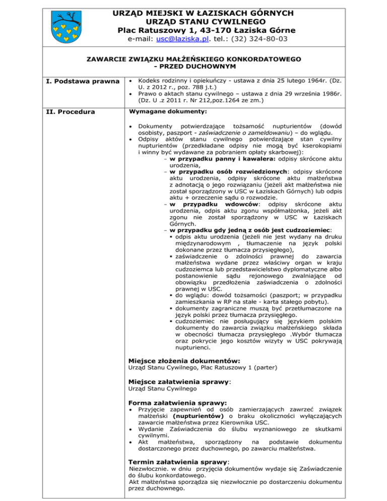 URZĄD MIEJSKI W ŁAZISKACH GÓRNYCH URZĄD STANU CYWILNEGO Plac Ratuszowy 1, 43-170 Łaziska Górne e-mail: [email protected]. tel.: (32) 324-80-03 ZAWARCIE ZWIĄZKU MAŁŻEŃSKIEGO KONKORDATOWEGO - PRZED DUCHOWNYM I. Podstawa prawna II. Procedura Kodeks rodzinny i opiekuńczy - ustawa z dnia 25 lutego 1964r. (Dz. U. z 2012 r., poz. 788 j.t.) Prawo o aktach stanu cywilnego – ustawa z dnia 29 września 1986r. (Dz. U .z 2011 r. Nr 212,poz.1264 ze zm.) Wymagane dokumenty: Dokumenty potwierdzające tożsamość nupturientów (dowód osobisty, paszport - zaświadczenie o zameldowaniu) – do wglądu. Odpisy aktów stanu cywilnego potwierdzające stan cywilny nupturientów (przedkładane odpisy nie mogą być kserokopiami i winny być wydawane za pobraniem opłaty skarbowej): w przypadku panny i kawalera: odpisy skrócone aktu urodzenia, w przypadku osób rozwiedzionych: odpisy skrócone aktu urodzenia, odpisy skrócone aktu małżeństwa z adnotacją o jego rozwiązaniu (jeżeli akt małżeństwa nie został sporządzony w USC w Łaziskach Górnych) lub odpis aktu + orzeczenie sądu o rozwodzie. w przypadku wdowców: odpisy skrócone aktu urodzenia, odpis aktu zgonu współmałżonka, jeżeli akt zgonu nie został sporządzony w USC w Łaziskach Górnych. w przypadku gdy jedną z osób jest cudzoziemiec: odpis aktu urodzenia (jeżeli nie jest wydany na druku międzynarodowym , tłumaczenie na język polski dokonane przez tłumacza przysięgłego), zaświadczenie o zdolności prawnej do zawarcia małżeństwa wydane przez właściwy organ w kraju cudzoziemca lub przedstawicielstwo dyplomatyczne albo postanowienie sądu rejonowego zwalniające od obowiązku przedłożenia zaświadczenia o zdolności prawnej w USC. do wglądu: dowód tożsamości (paszport; w przypadku zamieszkania w RP na stałe - karta stałego pobytu). dokumenty zagraniczne muszą być przetłumaczone na język polski przez tłumacza przysięgłego. cudzoziemiec nie posługujący się językiem polskim dokumenty do zawarcia związku małżeńskiego składa w obecności tłumacza przysięgłego .Wybór tłumacza oraz pokrycie jego kosztów wizyty w USC pokrywają nupturienci. Miejsce złożenia dokumentów: Urząd Stanu Cywilnego, Plac Ratuszowy 1 (parter) Miejsce załatwienia sprawy: Urząd Stanu Cywilnego Forma załatwienia sprawy: Przyjęcie zapewnień od osób zamierzających zawrzeć związek małżeński (nupturientów) o braku okoliczności wyłączających zawarcie małżeństwa przez Kierownika USC. Wydanie Zaświadczenia do ślubu wyznaniowego ze skutkami cywilnymi. Akt małżeństwa, sporządzony na podstawie dokumentu dostarczonego przez duchownego, po zawarciu małżeństwa. Termin załatwienia sprawy: Niezwłocznie. w dniu przyjęcia dokumentów wydaje się Zaświadczenie do ślubu konkordatowego. Akt małżeństwa sporządza się niezwłocznie po dostarczeniu dokumentu przez duchownego. Odbiór dokumentu: W Urzędzie Stanu Cywilnego Tryb odwoławczy: Wniosek do Sądu Rejonowego w Mikołowie w terminie 14 dni od dnia doręczenia pisma Kierownika USC o przyczynach odmowy. III. Opłaty/kaucja Opłata skarbowa: Za wydanie zaświadczenia opłaty nie pobiera się. Za sporządzenie aktu małżeństwa - 84,00 zł. Zapłaty opłaty skarbowej dokonuje się na konto tego urzędu, który jest właściwy ze względu na miejsce zawarcia małżeństwa (w tej samej miejscowości, co parafia). Gdy małżeństwo ma być zawarte na terenie miasta Łaziska Górne, opłaty dokonuje się: w kasie Urzędu Miejskiego w Łaziskach Górnych – kasa czynna od poniedziałku do piątku w godz. 7.30 -15.30, w poniedziałki 7.30 – 17.00. Plac Ratuszowy 1 lub na konto przelewem na rachunek bankowy Urzędu Miejskiego: Orzesko-Knurowski Bank Spółdzielczy, nr 42 8454 1066 2004 0010 0117 0010 Dowód zapłaty należnej opłaty skarbowej należy dołączyć do wniosku. Oryginał dowodu zapłaty może zostać zwrócony podmiotowi dokonującemu zapłaty wyłącznie na żądanie. IV. Dodatkowe informacje Zaświadczenie o braku okoliczności wyłączających zawarcie małżeństwa ważne jest trzy miesiące od daty jego wystawienia. Zaświadczenie jest wydawane w USC miejscu stałego zameldowania jednej z osób zamierzającej zawrzeć związek małżeński.