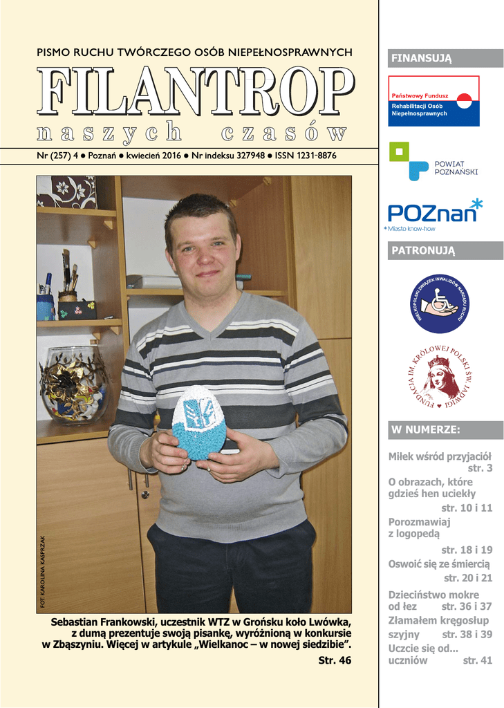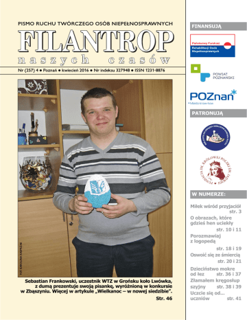 PISMO RUCHU TWÓRCZEGO OSÓB NIEPEŁNOSPRAWNYCH FINANSUJĄ Nr (257) 4 Poznań kwiecień 2016 Nr indeksu 327948 ISSN 1231-8876 PATRONUJĄ W NUMERZE: FOT. KAROLINA KASPRZAK Miłek wśród przyjaciół str. 3 O obrazach, które gdzieś hen uciekły str. 10 i 11 Porozmawiaj z logopedą str. 18 i 19 Oswoić się ze śmiercią str. 20 i 21 Sebastian Frankowski, uczestnik WTZ w Grońsku koło Lwówka, z dumą prezentuje swoją pisankę, wyróżnioną w konkursie w Zbąszyniu. Więcej w artykule „Wielkanoc – w nowej siedzibie”. Str. 46 Dzieciństwo mokre od łez str. 36 i 37 Złamałem kręgosłup str. 38 i 39 szyjny Uczcie się od... uczniów str. 41 STRONA KWIECIEŃ 2016 1% dla WZINR Za sukcesy w mistrzostwach Polski U W ielkopolski Związek Inwalidów Narządu Ruchu zajmuje się organizowaniem czasu wolnego swoich członków, prowadzi Warsztat Terapii Zajęciowej w Owińskach, organizuje szkolenia mające ułatwić znalezienie pracy, pomaga osobom zagrożonym wykluczeniem społecznym, realizowane są różnego rodzaju kursy. Niezbędna jest w tym celu większa siedziba, ułatwiająca tego rodzaju działalność. Konieczny jest remont zabytkowego budynku będącego siedzibą wspomnianego WTZ. Podjęto działania na rzecz utworzenia zakładu aktywności zawodowej, planuje się powołanie spółdzielni socjalnej zatrudniającej osoby z niepełnosprawnością. Pomożesz nam w naszej pracy rzecz osób niepełnosprawnych, wpisując KRS 0000239124 z dopiskiem „na cele statutowe” w zeznaniu podatkowym za rok 2015. czniowie Specjalnego Ośrodka Szkolno-Wychowawczego dla Dzieci Niewidomych im. Synów Pułku w Owińskach otrzymali wyróżnienia sportowe za sukcesy w mistrzostwach Polski w tenisie stołowym dźwiękowym. Wręczał je Jan Grabkowski, starosta poznański 23 marca w Sali Sesyjnej Starostwa Powiatowego w Poznaniu. Najlepszym zawodnikom oraz trenerom 2015 roku, działającym na terenie powiatu, przyznano nagrody. Wyrazy uznania dla sportowców wpisały się w XV sesję Rady Powiatu. Zaangażowanych w różne dziedziny sportu (m.in. kolarstwo, zapasy, kajakarstwo, badminton, piłka ręczna, unihokej) uhonorowano w następujących kategoriach wiekowych: młodzik, junior młodszy, junior starszy, młodzieżowiec i trener. W kategorii młodzik pierwszej nagrody nie przyznano, w kategorii junior młodszy – pierwszą nagrodę otrzymała Karolina Przybylak z Uczniowskiego Klubu Sportowego „Jedynka” w Kórniku, w kategorii junior starszy – Weronika Humelt (UKS „Jedynka” w Kórniku), w kategorii młodzieżowiec – Patryk Rajkowski (UKS „Jedynka” w Kórniku), a w kategorii trener – Robert Taciak (UKS „Jedynka” w Kórniku). Wyróżnienia sportowe odebrali uczniowie Zespołu Szkół nr 1 w Swarzędzu, Grzegorz Mazurek, trener ze Swarzędzkiego Klubu Sportowego „Unia Swarzędz” oraz wyżej wspomniani uczniowie SOS-W dla Dzieci Niewidomych w Owińskach – Natalia Marendziak, Nikola Oleksiak, Damian Królikowski i Oskar Piosik. Udziałem w mistrzostwach Polski w tenisie stołowym dźwiękowym, których pomysłodawcą jest nauczyciel SOS-W Leszek Szmaj, dowiedli że ludzie z niepełnosprawnościami mają sportowe pasje i pragną osiągać FOT. WWW.POWIAT.POZNAN.PL 2 Jan Grabkowski, starosta poznański (z lewej) wręczył wyróżnienia sportowe uczniom Specjalnego Ośrodka Szkolno-Wychowawczego dla Dzieci Niewidomych w Owińskach. sukcesy na równi z osobami pełnosprawnymi. Tomasz Łubiński, wicestarosta poznański przybliżył przedsięwzięcia sportowe, do których zalicza się m.in. turniej tenisowy „Powiat Poznański Open” oraz wydarzenia wspierające rozwój aktywności fizycznej osób z niepełnosprawnościami. KAROLINA KASPRZAK BŁAŻEJ FRIEDRICH Nocne szkolenia C złonkowie Stowarzyszenia „Absolwenci na walizkach” 12 marca zorganizowali „Noc Szkoleń” pod hasłem „Kariera na miękko i na twardo” w Gdańsku, Krakowie, Lublinie, Opolu, Starogardzie Gdańskim, Szczecinie, Warszawie, Zabrzu, Żyrardowie i Poznaniu. Celem było wsparcie przy poszukiwaniu pracy i jej utrzymaniu. Uczestnicy poznali swoje możliwości i wiedzę o tym, jak przejść pozytywnie rekrutację. „Noc Szkoleń” trwała do rana. awa 7ZyMSRGDWNX 7ZyMSRGDWNX SRPRĪHQDPVNXWHF]QLHMZDOF]\üREH]ZDUXQNRZHX]QDQLH OXG]NLHMJRGQRĞFLRVyEQLHSHáQRVSUDZQ\FK LLFKZV]HFKVWURQQHMREHFQRĞFLZĪ\FLXVSRáHF]Q\P 7DNLMHVWFHORJyOQRSROVNLHJRPLHVLĊF]QLND Ä)LODQWURS1DV]\FK&]DVyZ´ :HVSU]HV]QDVZSLVXMąF.56 ]GRSLVNLHPÄQDFHOHVWDWXWRZH´ Z]H]QDQLXSRGDWNRZ\P]DURN STRONA KWIECIEŃ 2016 Karolina Kasprzak POZNAŃ M iłosz Bronisz, 12-letni chłopiec z fokomelią (wadą rozwojową kończyn) ujął swoją dzielnością uczniów klas trzecich Szkoły Podstawowej im. Jana Pawła II w Tarnowie Podgórnym. Spotkanie to zorganizowała 8 marca Fundacja Pomocy Osobom Niepełnosprawnym „Filantrop”. Kolejne podobne spotkania realizowane będą w ramach zadania publicznego pod nazwą „Wydawanie miesięcznika „Filantrop Naszych Czasów”, współfinansowanego przez Powiat Poznański. Miłek przyjechał do dzieci ze swoją mamą Kamillą i Marcinem Bajerowiczem, przewodniczącym Zarządu Fundacji na zaproszenie dy- 3 Miłek wśród przyjaciół rekcji szkoły. Dotarł tam prosto ze swojej szkoły w Poznaniu, gdzie brał udział w konkursie przyrodniczym „Świetlik”. Zadania udało mu się rozwiązać bez problemu. Samodzielnie przygotował prezentację multimedialną, która przybliżyła to, co lubi robić na co dzień. Dzieci były żywo zainteresowane licznymi umiejętnościami Miłosza – pływaniem, nurkowaniem, jazdą na snowboardzie. Chłopiec opowiedział o swoich marzeniach. Kiedy dorośnie, chciałby założyć hotel dla zwierząt i być mówcą motywacyjnym jak au- Pokaz rysowania stopą wzbudził ciekawość małych słuchaczy. To nie powód, aby się z niego śmiać. Można się zakolegować, zaprzyjaźnić, mieć z taką osobą wspaniałe przygody. W mojej Chrześcijańskiej Szkole Podstawowej