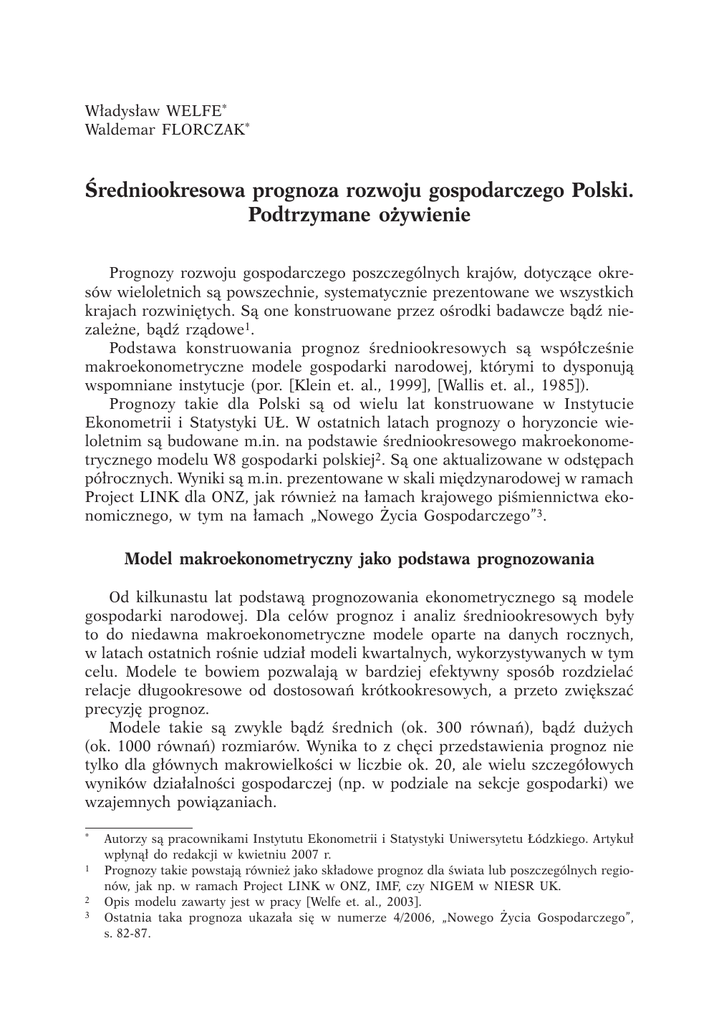 Władysław WELFE* Waldemar FLORCZAK* Średniookresowa prognoza rozwoju gospodarczego Polski. Podtrzymane ożywienie Prognozy rozwoju gospodarczego poszczególnych krajów, dotyczące okresów wieloletnich są powszechnie, systematycznie prezentowane we wszystkich krajach rozwiniętych. Są one konstruowane przez ośrodki badawcze bądź niezależne, bądź rządowe. Podstawa konstruowania prognoz średniookresowych są współcześnie makroekonometryczne modele gospodarki narodowej, którymi to dysponują wspomniane instytucje (por. [Klein et. al., 1999], [Wallis et. al., 1985]). Prognozy takie dla Polski są od wielu lat konstruowane w Instytucie Ekonometrii i Statystyki UŁ. W ostatnich latach prognozy o horyzoncie wieloletnim są budowane m.in. na podstawie średniookresowego makroekonometrycznego modelu W8 gospodarki polskiej. Są one aktualizowane w odstępach półrocznych. Wyniki są m.in. prezentowane w skali międzynarodowej w ramach Project LINK dla ONZ, jak również na łamach krajowego piśmiennictwa ekonomicznego, w tym na łamach „Nowego Życia Gospodarczego”. Model makroekonometryczny jako podstawa prognozowania Od kilkunastu lat podstawą prognozowania ekonometrycznego są modele gospodarki narodowej. Dla celów prognoz i analiz średniookresowych były to do niedawna makroekonometryczne modele oparte na danych rocznych, w latach ostatnich rośnie udział modeli kwartalnych, wykorzystywanych w tym celu. Modele te bowiem pozwalają w bardziej efektywny sposób rozdzielać relacje długookresowe od dostosowań krótkookresowych, a przeto zwiększać precyzję prognoz. Modele takie są zwykle bądź średnich (ok. 300 równań), bądź dużych (ok. 1000 równań) rozmiarów. Wynika to z chęci przedstawienia prognoz nie tylko dla głównych makrowielkości w liczbie ok. 20, ale wielu szczegółowych wyników działalności gospodarczej (np. w podziale na sekcje gospodarki) we wzajemnych powiązaniach. * Autorzy są pracownikami Instytutu Ekonometrii i Statystyki Uniwersytetu Łódzkiego. Artykuł wpłynął do redakcji w kwietniu 2007 r. Prognozy takie powstają również jako składowe prognoz dla świata lub poszczególnych regionów, jak np. w ramach Project LINK w ONZ, IMF, czy NIGEM w NIESR UK. Opis modelu zawarty jest w pracy [Welfe et. al., 2003]. Ostatnia taka prognoza ukazała się w numerze 4/2006, „Nowego Życia Gospodarczego”, s. 82‑87. 86 GOSPODARKA NARODOWA Nr 5-6/2007 Podstawowe makrowielkości obejmują zazwyczaj PKB oraz jego główne składniki – popyt gospodarstw domowych i instytucji publicznych, inwestycje w środki trwałe i przyrost zapasów, generowanie popytu i podaży siły roboczej oraz bezrobocia, zaś w bardziej rozbudowanych modelach – generowanie potencjalnego PKB w wyniku zastosowania czynników produkcji, przy uwzględnieniu łącznej produktywności tych czynników, zależnej od krajowych i transferowanych z zagranicy nakładów na B+R oraz od kapitału ludzkiego. W modelach tych występują podsystemy cen i płac oraz układy równań zamykające system, opisujące przepływy finansowe. Prognozy oparte na modelach makroekonometrycznych mają szczególne cechy, wynikające z właściwości tych modeli (por. [McNees, 1991]). Po pierwsze, podstawowe równania modeli są nieliniowe (np. funkcje konsumpcji lub produkcji), co sprawia, iż dla estymacji ich parametrów trzeba używać metod niekonwencjonalnych. Podobnie dla celów symulacji (w tym prognozowania) niezbędne jest użycie metod iteracyjnych, a w szczególności specjalistycznych programów komputerowych. Programy te są zwykle tak zbudowane, że umożliwiają interwencję prognostyka w otrzymaną w mechaniczny sposób prognozę (patrz [Whitley, 1994]). Po wtóre, równania modeli odwzorowują powiązania o charakterze dynamicznym tj. opóźnienia w dostosowaniach (np. w rezultacie podniesienia stóp procentowych), inercję procesów, przez wyróżnienie relacji długookresowych i krótkookresowych. Umożliwia to stosowanie nowoczesnych metod estymacji opartych na idei kointegracji. Po trzecie – co najważniejsze – jedynie makromodele odwzorowują jednoczesne związki występujące w gospodarce narodowej, co pozwala w prognozach uwzględniać nie tylko bezpośrednie, ale także pośrednie efekty zaburzeń, czy to zewnętrznych czy to wywołanych zmianami polityki gospodarczej. Do najbardziej znanych należą związki opisane poprzez mnożnik konsumpcyjny-pobudzenie popytu konsumpcyjnego (np. wywołane przez przyrost dochodów gospodarstw domowych w wyniku przyrostu wydatków budżetu na cele socjalne) pociąga za sobą przyrost PKB (po uwzględnieniu konkurencyjnego przyrostu importu), a następnie opóźniony przyrost zatrudnienia oraz przyrost dochodów gospodarstw domowych i pośrednio dodatkowy przyrost popytu konsumpcyjnego. Innego typu jednoczesne związki występują w procesie generowania inwestycji (zasada akceleratora). Przyrost inwestycji w środki trwałe np. w efekcie przyrostu zagranicznych inwestycji bezpośrednich lub wykorzystania dodatkowych środków unijnych – pociąga za sobą przyrost PKB i po uwzględnieniu konkurencyjnego importu inwestycyjnego – przyrost stopnia wykorzystania istniejącego potencjału, a w dalszej kolejności przyrost popytu na nowe maszyny i urządzenia, co zamyka omawiane sprzężenie. Przyrost popytu zagranicy prowadzi bezpośrednio – poprzez wzrost eksportu – do przyrostu PKB, pośrednio pobudzając popyt konsumpcyjny i inwestycyjny poprzez opisane wyżej sprzężenia zwrotne. Władysław Welfe, Waldemar Florczak, Średniookresowa prognoza rozwoju gospodarczego... 87 Warto również podkreślić, iż równania makromodeli pozwalają obserwować i prognozować procesy inflacyjne przy wykorzystaniu pętli inflacyjnej (z wbudowanym mechanizmem tłumienia inflacji), rozbudowanej o związki z wahaniami cen światowych, jak również poprzez zmiany kursu walutowego (importowana inflacja), a także kształtowanie stóp