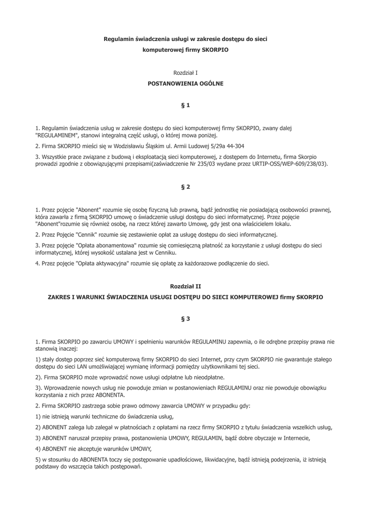 Regulamin świadczenia usługi w zakresie dostępu do sieci komputerowej firmy SKORPIO Rozdział I POSTANOWIENIA OGÓLNE §1 1. Regulamin świadczenia usług w zakresie dostępu do sieci komputerowej firmy SKORPIO, zwany dalej "REGULAMINEM", stanowi integralną część usługi, o której mowa poniżej. 2. Firma SKORPIO mieści się w Wodzisławiu Śląskim ul. Armii Ludowej 5/29a 44-304 3. Wszystkie prace związane z budową i eksploatacją sieci komputerowej, z dostępem do Internetu, firma Skorpio prowadzi zgodnie z obowiązującymi przepisami(zaświadczenie Nr 235/03 wydane przez URTIP-OSS/WEP-609/238/03). §2 1. Przez pojęcie "Abonent" rozumie się osobę fizyczną lub prawną, bądź jednostkę nie posiadającą osobowości prawnej, która zawarła z firmą SKORPIO umowę o świadczenie usługi dostępu do sieci informatycznej. Przez pojęcie "Abonent"rozumie się również osobę, na rzecz której zawarto Umowę, gdy jest ona właścicielem lokalu. 2. Przez Pojęcie "Cennik" rozumie się zestawienie opłat za usługę dostępu do sieci informatycznej. 3. Przez pojęcie "Opłata abonamentowa" rozumie się comiesięczną płatność za korzystanie z usługi dostępu do sieci informatycznej, której wysokość ustalana jest w Cenniku. 4. Przez pojęcie "Opłata aktywacyjna" rozumie się opłatę za każdorazowe podłączenie do sieci. Rozdział II ZAKRES I WARUNKI ŚWIADCZENIA USŁUGI DOSTĘPU DO SIECI KOMPUTEROWEJ firmy SKORPIO §3 1. Firma SKORPIO po zawarciu UMOWY i spełnieniu warunków REGULAMINU zapewnia, o ile odrębne przepisy prawa nie stanowią inaczej: 1) stały dostęp poprzez sieć komputerową firmy SKORPIO do sieci Internet, przy czym SKORPIO nie gwarantuje stałego dostępu do sieci LAN umożliwiającej wymianę informacji pomiędzy użytkownikami tej sieci. 2). Firma SKORPIO może wprowadzić nowe usługi odpłatne lub nieodpłatne. 3). Wprowadzenie nowych usług nie powoduje zmian w postanowieniach REGULAMINU oraz nie powoduje obowiązku korzystania z nich przez ABONENTA. 2. Firma SKORPIO zastrzega sobie prawo odmowy zawarcia UMOWY w przypadku gdy: 1) nie istnieją warunki techniczne do świadczenia usług, 2) ABONENT zalega lub zalegał w płatnościach z opłatami na rzecz firmy SKORPIO z tytułu świadczenia wszelkich usług, 3) ABONENT naruszał przepisy prawa, postanowienia UMOWY, REGULAMIN, bądź dobre obyczaje w Internecie, 4) ABONENT nie akceptuje warunków UMOWY, 5) w stosunku do ABONENTA toczy się postępowanie upadłościowe, likwidacyjne, bądź istnieją podejrzenia, iż istnieją podstawy do wszczęcia takich postępowań. Rozdział III ZAWARCIE UMOWY §4 1. Podstawą do korzystania z usług firmy SKORPIO jest zawarcie UMOWY o świadczenie usługi dostępu do sieci informatycznej w tym przekazanie na czas korzystania z usług firmy SKORPIO sprzętu niezbędnego do korzystania z sieci firmy SKORPIO. 2. Umowa jest zawierana w formie pisemnej pomiędzy ABONENTEM a firmą SKORPIO, reprezentowaną przez osoby upoważnione. 3. Po stronie ABONENTA UMOWĘ mogą zawierać osoby fizyczne, osoby prawne lub inne jednostki organizacyjne nie posiadające osobowości prawnej. 4. Zawarcie UMOWY z osobami wymienionymi w ust. 3 jest możliwe jeżeli: 1) uprawnione podmioty (organy) wyrażą zgodę na wykonanie instalacji i eksploatację urządzeń w mieszkaniu (lokalu) lub budynku, 2) osoby, o których mowa w ust. 3 posiadają tytuł prawny do mieszkania (lokalu). W przypadku, gdy osoba ta posiada pochodne prawo do lokalu np.: prawo najmu, dzierżawy, spółdzielcze lokatorskie i własnościowe prawo do lokalu mieszkalnego, zawarcie UMOWY wymaga zgody właściciela lokalu. 5. Zgoda, o której mowa w ust. 4 pkt. 2 jest dołączana do UMOWY. 6. UMOWA może zawierać regulacje dotyczące zabezpieczenia praw SKORPIO np.: umowa poręczenia, umowa zastawu itd. §5 1. Z chwilą podpisania UMOWY ABONENT oświadcza, iż znana jest mu treść niniejszego REGULAMINU, a w związku z tym spełnia wymagania zawarte w niniejszym REGULAMINIE i jest odpowiedzialny za szkody wynikłe z tytułu podania nieprawidłowych czy nieprawdziwych informacji. 2. UMOWA o świadczenie usługi dostępu do sieci firmy SKORPIO zawierana jest na czas nieokreślony lub określony (12 lub 24 miesiące), a po zakończeniu wymienionego okresu i braku rezygnacji ze strony abonenta przechodzi automatycznie na czas nieokreślony (z 1-miesięcznym okresem wypowiedzenia). 3. ABONENT nie może przenieść praw i obowiązków wynikających z UMOWY na osoby trzecie bez uprzedniej pisemnej zgody firmy SKORPIO. 6. Firma SKORPIO może przenieść prawa i obowiązki wynikających z UMOWY na osoby trzecie, powiadamiając pisemnie ABONENTA. Rozdział IV WARUNKI WYKONANIA PRZYŁĄCZA §6 1. ABONENT z chwilą podpisania UMOWY wyraża zgodę na przyłączenie go do sieci komputerowej firmy SKORPIO, poprzez instalację i eksploatację odpowiednich urządzeń w mieszkaniu (lokalu) ABONENTA i budynku, w którym znajduje się mieszkanie (lokal) ABONENTA. §7 1. Wykonanie przyłącza polega na: 1) doprowadzeniu kabla sieciowego (antenowego) do lokalu ABONENTA, 2) instalacji anteny, karty sieciowej lub innych urządzeń niezbędnych do prawidłowego funkcjonowania sieci. 2. Po dokonaniu prac, o których mowa w ust. 1 przedstawiciel SKORPIO sprawdza odpowiednim urządzeniem wykonane przyłącze. 3. Na dowód wykonania przyłącza sporządza się protokół odbioru, podpisany ze strony firmy SKORPIO przez upoważnionego pracownika, a ze strony ABONENTA - ABONENT lub upoważniona przez niego pełnoletnia osoba. 4. Firma SKORPIO wykona przyłącze, jeżeli istnieją możliwości techniczne i prawne do wykonania tej usługi. §8 1. ABONENT jest zobowiązany do przygotowania miejsca w lokalu, które umożliwi bezkolizyjne i sprawne WYKONANIE PRZYŁĄCZA, a także zapobieganie powstania szkód w majątku ABONENTA. 2. Za niedochowanie przez ABONENTA obowiązku, o którym mowa w ust. 1 firma SKORPIO nie odpowiada. 3. Prace związane z W