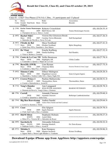 Result list Class 01, Class 02, and Class 03 october 29, 2015 Class 01 - CSI2* Two Phases (274.5.6) 1.20m, , 51 participants and 13 placed Nr Horse Color Gender Stud book Born Pedigree 1 (749) Karine Tenuta Montemagno Rider Owner Roberto Cristofoletti Mare 2009 R&H Horses AB e. Champion du Lys u. Salca e. Lester 2 (805) Rachel M&C Grey-ticked (0); (0)/27.26; 0 Stall Karupslund Maya Nordlund Mare SWB 2001 Elisabet Nordlund e. Quite Easy 958 u. Sunshine e. Irco Marco 4 (862) De Vleut (0); (0)/26.55; 0 Tenuta Montemagno Societa Victoria Eke-Göransson Bonde Mare SWB 2007 Caroline Toivio-Blomsten e. Maloubet de Pleville u. Never To Late 3 (907) l'Etoile de Bol Association Breeder (0); (0)/27.41; 0 Björn Skogsberg Emelie Karlberg KWPN 2008 Emelie Karlberg e. Vleut u. Rolina e. Caretino (0); (0)/27.52; 0 Stal Hendrix 5 (788) Conte de La Cour TH Nellie Berntsson Mare SWB 2006 Highlights AB e. Contendro u. Quena e. Major de La Cour 6 (790) Born2fly (SWB) Linn Byman Mare SWB 2009 Chatarina Mörk e. Cardento u. Mira Fly e. Cornetto 7 (892) Simona Cable (0); (0)/28.51; 0 Thormaehlen, Harm Ann Langgaard DWB 2009 JENS PETER AGGESEN e. Diamant de Revel u. Vong's Gina e. Grannus 10 (796) Cartell (0); (0)/28.28; 0 Irene Lövgren-Isgren Paulina Malinowska HOLST 2009 Thormaehlen, Harm e. Cassin u. Kaiserkrone e. Acord II 9 (716) Vong's Dundee (0); (0)/27.75; 0 Katarina Werden & Jonas Laigar Ellinor Malmgren Mare SWB 2001 Magdalena Larsson e. Manfield u. Tenfore Cable XX e. Starry Night XX 8 (977) Crown Prince 2 (0); (0)/27.70; 0 Ulrika Lindén (0); (0)/28.78; 0 BJARNE PETERSEN Amanda Claesson SWB 2007 Amanda Claesson e. Coriall u. Quantina e. Quite Easy (0); (0)/29.60; 0 Bollerups Lantbruksinstitut 11 (764) Big Ben Reuvekamp Andrea Sundal (0); (0)/29.64; 0 2006 Andrea Marie Sundal and Stall Lindstad e. Lord Z u. Karnita e. Triton 12 (935) Cnut Elin Sjögren SWB 2009 Ingela Hansson e. Click And Cash u. Rut e. Cardento 13 (842) H&M Sibon Stephanie Holmén KWPN 2004 Astrid Ohlin e. Sibon W u. Victorie BC e. Baloubet du Rouet 14 (809) Sacchetta K (0); (0)/30.27; 0 GOVERS GRAUENKAMP, HULTEN (NED) Alexandra Eriksson Mare HANN 2009 Henning Mankell, e. Stakkato Gold u. Alina e. Acord II 15 (972) Meluha S (0); (0)/29.70; 0 Ingela Hansson (0); (0)/30.32; 0 Dr. Petra Krause Kate Dempsey Mare SWB 2008 Magnus Jacobson e. Jaguar Mail u. Moon Light Shadow e. Cardento (0); (0)/30.86; 0 Krister Svedberg Download Equipe iPhone app from AppStore http://appstore.com/equipe Last updated 2015-10-29 18:51 Page 1 Of Result list Class 01, Class 02, and Class 03 october 29, 2015 Class 01 - CSI2* Two Phases (274.5.6) 1.20m, , 51 participants and 13 placed, continues.. Nr Horse Color Gender Stud book Born Pedigree Rider Owner Association Breeder 16 (949) Just A Dream Mi Amor Siri Swärd Mare BWP 2009 Karel Cox Horses e. Winningmood Vd Arenberg u. Chelsey Z e. Chellano Z 17 (829) Qualisy Sofia Hambrick OLDBG 2008 Hambrick, Dan e. Quality u. Silvielle e. Silvio I 18 (836) Nixon 18 (928) Feeling Free (0); (4)/26.21; 4 Josefin Håkansson Daniel Schumeier SWB 2005 Li FrantzNilsson e. For Feeling u. Tanja e. Helenikos XX 20 (798) Sunrise (0); (4)/26.21; 4 Helene Malmgren Hedvig Danielsson Mare SWB 2003 Stallängen HB e. Cardento u. Sunnyside e. Lombard 21 (931) Cristiano (0); (4)/27.35; 4 Jan Philipsson Stallängen HB Victor Schumeier SWB 2009 Helena Holm e. Click And Cash u. Carman-Ghia (SWB) e. Feliciano 22 (776) Ultiva (0); (4)/27.40; 4 Hagen Medical AB Henrik Ankarcrona Mare SWB 2006 Ulla Ek e. Tornesch u. Ulinja e. Raimondo Brown (1); (0)/34.42; 1 Lautenschlaeger, Dieter Viktor Hjertsson Hall SWB 2006 Patrik Hall e. Hip Hop 1045 u. Hook e. Lemon 23 (754) (1); (0)/27.68; 1 Martine Deroo Calypso vh Klavertje Vier (4); (0)/28.69; 4 Peder Wittsell Milou Boon (0); (4)/29.02; 4 BWP 2002 Ulrika Sundström Marc Van Duyse e. Toulon u. Vedette Van'T Hof Wenemaere e. Palestro van de Begijnakker 24 (732) Lugano DWB Anna Weilsby 2008 (4); (0)/30.31; 4 WEILSBY FAMILY 25 (833) Ard Greyman Attyrory Anna Hassö (4); (0)/30.42; 4 ISH 2008 Hassö/ Tågerup/ Nilsson/ Samuelsson Ard Stud e. Luidam u. Greylady e. Cruising 26 (753) Centannial II Scheefk Z Francesco Aldo Groppi ZANG 2006 Rolf Sjunesson & Isabelle Sjunesson e. Centauer Z u. Ulette e. Darco 27 (738) Allegra (4); (0)/31.99; 4 Johan Hubrechts Mathieu Boissonneau Mare SWB 2007 Anna Möreé e. For Feeling u. Alice (SWB) e. Cortez 679 (4); (0)/32.25; 4 Anna Möreé 28 (756) Oak Grove's Leilaki Veronika Gylthe Mare KWPN 2009 Gestüt Eichenhain GmbH e. Lexicon u. Soterma e. Guidam 29 (919) Bert Barend Mathilda Persson KWPN 2006 Mathilda Persson e. Cardento u. Fubea e. Nimmerdor 30 (944) Calaisa (4); (0)/32.39; 4 Van Gestel (4); (0)/32.56; 4 Fam. Boersma Eva Sunnanväder Mare HOLST 2006 Eva Sunnanväder e. Casall u. Riga I e. Carnute (Sf) (5); (0)/32.46; 5 Timm Peters Download Equipe iPhone app from AppStore http://appstore.com/equipe Last updated 2015-10-29 18:51 Page 2 Of Result list Class 01, Class 02, and Class 03 october 29, 2015 Class 01 - CSI2* Two Phases (274.5.6) 1.20m, , 51 participants and 13 placed, continues.. Nr Horse Color Gender Stud book Born Pedigree 31 (830) Licanto Rider Owner Tomas Hammar DWB 2002 Tomas Hammar e. Solos Landtinus u. Suleima e. Royal Z I 32 (818) Coopertina M (4); (1)/35.67; 5 Hans Peter Petersen Melanie Ling-Vannerus HOLST 2002 Brockmann,Günter e. Cassini I u. Gorde e. Cordelabryere 34 (868) Equidame (5); (0)/33.93; 5 Hanne und Uwe Hoeck Matilda Fromberger Mare HOLST 2006 Christina Sander Equestrian e. Colman u. Noblesse II e. Calido I 33 (885) Casino Royale 15 Association Breeder (6); (0)/30.14; 6 Gerken,Hans-Joachim My Lagerberg (4); (4)/29.35; 8 Mare KWPN 2009 Blue Spruce Farm & Mrs. My Lagerberg Nijhof ten Pas e. Quidam de Revel u. Valerie e. Carthago 35 (791) Stina (9) Linn Byman (8); (0)/29.53; 8 Mare SWB 2006 Lisbeth Claesson e. Emmerton u. Stancia (9) e. Stanford 36 (903) Zoho Q Olivia Munkberg (4); (4)/31.49; 8 Mare SWB 2005 Olivia Munkberg, Tomas Hamma