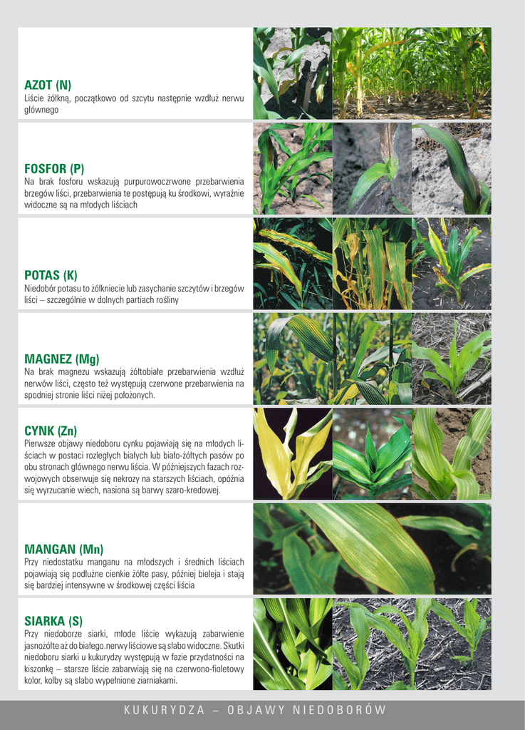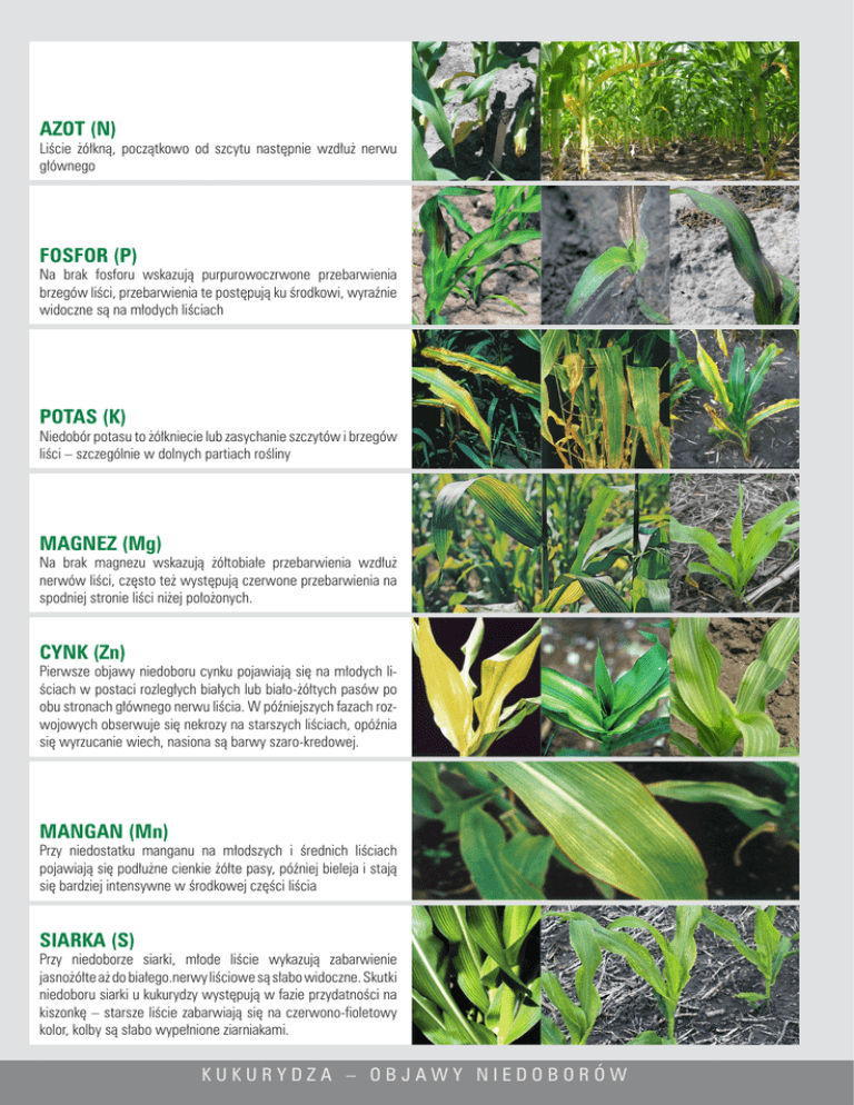 AZOT (N) Liście żółkną, początkowo od szcytu następnie wzdłuż nerwu głównego Fosfor (P) Na brak fosforu wskazują purpurowoczrwone przebarwienia brzegów liści, przebarwienia te postępują ku środkowi, wyraźnie widoczne są na młodych liściach Potas (K) Niedobór potasu to żółkniecie lub zasychanie szczytów i brzegów liści – szczególnie w dolnych partiach rośliny MAGNEZ (Mg) Na brak magnezu wskazują żółtobiałe przebarwienia wzdłuż nerwów liści, często też występują czerwone przebarwienia na spodniej stronie liści niżej położonych. CYNK (Zn) Pierwsze objawy niedoboru cynku pojawiają się na młodych liściach w postaci rozległych białych lub biało-żółtych pasów po obu stronach głównego nerwu liścia. W późniejszych fazach rozwojowych obserwuje się nekrozy na starszych liściach, opóźnia się wyrzucanie wiech, nasiona są barwy szaro-kredowej. MANGAN (Mn) Przy niedostatku manganu na młodszych i średnich liściach pojawiają się podłużne cienkie żółte pasy, później bieleja i stają się bardziej intensywne w środkowej części liścia SIARKA (S) Przy niedoborze siarki, młode liście wykazują zabarwienie jasnożółte aż do białego.nerwy liściowe są słabo widoczne. Skutki niedoboru siarki u kukurydzy występują w fazie przydatności na kiszonkę – starsze liście zabarwiają się na czerwono-fioletowy kolor, kolby są słabo wypełnione ziarniakami. KUKURYDZA – OBJAWY NIEDOBORÓW