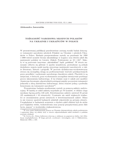ROCZNIK LUBUSKI TOM XXX, CZ. I, 2004 Aleksandra Jawornicka TOŻSAMOŚĆ NARODOWA MŁODYCH POLAKÓW NA UKRAINIE I UKRAIŃCÓW W POLSCE W prezentowanej publikacji przedstawione zostaną wyniki badań dotyczące tożsamości narodowej młodych Polaków na Ukrainie i młodych Ukraińców w Polsce. Badania przeprowadzone zostały na przełomie lat 1998 i 1999 wśród uczniów liceum ukraińskiego w Legnicy oraz dwóch szkół dla mniejszości polskiej we Lwowie (Szkoły Podstawowe nr 10 i 22)1 . Szkoły te są potocznie nazywane „ukraińskimi” bądź „polskimi”. W istocie nauczanie odbywa się głównie w języku urzędowym, prowadzone są jednak dodatkowo zajęcia nauki języka ojczystego mniejszości narodowych, a także literatury, historii i geografii. W procesie dydaktyczno-wychowawczym zwraca się szczególną uwagę na podtrzymywanie wartości przekazywanych przez przodków i zachowanie narodowego charakteru szkoły. Placówki te są miejscami, w których „poza wychowaniem szczególnie intensywnie przebiega proces ukorzenienia kulturowego. Z tej właśnie racji w szkole jest możliwe i konieczne kreowanie odpowiednich powiązań między poczuciem tożsamości jednostki a sferą dziedzictwa kulturowego, która stanowi jedną z podwalin formowania się tożsamości narodowej” 2 . Prezentowane badania zrealizowane zostały za pomocą ankiety audytoryjnej. W każdej ze szkół ankietę wypełniło po 70 uczniów, w efekcie czego uzyskano łączną próbę 140 osób. Kwestionariusz ankiety zawierał 35 pytań (25 zamkniętych i 10 otwartych). Uczniowie nie mieli większych trudności ze zrozumieniem pytań zawartych w kwestionariuszach ankiet. Mimo to nie wszyscy spośród badanych udzielali odpowiedzi na pytania otwarte. Uwzględnieni w badaniach uczniowie z obydwu szkół zbliżeni byli do siebie pod względem wieku, wykształcenia oraz pozycji przypisywanej przez fakt bycia „innym” w środowisku większościowym. W tym czasie funkcjonowała jeszcze na Ukrainie dziesięcioletnia szkoła podstawowa i najstarsze klasy tej szkoły były w istocie odpowiednikami szkół średnich w polskim systemie edukacji. 2 M. S o b e c k i, Status kulturowo-etniczny a edukacja na pograniczu kultur, [w:] Edukacja międzykulturowa. W kręgu potrzeb, oczekiwań i stereotypów , red. J. Nikitorowicz, Białystok 1995, s. 219. 1 62 Aleksandra JAWORNICKA Jako punkt wyjścia do rozważań nad badaniami przyjęłam hipotezę, iż młodzież polska na Ukrainie i ukraińska w Polsce – stanowiąc poprzez fakt odmiennego pochodzenia specyficzne grupy mniejszościowe – w swych zachowaniach i prezentowanych postawach jest bardzo zbliżona do siebie. Poprawność hipotezy powinny wskazać zbliżone do siebie odpowiedzi zawarte w kwestionariuszach wywiadu, stanowiąc równocześnie wskaźniki poszczególnych postaw. Celem badań było wyodrębnienie postaw młodzieży polskiej i ukraińskiej w odniesieniu do języka i kultury ich przodków oraz ukazanie stopnia przynależności do mniejszościowych grup narodowych z równoczesnym wskazaniem zainteresowania polityką państwa i kultury, w których się urodzili i wychowali. Powyższe czynniki warunkują przynależność narodową i wpływają na poziom tożsamości jednostkowej i społecznej. Na podstawie zebranych materiałów chciałam uzyskać odpowiedź na następujące pytania: Na podstawie jakich elementów młodsze pokolenia mniejszości narodowych konstruują swoją tożsamość? Czy podobnie jak ich przodkowie stosują strategie obronne, które pozwalają im zachować tożsamość kulturową i etniczną? Z którą z grup identyfikują się w większym stopniu? Jak już wcześniej wspomniałam, uwzględniona w badaniach młodzież reprezentuje przedział wiekowy pomiędzy piętnastym a siedemnastym rokiem życia, z czego 50,7% to kobiety, a 49,3% to mężczyźni. Zdecydowana większość spośród respondentów zamieszkuje miasta i miasteczka (odpowiednio 40,7% i 32,1% osób), na wsi mieszka niewiele ponad 27,1%. Ponad połowa badanych (53,0%) pochodzi z rodzin, w których przynajmniej jedno z rodziców ma wyższe wykształcenie; wykształcenie średnie ma 32,1% rodziców respondentów, wykształcenie zawodowe 9,3%, jedynie 2,5% podstawowe (nie ma istotnej różnicy w strukturze wykształcenia rodziców młodych Polaków na Ukrainie i Ukraińców w Polsce). Znaczna część badanych posiada świadomość narodowej odrębności. Ponad 71,4% badanych uczniów z legnickiego liceum identyfikuje się z narodowością ukraińską. 65,7% spośród badanych uczniów ze Lwowa utożsamia się z polskością. Dodatkowo 37,1% młodych Polaków z Ukrainy podkreśla silny związek ze swoim miastem, określając się mianem lwowiaków. W przypadku młodzieży ukraińskiej w Legnicy żaden z badanych nie czuje się specjalnie związany ze środowiskiem lokalnym i miastem. Zapewne wynika to z dość prostego faktu – większość z ukraińskich uczniów pochodzi z rodzin przybyłych z różnych części kraju; nie zdążyli jeszcze zintegrować się z miastem bądź identyfikują się jedynie z „ukraińskim” LO w Legnicy. TOŻSAMOŚĆ NARODOWA MŁODYCH POLAKÓW. . . 63 Na pytanie: Co warunkuje przynależność do danego narodu – czy posiadanie obywatelstwa, zamieszkiwanie danego terytorium, posługiwanie się danym językiem, uczestnictwo w życiu kulturalnym, politycznym, religijnym, a może kultywowanie tradycji i obrzędów? przeważająca część – 89,3% spośród wszystkich respondentów zwróciła przede wszystkim uwagę na dwa przedostatnie elementy: uczestnictwo w życiu kulturalnym, politycznym i religijnym swojej grupy i kultywowanie tradycji. W następnej kolejności wskazywano na język (47,9%). Najmniej ważne dla większości badanych okazało się posiadanie obywatelstwa (27,1%) i zamieszkiwanie danego terytorium (10,7%). Na tę kategorię najczęściej zwracali uwagę polscy uczniowie z Ukrainy. Ponad połowa z nich (52,9%) w kolejnym p