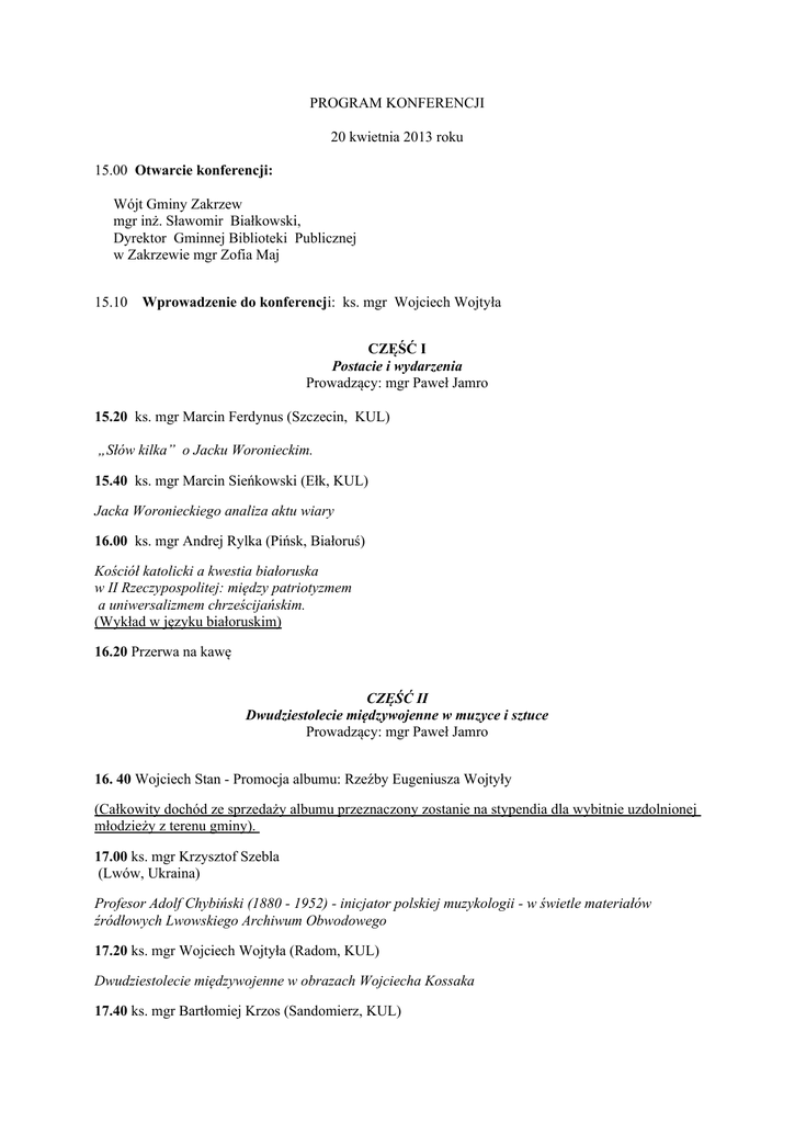 PROGRAM KONFERENCJI 20 kwietnia 2013 roku 15.00 Otwarcie konferencji: Wójt Gminy Zakrzew mgr inż. Sławomir Białkowski, Dyrektor Gminnej Biblioteki Publicznej w Zakrzewie mgr Zofia Maj 15.10 Wprowadzenie do konferencji: ks. mgr Wojciech Wojtyła CZĘŚĆ I Postacie i wydarzenia Prowadzący: mgr Paweł Jamro 15.20 ks. mgr Marcin Ferdynus (Szczecin, KUL) „Słów kilka” o Jacku Woronieckim. 15.40 ks. mgr Marcin Sieńkowski (Ełk, KUL) Jacka Woronieckiego analiza aktu wiary 16.00 ks. mgr Andrej Rylka (Pińsk, Białoruś) Kościół katolicki a kwestia białoruska w II Rzeczypospolitej: między patriotyzmem a uniwersalizmem chrześcijańskim. (Wykład w języku białoruskim) 16.20 Przerwa na kawę CZĘŚĆ II Dwudziestolecie międzywojenne w muzyce i sztuce Prowadzący: mgr Paweł Jamro 16. 40 Wojciech Stan - Promocja albumu: Rzeźby Eugeniusza Wojtyły (Całkowity dochód ze sprzedaży albumu przeznaczony zostanie na stypendia dla wybitnie uzdolnionej młodzieży z terenu gminy). 17.00 ks. mgr Krzysztof Szebla (Lwów, Ukraina) Profesor Adolf Chybiński (1880 - 1952) - inicjator polskiej muzykologii - w świetle materiałów źródłowych Lwowskiego Archiwum Obwodowego 17.20 ks. mgr Wojciech Wojtyła (Radom, KUL) Dwudziestolecie międzywojenne w obrazach Wojciecha Kossaka 17.40 ks. mgr Bartłomiej Krzos (Sandomierz, KUL) Polska architektura sakralna Dwudziestolecia międzywojennego 18.00 Przerwa na kawę 18.20 Prezentacja w wykonaniu Szwadronu Kawalerii 24 Pułku Ułanów 18. 40 ks. mgr Artur Wójtowicz (Sydney, Australia) Polacy w Australii i Oceanii w Dwudziestoleciu międzywojennym 19.00 ks. mgr Krzysztof Jaworski (Zielona Góra, KUL) Alfred Tarski – ten, który szukał prawdy 19.20 mgr Łukasz Cięgotura (Lublin, KUL) Władysław Tatarkiewicz - człowiek Dwudziestolecia 19. 40. Podsumowanie konferencji: mgr Paweł Jamro (Lublin, KUL) 19.50 Przerwa 20.00 Koncert muzyczny. Prowadzenie ks. mgr Krzysztof Szebla (Lwów, Ukraina) 20.30 Zakończenie konferencji Współorganizatorzy konferencji: 1. 2. 3. 4. 5. 6. Theologische Fakultät Paderborn (Niemcy) Instytut Katechetyczny im. Zygmunta Łozińskiego w Pińsku (Białoruś) Instytut Teologiczny im. Św. Józefa Bilczewskiego we Lwowie (Ukraina) Filozoficka Fakulta i Žurnalistyka – Katolicka Univerzita v Ružomberku (Słowacja) Instytut Jana Pawła II KUL (Polska) Instytut Teologiczny UKSW w Radomiu. Centrum Myśli Benedykta XVI (Polska Patronat honorowy: Wójt Gminy Zakrzew – mgr inż. Sławomir Białkowski Patronat medialny: Gość Niedzielny, Radio Plus Radom, Wieści
