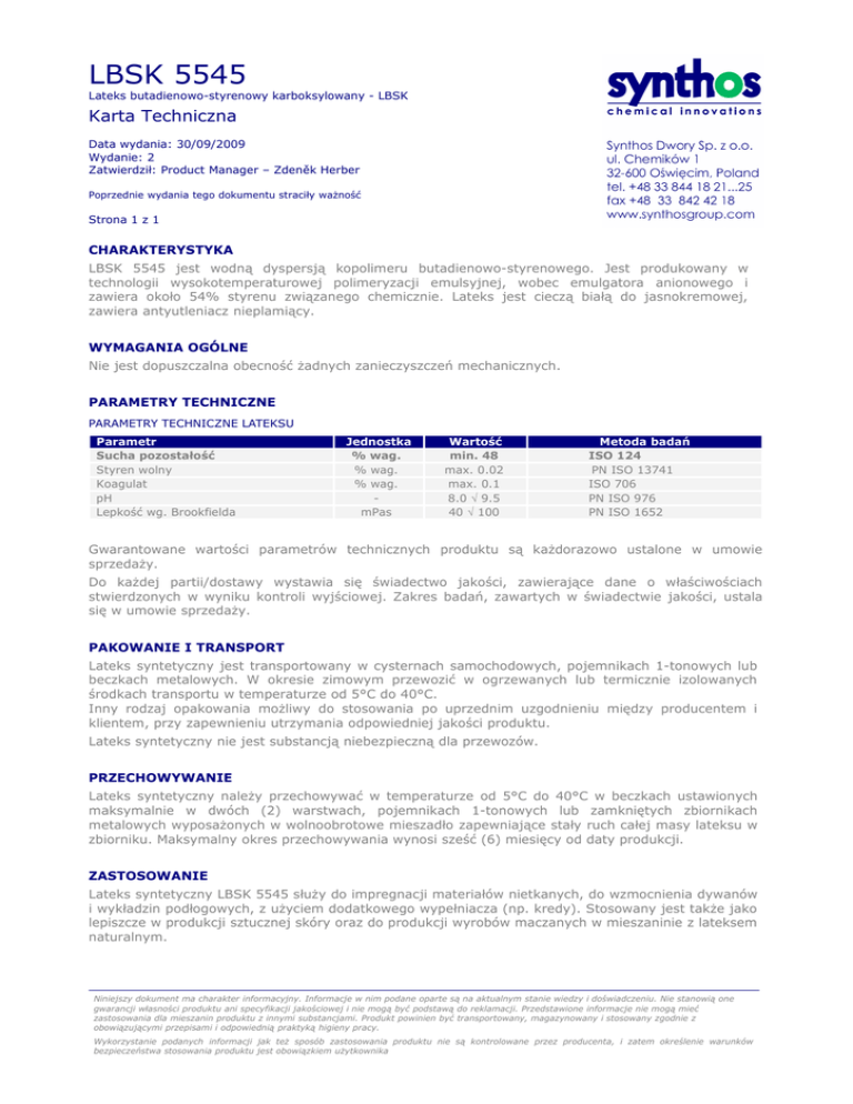 LBSK 5545 Lateks butadienowo-styrenowy karboksylowany - LBSK Karta Techniczna Data wydania: 30/09/2009 Wydanie: 2 Zatwierdził: Product Manager – Zdeněk Herber Poprzednie wydania tego dokumentu straciły ważność Strona 1 z 1 CHARAKTERYSTYKA LBSK 5545 jest wodną dyspersją kopolimeru butadienowo-styrenowego. Jest produkowany w technologii wysokotemperaturowej polimeryzacji emulsyjnej, wobec emulgatora anionowego i zawiera około 54% styrenu związanego chemicznie. Lateks jest cieczą białą do jasnokremowej, zawiera antyutleniacz nieplamiący. WYMAGANIA OGÓLNE Nie jest dopuszczalna obecność żadnych zanieczyszczeń mechanicznych. PARAMETRY TECHNICZNE PARAMETRY TECHNICZNE LATEKSU Parametr Sucha pozostałość Styren wolny Koagulat pH Lepkość wg. Brookfielda Jednostka % wag. % wag. % wag. mPas Wartość min. 48 max. 0.02 max. 0.1 8.0 ÷ 9.5 40 ÷ 100 Metoda badań ISO 124 PN ISO 13741 ISO 706 PN ISO 976 PN ISO 1652 Gwarantowane wartości parametrów technicznych produktu są każdorazowo ustalone w umowie sprzedaży. Do każdej partii/dostawy wystawia się świadectwo jakości, zawierające dane o właściwościach stwierdzonych w wyniku kontroli wyjściowej. Zakres badań, zawartych w świadectwie jakości, ustala się w umowie sprzedaży. PAKOWANIE I TRANSPORT Lateks syntetyczny jest transportowany w cysternach samochodowych, pojemnikach 1-tonowych lub beczkach metalowych. W okresie zimowym przewozić w ogrzewanych lub termicznie izolowanych środkach transportu w temperaturze od 5°C do 40°C. Inny rodzaj opakowania możliwy do stosowania po uprzednim uzgodnieniu między producentem i klientem, przy zapewnieniu utrzymania odpowiedniej jakości produktu. Lateks syntetyczny nie jest substancją niebezpieczną dla przewozów. PRZECHOWYWANIE Lateks syntetyczny należy przechowywać w temperaturze od 5°C do 40°C w beczkach ustawionych maksymalnie w dwóch (2) warstwach, pojemnikach 1-tonowych lub zamkniętych zbiornikach metalowych wyposażonych w wolnoobrotowe mieszadło zapewniające stały ruch całej masy lateksu w zbiorniku. Maksymalny okres przechowywania wynosi sześć (6) miesięcy od daty produkcji. ZASTOSOWANIE Lateks syntetyczny LBSK 5545 służy do impregnacji materiałów nietkanych, do wzmocnienia dywanów i wykładzin podłogowych, z użyciem dodatkowego wypełniacza (np. kredy). Stosowany jest także jako lepiszcze w produkcji sztucznej skóry oraz do produkcji wyrobów maczanych w mieszaninie z lateksem naturalnym. Niniejszy dokument ma charakter informacyjny. Informacje w nim podane oparte są na aktualnym stanie wiedzy i doświadczeniu. Nie stanowią one gwarancji własności produktu ani specyfikacji jakościowej i nie mogą być podstawą do reklamacji. Przedstawione informacje nie mogą mieć zastosowania dla mieszanin produktu z innymi substancjami. Produkt powinien być transportowany, magazynowany i stosowany zgodnie z obowiązującymi przepisami i odpowiednią praktyką higieny pracy. Wykorzystanie podanych informacji jak też sposób zastosowania produktu nie są kontrolowane przez producenta, i zatem określenie warunków bezpieczeństwa stosowania produktu jest obowiązkiem użytkownika