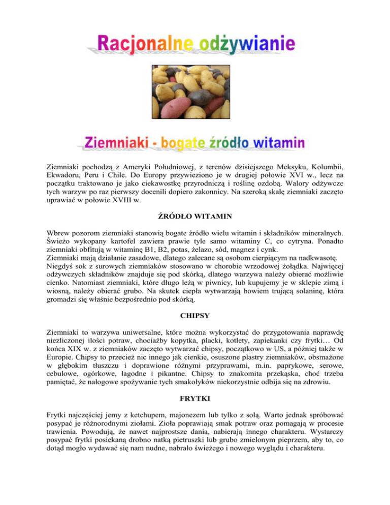 Ziemniaki pochodzą z Ameryki Południowej, z terenów dzisiejszego Meksyku, Kolumbii, Ekwadoru, Peru i Chile. Do Europy przywieziono je w drugiej połowie XVI w., lecz na początku traktowano je jako ciekawostkę przyrodniczą i roślinę ozdobą. Walory odżywcze tych warzyw po raz pierwszy docenili dopiero zakonnicy. Na szeroką skalę ziemniaki zaczęto uprawiać w połowie XVIII w. ŹRÓDŁO WITAMIN Wbrew pozorom ziemniaki stanowią bogate źródło wielu witamin i składników mineralnych. Świeżo wykopany kartofel zawiera prawie tyle samo witaminy C, co cytryna. Ponadto ziemniaki obfitują w witaminę B1, B2, potas, żelazo, sód, magnez i cynk. Ziemniaki mają działanie zasadowe, dlatego zalecane są osobom cierpiącym na nadkwasotę. Niegdyś sok z surowych ziemniaków stosowano w chorobie wrzodowej żołądka. Najwięcej odżywczych składników znajduje się pod skórką, dlatego warzywa należy obierać możliwie cienko. Natomiast ziemniaki, które długo leżą w piwnicy, lub kupujemy je w sklepie zimą i wiosną, należy obierać grubo. Na skutek ciepła wytwarzają bowiem trującą solaninę, która gromadzi się właśnie bezpośrednio pod skórką. CHIPSY Ziemniaki to warzywa uniwersalne, które można wykorzystać do przygotowania naprawdę niezliczonej ilości potraw, chociażby kopytka, placki, kotlety, zapiekanki czy frytki… Od końca XIX w. z ziemniaków zaczęto wytwarzać chipsy, początkowo w US, a później także w Europie. Chipsy to przecież nic innego jak cienkie, osuszone plastry ziemniaków, obsmażone w głębokim tłuszczu i doprawione różnymi przyprawami, m.in. paprykowe, serowe, cebulowe, ogórkowe, łagodne i pikantne. Chipsy to znakomita przekąska, choć trzeba pamiętać, że nałogowe spożywanie tych smakołyków niekorzystnie odbija się na zdrowiu. FRYTKI Frytki najczęściej jemy z ketchupem, majonezem lub tylko z solą. Warto jednak spróbować posypać je różnorodnymi ziołami. Zioła poprawiają smak potraw oraz pomagają w procesie trawienia. Powodują, że nawet najprostsze dania, nabierają innego charakteru. Wystarczy posypać frytki posiekaną drobno natką pietruszki lub grubo zmielonym pieprzem, aby to, co dotąd mogło wydawać się nam nudne, nabrało świeżego i nowego wyglądu i charakteru.