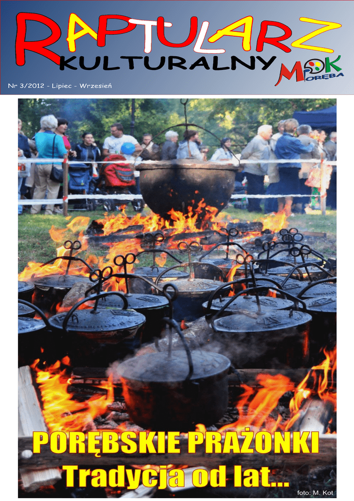 OD WYDAWCY SPIS TREŚCI Tradycja 1. Z życia biblioteki Córce dam na imię Tradycja! -Przecież nie ma takiego imienia... Tradycja... -Mam tu wyraźnie napisane w gazecie: "W Poznaniu narodziła się nowa tradycja" Ten cytat z kultowego już filmu „Miś” ilustruje jak różnie może być rozumiana tradycja. Zwolennicy tego słowa często powołują się na bogatą tradycję. Jej przeciwnicy, odżegnujący się od przeszłości i artykułujący nieraz głośno swoją niechęć do tego co jest związane z kultywowaniem przeszłości, sami często czerpią z bogatej tradycji mniej lub bardziej świadomie. Część z nas kultywuje rodzimą tradycję. Negaci często od niej odstępują sami tworząc nową (niejednokrotnie czerpiąc coraz częściej wzorce z odległych kontynentów). Sami jednak, oczekując na występy ulubionej grupy muzycznej, pytają: kiedy wystąpi kapela? Przecież to słowo wywodzi się z tradycji wiejskich i ulicznych zabaw sprzed wielu wieków a jednak nas nie razi, nie wywołuje bolesnych skurczów mięśni twarzy. Tradycyjnie (dwa razy do roku) mieszkańcy naszego miasteczka gremialnie biorą udział w obchodach „Dni Poręby” i „Festiwalu prażonek”. Wspólnej genezy tych spotkań możemy się doszukiwać w odległym średniowieczu i świątecznych jarmarkach odpustowych. Narodziny świętowania podczas „Dni Poręby” postrzegałbym jako alternatywę dla parafialnych odpustów. Ich narodziny przypadają bowiem na epokę, do której odwołuje się cytat z „Misia”. O kilkadziesiąt lat młodszy „Festiwal prażonek”, który jest przewodnim wątkiem bieżącego numeru Raptularza, narodził się na bazie rodzimej porębskiej tradycji rodzinnych posiłków w czasie prac polowych. Z czasem nabrały one bardziej uroczystego, żeby nie powiedzieć świątecznego charakteru, poszerzając krąg przy prażonkach o przyjaciół i znajomych. Niewątpliwie porębskim prażonkom dodatkowej estymy przysporzył klasyczny wyrób miejscowej fabryki - kociołek. Również ten największy na świecie, przy którym spotykamy się w Porębie tradycyjnie przy końcu września. Nawet przeciwnicy utożsamiania się z rodzimą tradycją muszą przyznać, że z tradycyjnych prażonek nie zrezygnują. I to jest właśnie moc i szczególny walor porębskiej tradycji prażonek. Zdzisław Kluźniak (Spotkanie autorskie z Grzegorzem Seredyńskim, Biblioteka poleca) 2. Co słychać w MOK? (o bieżącej działalności MOK, kołach zainteresowań (wywiad z instruktorem koła plastycznego), zespołach, planach i bolączkach informują: Michał Neszczyński i Karol Hadrych) 3. Wydarzenia Kulturalne (XXXIX Dni Poręby, Wybrano laureatów XVII PTAMS, Wieczór muzyczny II, Otwarto Pracownię Orange, Podsumowanie wakacji, Sukcesy festiwalowe, Udane występy Zespołu Pieśni i Tańca „Niwczanki”, Wizyta w partnerskim mieście Kistelek. ) WYWIAD 4. Znani i nieznani (W numerze Klaudia Ciepak – pasjonatka rysunku). 5. Z kart historii Felieton Zdzisława Kluźniaka 6. Ja i Ty – Prażonki Felieton Ewy Olszańskiej - Rok 7. Kącik poetycki 8. O podróżach kociołka i nie tylko... Felieton Włodzimierza Pucka 9. HYDE PARK 10. Będzie się działo! (zapowiedzi wydarzeń kulturalnych) Biblioteka poleca: Dla dorosłych: 1. M. Wojciechowska „Kobieta na krańcu świata” 2. T. Revay „Biała wilczyca” 3. I. Lorentz „Córka tatarskiego chana” Dla dzieci i młodzieży: 1. D. Grace „Sekretnik 2. M. Fox „Anoreczka” 3. M. McDonald „Hania Humorek” B. Machura / L. Dziechciarz Z życia biblioteki Co słychać w MOK? Spotkanie autorskie z Grzegorzem Seredyńskim Otwarto pracownię Orange W dniu 14 czerwca z inicjatywy Miejskiej Biblioteki Publicznej w Porębie w sali konferencyjnej MOK w Porębie odbyło się autorskie spotkanie z Grzegorzem Seredyńskim, autorem książki biograficznej „Adam Mickiewicz”. 20 czerwca w MOK w Porębie odbyło się uroczyste otwarcie Pracowni Orange. Symbolicznego przecięcia wstęgi dokonał Burmistrz Marek Śliwa, przedstawiciel Orange Polska Marek Piątkowski oraz Dyrektor MOK Michał Neszczyński. Symboliczne przecięcie wstęgi Grzegorz Seredyński z Dyrektorem MBP Michałem Neszczyńskim podczas spotkania autorskiego w porębskiej bibliotece W spotkaniu uczestniczyli uczniowie z Gimnazjum im. Stanisława Staszica i Zespołu Szkół im. Mikołaja Kopernika. Uczniowie mieli okazję poznać ciekawostki z życia Adama Mickiewicza ze szczególnym uwzględnieniem czasów młodości, domu rodzinnego, nauki w Nowogródku i studiów w Wilnie. Autor książki, polonista, znawca literatury polskiej opowiedział również o swoim warsztacie pracy, zdobywaniu materiałów i etapach powstawania książki. Uczniowie poszerzyli także wiedzę na temat życiorysu poety, a tym samym przypomnieli sobie lektury szkolne – „Dziady” i „Pan Tadeusz”. Na zakończenie spotkania Grzegorz Seredyński zarekomendował dwie książki autorstwa swojego syna Adama Seredyńskiego „Przyjaciele z Breslau” i „Przyjaciele z leśniczówki”. W. Pucek Spośród 751 wniosków zgłoszonych do programu wyłoniono zwycięską 50. MOK w partnerstwie z Urzędem Miasta w Porębie wziął udział w programie. Powstała grupa inicjatywna w składzie: Marek Śliwa, Michał Neszczyński, Tomasz Kołton, Mariusz Rok, Zdzisław Kluźniak i Karol Hadrych, która przygotowała stosowną dokumentację i złożyła wniosek do programu. Z województwa śląskiego wybrano tylko dwie miejscowości: Porębę oraz Ujsoły. W Orange myślimy o przyszłości – wspieramy rozwój i dbamy o dostępność rozwiązań telekomunikacyjnych. Głównym celem akcji Pracownie Orange jest zapewnienie obywatelom małych społeczności lepszego dostępu do technologii i informacji. Dodatkowo, poprzez projekt chcemy zainspirować mieszkańców do podejmowania samodzielnych działań twórczych oraz większego zaangażowania w lokalne życie społeczne - mówi przedstawiciel Orange Polska Marek Pi