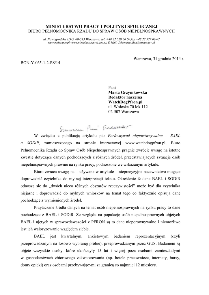 MINISTERSTWO PRACY I POLITYKI SPOŁECZNEJ BIURO PEŁNOMOCNIKA RZĄDU DO SPRAW OSÓB NIEPEŁNOSPRAWNYCH ul. Nowogrodzka 1/3/5, 00-513 Warszawa, tel. +48 22 529 06 00,fax +48 22 529 06 02 wuw.mpips.gov.pl; www.niepeInosprawni.gov.pl; E-Mail: [email protected] Warszawa, 31 grudnia 2014 r. BON-Y-065-1-2-PS/14 Pani Marta Grzymkowska Redaktor naczelna WatchDogPfron.pl ul. Wołoska 70 lok 112 02-507 Warszawa W związku z publikacją artykułu pt.: Porównywać nieporównywalne – BAEL a SODiR, zamieszczonego na stronie internetowej www.watchdogpfron.pl, Biuro Pełnomocnika Rządu do Spraw Osób Niepełnosprawnych pragnie zwrócić uwagę na istotne kwestie dotyczące danych pochodzących z różnych źródeł, przedstawiających sytuację osób niepełnosprawnych prawnie na rynku pracy, podnoszone we wskazanym artykule. Biuro zwraca uwagę na – używane w artykule – nieprecyzyjne nazewnictwo mogące doprowadzić czytelnika do mylnej interpretacji tekstu. Określenie iż dane BAEL i SODiR odnoszą się do „dwóch nieco różnych obszarów rzeczywistości” może być dla czytelnika niejasne i doprowadzić do mylnych wniosków na temat tego co faktycznie opisują dane pochodzące z wymienionych źródeł. Przytaczane źródła danych na temat osób niepełnosprawnych na rynku pracy to dane pochodzące z BAEL i SODiR. Ze względu na populację osób niepełnosprawnych objętych BAEL i ujętych w sprawozdawczości z PFRON są to dane nieporównywalne i niemożliwe jest ich waloryzowanie względem siebie. BAEL jest kwartalnym, ankietowym badaniem reprezentacyjnym (czyli przeprowadzanym na losowo wybranej próbie), przeprowadzanym przez GUS. Badaniem są objęte wszystkie osoby, które ukończyły 15 lat i więcej poza osobami zamieszkałymi w gospodarstwach zbiorowego zakwaterowania (np. hotele pracownicze, internaty, bursy, domy opieki) oraz osobami przebywającymi za granicą co najmniej 12 miesięcy. Należy podkreślić, że metodologia badania BAEL: dobór próby, sposób uogólniania wyników, częstotliwość badania są zgodne z zaleceniami Eurostatem – urzędem statystycznym Unii Europejskiej. BAEL dostarcza dane o liczbie osób niepełnosprawnych prawnie (w podziale na płeć, aktywność ekonomiczną) i ich sytuacji na rynku pracy. Pozwala na określenie poziomu aktywności zawodowej, zatrudnienia i bezrobocia poprzez wskaźniki jakimi są: współczynnik aktywności zawodowej, wskaźnik zatrudnienia i stopa bezrobocia. Nie jest słuszne więc twierdzenie jakoby BAEL nie pokazywał dokładnej liczby pracujących, a jedynie procentowe wskaźniki zatrudnienia, aktywności zawodowej i stopy bezrobocia - jak czytamy w artykule. Według danych z BAEL w III kwartale 2014 roku było 3.251 tys. osób niepełnosprawnych w wieku 15 lat i więcej (w tym 1.911 tys. w wieku produkcyjnym), z czego 596 tys. osób było aktywnych zawodowo (539 tys. w wieku produkcyjnym), 516 tys. pracowało (460 tys. w wieku produkcyjnym), a 80 tys. było bezrobotnych (79 tys. w wieku produkcyjnym). Zatem współczynnik aktywności zawodowej osób niepełnosprawnych w wieku produkcyjnym wynosił 28,2%, wskaźnik zatrudnienia 24,1%, a stopa bezrobocia 14,7%. Współczynnik aktywności zawodowej wzrósł o 1 pkt. proc. w porównaniu do wyników z II kwartału br., wskaźnik zatrudnienia wzrósł o 1,5 pkt. proc., natomiast stopa bezrobocia spadła o 2,7 pkt. proc. w tym samym okresie. Dodatkowo Biuro zwraca uwagę na mylną interpretację określenia osób pracujących wyszczególnionych w badaniu. Definicje zawarte w BAEL jasno precyzują, że do pracujących osób niepełnosprawnych zaliczono wszystkie osoby w wieku 15 lat i więcej, które w okresie badanego tygodnia: a) wykonywały przez co najmniej 1 godzinę pracę przynoszącą zarobek lub dochód tzn. były zatrudnione w charakterze pracownika najemnego, pracowały we własnym (lub dzierżawionym) gospodarstwie rolnym lub prowadziły własną działalność gospodarczą poza rolnictwem, pomagały (bez wynagrodzenia) w prowadzeniu rodzinnego gospodarstwa rolnego lub rodzinnej działalności gospodarczej poza rolnictwem b) miały pracę, ale jej nie wykonywały: z powodu choroby, urlopu macierzyńskiego, urlopu rodzicielskiego lub wypoczynkowego; z innych powodów, przy czym długość przerwy w pracy wynosiła: do 3 miesięcy; powyżej 3 miesięcy, ale osoby te były pracownikami najemnymi i w tym czasie otrzymywały co najmniej 50% dotychczasowego wynagrodzenia (od I kwartału 2006 r.). Do pracujących – zgodnie z międzynarodowymi standardami – zaliczani są również uczniowie, z którymi zakłady pracy lub osoby fizyczne zawarły umowę na naukę zawodu lub przyuczenie do określonej pracy, jeżeli otrzymywali wynagrodzenie. Ze względu na określone założenia metodologiczne badania, liczba pracujących uzyskana w wyniku BAEL nie obejmuje niektórych kategorii osób, które są wliczane do sprawozdawczości z zakresu zatrudniania, m.in.: Pracujących mieszkających w hotelach pracowniczych, Pracujących za granicą na rzecz polskich pracodawców. W prezentowanym materiale wprowadzono czytelnika w błąd stwierdzeniem, że do pracujących osób zaliczono osoby niepełnosprawne wykonujące prace we własnym gospodarstwie domowym (praca w „przydomowym ogrodzie”). Badanie BAEL jasno rozróżnia prowadzenie gospodarstwa rolnego oraz działalności gospodarczej poza rolnictwem od prowadzenia gospodarstwa domowego. Ponadto podstawowym kryterium pozwalającym zaliczyć osobę do kategorii pracujących jest osiąganie dochodu z wykonywanej pracy. Wyjątek od tej zasady stanowią pomagający członkowie rodzin, którzy są jednocześnie najmniejszą grupą wśród pracujących osób niepełnosprawnych w wieku produkcyjnym. Udział tej grupy w ogólnej liczbie pracujących osób niepełnosprawnych w wieku produkcyjnym ma tendencję malejącą. Jeszcze w 2010 r. udział ten wynosił 7%, a według uśrednionych danych za trzy kwartały 2014 r. udział ten