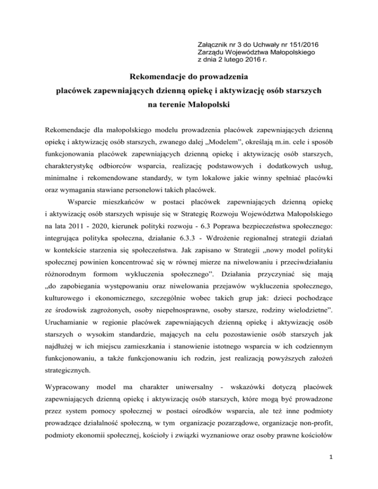 Załącznik nr 3 do Uchwały nr 151/2016 Zarządu Województwa Małopolskiego z dnia 2 lutego 2016 r. Rekomendacje do prowadzenia placówek zapewniających dzienną opiekę i aktywizację osób starszych na terenie Małopolski Rekomendacje dla małopolskiego modelu prowadzenia placówek zapewniających dzienną opiekę i aktywizację osób starszych, zwanego dalej „Modelem”, określają m.in. cele i sposób funkcjonowania placówek zapewniających dzienną opiekę i aktywizację osób starszych, charakterystykę odbiorców wsparcia, realizację podstawowych i dodatkowych usług, minimalne i rekomendowane standardy, w tym lokalowe jakie winny spełniać placówki oraz wymagania stawiane personelowi takich placówek. Wsparcie mieszkańców w postaci placówek zapewniających dzienną opiekę i aktywizację osób starszych wpisuje się w Strategię Rozwoju Województwa Małopolskiego na lata 2011 - 2020, kierunek polityki rozwoju - 6.3 Poprawa bezpieczeństwa społecznego: integrująca polityka społeczna, działanie 6.3.3 - Wdrożenie regionalnej strategii działań w kontekście starzenia się społeczeństwa. Jak zapisano w Strategii „nowy model polityki społecznej powinien koncentrować się w równej mierze na niwelowaniu i przeciwdziałaniu różnorodnym formom wykluczenia społecznego”. Działania przyczyniać się mają „do zapobiegania występowaniu oraz niwelowania przejawów wykluczenia społecznego, kulturowego i ekonomicznego, szczególnie wobec takich grup jak: dzieci pochodzące ze środowisk zagrożonych, osoby niepełnosprawne, osoby starsze, rodziny wielodzietne”. Uruchamianie w regionie placówek zapewniających dzienną opiekę i aktywizację osób starszych o wysokim standardzie, mających na celu pozostawienie osób starszych jak najdłużej w ich miejscu zamieszkania i stanowienie istotnego wsparcia w ich codziennym funkcjonowaniu, a także funkcjonowaniu ich rodzin, jest realizacją powyższych założeń strategicznych. Wypracowany model ma charakter uniwersalny - wskazówki dotyczą placówek zapewniających dzienną opiekę i aktywizację osób starszych, które mogą być prowadzone przez system pomocy społecznej w postaci ośrodków wsparcia, ale też inne podmioty prowadzące działalność społeczną, w tym organizacje pozarządowe, organizacje non-profit, podmioty ekonomii społecznej, kościoły i związki wyznaniowe oraz osoby prawne kościołów 1 i związków wyznaniowych, jednostki samorządu terytorialnego, ich związki i stowarzyszenia, jednostki organizacyjne samorządu terytorialnego posiadające osobowość prawną oraz przedsiębiorców, tj. beneficjentów Poddziałania 9.2.2 i 9.2.3 Regionalnego Programu Operacyjnego Województwa Małopolskiego na lata 2014 - 20201. Tym samym placówki zapewniające dzienną opiekę i aktywizację osób starszych mogą być prowadzone w oparciu o środki własne samorządów lokalnych, budżety organizacji pozarządowych, środki europejskie i wszelkie inne dostępne źródła finansowania tego typu usług. W przypadku finansowania placówek zapewniających dzienną opiekę i aktywizację osób starszych ze środków Europejskiego Funduszu Społecznego należy uwzględnić zasady wynikające z „Wytycznych w zakresie realizacji przedsięwzięć w obszarze włączenia społecznego i zwalczania ubóstwa z wykorzystaniem środków Europejskiego Funduszu Społecznego i Europejskiego Funduszu Regionalnego na lata 2014-2020”2. W szczególności zastosowanie mają zapisy dotyczące usług opiekuńczych dla osób niesamodzielnych jako „usług świadczonych w lokalnej społeczności” (słownik pojęć). 1. Cele placówki Celem działalności placówki zapewniającej dzienną opiekę i aktywizację osób starszych jest oferowanie opieki oraz polepszanie funkcjonowania osób starszych i ich rodzin. Efektem usług realizowanych w placówce jest osiąganie i utrzymywanie przez uczestników optymalnego poziomu samodzielności i aktywności. Placówka zapewniając wsparcie (w placówce i poza nią) ma na celu pozostawanie osób starszych jak najdłużej w ich miejscu zamieszkania i stanowienie istotnego wsparcia w ich codziennym funkcjonowaniu, a także funkcjonowaniu ich rodzin, poprzez ich odciążenie oraz podnoszenie jakości opieki rodzinnej. Biorąc pod uwagę fakt, iż ciężar opieki spoczywa głównie na rodzinie istotne jest odciążenie jej poprzez objęcie osoby starszej pomocą placówki. Powyższe może także pozwolić pracującym opiekunom rodzinnym na realizację pracy zawodowej, a niepracującym z powodu konieczności opieki nad członkiem rodziny, może pozwolić na uaktywnienie zawodowe. Placówka może specjalizować się w opiece nad osobami starszymi z określonymi grupami chorobowymi i w ramach wybranego profilu być dostosowana do potrzeb osób z konkretnymi 1 Szczegółowy Opis Osi Priorytetowych Regionalnego Programu Operacyjnego Województwa Małopolskiego na lata 2014-2020 [www.rpo.malopolska.pl] 2 Wytyczne w zakresie realizacji przedsięwzięć w obszarze włączenia społecznego i zwalczania ubóstwa z wykorzystaniem środków Europejskiego Funduszu Społecznego i Europejskiego Funduszu Regionalnego na lata 2014-2020 [www.mir.gov.pl] 2 schorzeniami, wymagającymi specjalistycznej opieki i terapii, w tym osób po udarach mózgu, cierpiących na chorobę Parkinsona, Alzheimera i zespoły otępienne innego rodzaju. Istotnym wyzwaniem jest stworzenie oferty dla osób cierpiących na choroby otępienne, w tym chorobę Alzheimera. Problem organizacji opieki nad osobami cierpiącymi na choroby otępienne dotyczy przede wszystkim ich dotychczasowych opiekunów, dla których możliwość pobytu podopiecznego w ośrodku byłaby znaczącym wsparciem. Opieka nad osobą cierpiącą na choroby otępienne niejednokrotnie jest bardzo obciążająca psychicznie dla opiekuna, często jest realizowana w formie opieki całodobowej. Oferta placówki pozwoli opiekunom na regenerację sił psychiczn