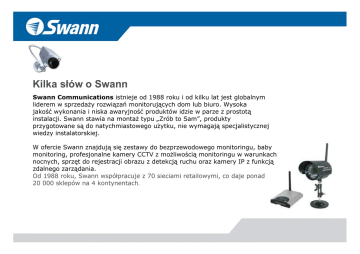 Kilka słów o Swann Swann Communications istnieje od 1988 roku i od kilku lat jest globalnym liderem w sprzedaży rozwiązań monitorujących dom lub biuro. Wysoka jakość wykonania i niska awaryjność produktów idzie w parze z prostotą instalacji. Swann stawia na montaż typu „Zrób to Sam”, produkty przygotowane są do natychmiastowego użytku, nie wymagają specjalistycznej wiedzy instalatorskiej. W ofercie Swann znajdują się zestawy do bezprzewodowego monitoringu, baby monitoring, profesjonalne kamery CCTV z możliwością monitoringu w warunkach nocnych, sprzęt do rejestracji obrazu z detekcją ruchu oraz kamery IP z funkcją zdalnego zarządania. Od 1988 roku, Swann współpracuje z 70 sieciami retailowymi, co daje ponad 20 000 sklepów na 4 kontynentach. OutdoorCam Wodoodporna kamera do monitoringu Dozór dzienny i nocny 9 wodoodporna obudowa, zabezpieczona przed zniszczeniem 9 rozdzielczość obrazu CCTV 9 11 diod umożliwiających pracę w warunkach minimalnego oświetlenia 9 prosta w instalacji i użyciu 9 długość kabla 22m 9 możliwość podłączenia do telewizora, odtwarzacza wideo/DVD lub monitora LCD Dummy PiR Kolorowa kamera imitująca czujkę przeciwpożarową Dyskretny sposób monitorowania pomieszczeń 9 kamera CCD 1/4" 9 rozdzielczość 420 linii TV 9 kąt widzenia 90 stopni 9 ukryty system monitoringu i śledzenia 9 wyrafinowany sposób na oszukanie złodzieja Night Hawk Zewnętrzna kamera bezprzewodowa Przystosowana do pracy w warunkach minimalnego oświetlenia 9 doskonałe rozwiązanie do monitoringu domu i biura 9 zestaw typu “Zrób to Sam” – wystarczy podłączyć zasilanie 9 profesjonalna jakość obrazu 9 zestaw zawiera odbiornik umożliwiający podłączenie do odtwarzacza video, telewizora lub komputera z kartą telewizyjną 9 11 diod umożliwiających pracę w warunkach minimalnego oświetlenia Kamera bezprzewodowa Eagle-Eye Miniaturowa kamera do monitoringu Z odbiornikiem radiowym 9 możliwość podłączenia kilku kamer z wykorzystaniem 4 kanałów 9 kamera o miniaturowych rozmiarach - może być ukryta niemal wszędzie 9 zasięg do 100 metrów 9 odbiornik można w prosty sposób podłączy do odtwarzacza video, telewizora, monitora z wyjściem AV lub komputera z kartą telewizyjną 9 możliwość zasilania kamery z baterii 9V lub z zasilacza sieciowego Videodomofon Intercom z kamerą wysokiej rozdzielczości Zanim otworzysz, sprawdź kto stoi przed domem 9 zapewni bezpieczeństwo najbliższym ci osobom 9 nawet po zmierzchu zobaczysz, kto stoi przed twoimi drzwiami 9 prosty w instalacji, trudny do sforsowania 9 czarno-biały 4-calowy monitor CRT wysokiej rozdzielczości (420 linii TV) 9 dwukierunkowy system komunikacji 9 przycisk otwierający drzwi (dotyczy drzwi z elektrozamkiem) 9 funkcja alarmu odstraszającego intruza Videodomofon z kolorowym wyświetlaczem Intercom z kamerą wysokiej rozdzielczości Zanim otworzysz, sprawdź kto stoi przed domem 9 zestaw zawiera wszystkie elementy niezbędne do szybkiej i prostej instalacji, w tym dwa przewody 30 metrów każdy 9 5” kolorowy monitor 9 trudny do sforsowania 9 dwukierunkowy system komunikacji 9 przycisk otwierający drzwi (dotyczy drzwi z elektrozamkiem) 9 funkcja alarmu odstraszającego intruza Anioł Stróż Zestaw do monitoringu dzieci „Elektroniczna niania” z 2.5 calowym monitorem LCD 9 bezprzewodowy kolorowy 2.5” wyświetlacz LCD 9 wyświetlacz wyposażony w głośnik 9 wbudowany bardzo czuły mikrofon 9 wmontowane w kamerę diody IR pozwalają na dozór dziecka nawet nocą 9 zasięg do 100 metrów 9 odbiornik można w prosty sposób podłączyć do odtwarzacza video, telewizora, monitora z wyjściem AV lub komputera z kartą telewizyjną SecuraView Zestaw 2 Kamer z Monitorem Możliwość podłączenia do nagrywarki obrazu 9 2 czarno-białe kamery, rozdzielczość 380 linii TV 9 wbudowany czuły mikrofon 9 diody umożliwiające pracę w warunkach minimalnego oświetlenia 9 5" (12.5mm) ekran wysokiej rozdzielczości 9 automatyczne przełączanie obrazu z kamer 9 łatwe podłączenie do rejestratora obrazu DVR4-Net-PLUS Sieciowa nagrywarka obrazu cyfrowego do zastosowań w sieciach LAN, WAN i Web 9 możliwość nagrywania i podglądu obrazu z 4 kamer 9 archiwizacja nagranego materiału na twardym dysku lub przenośnej pamięci flash USB* 9 gotowa do pracy w sieci WAN, LAN i Web 9 prosta instalacja (ustaw i zapomnij) 9 sterowanie przy pomocy pilota 9 funkcje: detekcja ruchu, audio monitoring, inteligentna wyszukiwarka 9 współpraca z dowolnym odbiornikiem TV, monitorem lub kamerami do monitoringu ____________________________________________ *zestaw nie zawiera twardego dysku ani pamięci flash PC Security Guardian Karta PCI do przechwytywania i archiwizacji obrazu z kamer monitorujących 9 zamień swój komputer PC w mini system do monitoringu 9 możliwość podglądu i nagrywania obrazu z 4 kamer jednocześnie, stały dostęp przez 24/7 9 serwer WWW – udostępnianie obrazu z dowolnej kamery lub nagrywarki DVR w Internecie 9 funkcja powiadamiania na adres e-mail o wykrytym ruchu w dozorowanym sektorze 9 łatwość rozbudowy przy użyciu kamer marki Swann Kamera Bulldog Profesjonalna kamera monitorująca Kolorowy obraz wysokiej rozdzielczości CCD 9 kolorowy obraz wysokiej jakości 9 kamera CCD 1/4" (6.35mm) o rozdzielczości 420 linii TV 9 zasięg widzenia nocnego do 10 metrów, 12 diod podczerwieni 9 do użytku zewnętrznego oraz wewnątrz pomieszczeń 9 łatwe podłączenie do TV, DVR, VCR lub monitora 9 wandaloodporna metalowa obudowa Kamera „Nocna Super Sowa” Kolorowa kamera do dozoru nocnego Doskonałe rozwiązanie dla miejsc użyteczności publicznej, podziemnych parkingów, supermarketów lub dużych magazynów 9 kolorowa kamera CCD 1/4" 9 105 diod podczerwieni umożliwiających widzenie nocne na duże odległości 9 kolorowy obraz w dzień oraz obraz w podczerwieni w nocy 9 szerokokątny obiektyw 9 szybka w montażu na ścianie, suficie, pod dachem 9 łatwe 