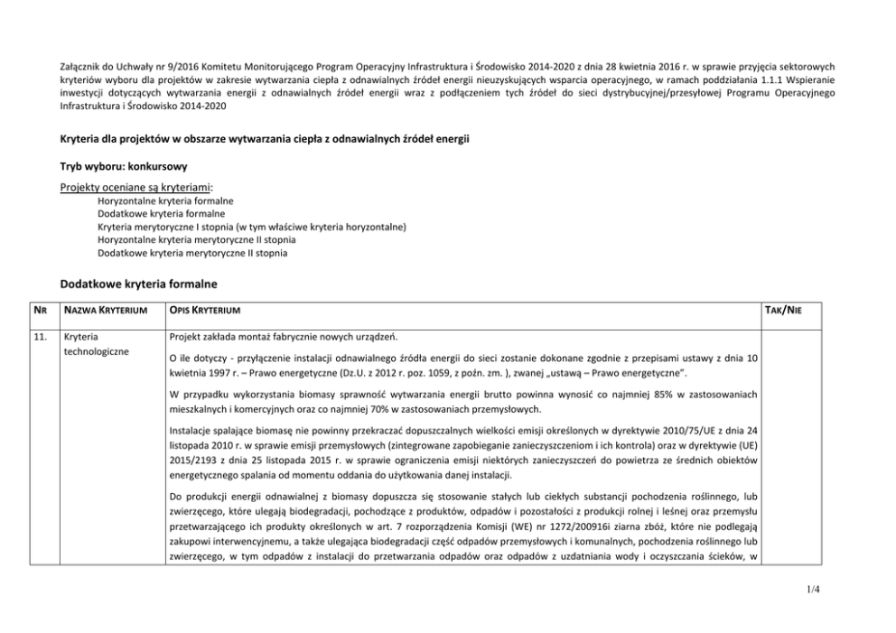 Załącznik do Uchwały nr 9/2016 Komitetu Monitorującego Program Operacyjny Infrastruktura i Środowisko 2014‐2020 z dnia 28 kwietnia 2016 r. w sprawie przyjęcia sektorowych kryteriów wyboru dla projektów w zakresie wytwarzania ciepła z odnawialnych źródeł energii nieuzyskujących wsparcia operacyjnego, w ramach poddziałania 1.1.1 Wspieranie inwestycji dotyczących wytwarzania energii z odnawialnych źródeł energii wraz z podłączeniem tych źródeł do sieci dystrybucyjnej/przesyłowej Programu Operacyjnego Infrastruktura i Środowisko 2014‐2020 Kryteria dla projektów w obszarze wytwarzania ciepła z odnawialnych źródeł energii Tryb wyboru: konkursowy Projekty oceniane są kryteriami: Horyzontalne kryteria formalne Dodatkowe kryteria formalne Kryteria merytoryczne I stopnia (w tym właściwe kryteria horyzontalne) Horyzontalne kryteria merytoryczne II stopnia Dodatkowe kryteria merytoryczne II stopnia Dodatkowe kryteria formalne NR NAZWA KRYTERIUM OPIS KRYTERIUM 11. Kryteria technologiczne Projekt zakłada montaż fabrycznie nowych urządzeń. TAK/NIE O ile dotyczy ‐ przyłączenie instalacji odnawialnego źródła energii do sieci zostanie dokonane zgodnie z przepisami ustawy z dnia 10 kwietnia 1997 r. – Prawo energetyczne (Dz.U. z 2012 r. poz. 1059, z poźn. zm. ), zwanej „ustawą – Prawo energetyczne”. W przypadku wykorzystania biomasy sprawność wytwarzania energii brutto powinna wynosić co najmniej 85% w zastosowaniach mieszkalnych i komercyjnych oraz co najmniej 70% w zastosowaniach przemysłowych. Instalacje spalające biomasę nie powinny przekraczać dopuszczalnych wielkości emisji określonych w dyrektywie 2010/75/UE z dnia 24 listopada 2010 r. w sprawie emisji przemysłowych (zintegrowane zapobieganie zanieczyszczeniom i ich kontrola) oraz w dyrektywie (UE) 2015/2193 z dnia 25 listopada 2015 r. w sprawie ograniczenia emisji niektórych zanieczyszczeń do powietrza ze średnich obiektów energetycznego spalania od momentu oddania do użytkowania danej instalacji. Do produkcji energii odnawialnej z biomasy dopuszcza się stosowanie stałych lub ciekłych substancji pochodzenia roślinnego, lub zwierzęcego, które ulegają biodegradacji, pochodzące z produktów, odpadów i pozostałości z produkcji rolnej i leśnej oraz przemysłu przetwarzającego ich produkty określonych w art. 7 rozporządzenia Komisji (WE) nr 1272/200916i ziarna zbóż, które nie podlegają zakupowi interwencyjnemu, a także ulegająca biodegradacji część odpadów przemysłowych i komunalnych, pochodzenia roślinnego lub zwierzęcego, w tym odpadów z instalacji do przetwarzania odpadów oraz odpadów z uzdatniania wody i oczyszczania ścieków, w 1/4 szczególności osadów ściekowych, zgodnie z przepisami o odpadach w zakresie kwalifikowania części energii odzyskanej z termicznego przekształcania odpadów; do dofinansowania nie kwalifikują się instalacje do spalania węgla, ani do współspalania biomasy z węglem zarówno w instalacjach wielopaliwowego spalania jak i dedykowanego spalania wielopaliwowego. Ocena dokonywana na podstawie studium wykonalności i oświadczeń. 12 Udokumentowana możliwość zbytu energii cieplnej. 13 Wymogi związane z ochroną środowiska Wnioskodawca posiada list intencyjny lub umowę wstępną na sprzedaż energii cieplnej. Wnioskodawca posiada warunki przyłączenia lub umowę przyłączeniową do sieci ciepłowiczej (wymagane w przypadku sprzedaży z wykorzystaniem sieci). Kryterium uznaje się za spełnione w przypadku zużywania wyprodukowanej energii w całości na potrzeby własne. W ramach kryterium ocenie podlega wpływ projektu na obszary Natura 2000 oraz szlaki migracyjne zwierząt. Kryterium ma zagwarantować, że realizowane będą przyjazne dla środowiska projekty, których realizacja nie wpływa negatywnie na obszary Natura 2000 i szlaki migracyjne zwierząt. Należy przedstawić odpowiednie zaświadczenie z RDOŚ. Projekty biomasowe powinny być zgodne z właściwym dla miejsca realizacji projektu wojewódzkim programem ochrony powietrza. 1 OPIS KRYTERIUM ZASADY OCENY KRYTERIUM Nakład ze środków UE na 1 MWh planowanej produkcji energii w ciągu roku Wartość wydatków planowanych do poniesienia ze środków UE, rozumiana jako sumaryczna wnioskowana wartość pomocy UE niezależnie od formy wsparcia, na 1 MWh planowanej rocznej produkcji energii cieplnej – wartość wskaźnika w zł/MWh/rok Punkty przyznawane będą za osiągnięcie danej wartości wskaźnika nakładów UE (PLN) na 1 MWh planowanej rocznej produkcji energii cieplnej (X) w odniesieniu do średniej wartości wskaźnika (Xśr) obliczonej dla wszystkich projektów w ramach danego naboru biorących udział w ocenie merytorycznej I stopnia. Punkty przyznawane są w następujący sposób: • X ≤ 0,6* Xśr – 4 pkt • 0,6* Xśr < X ≤ 0,8* Xśr – 3 pkt • 0,8* Xśr < X ≤ 1,2* Xśr – 2 pkt • 1,2* Xśr < X ≤ 1,4* Xśr – 1 pkt • X > 1,4* Xśr – 0 pkt. 4 PUNKTACJA NAZWA KRYTERIUM MAX. NR WAGA Kryteria merytoryczne I stopnia 16 2/4 Nakład ze środków UE na jednostkową redukcję rocznej emisji CO2 2 Nakład ze środków UE na 1 MW mocy zainstalowanej 3 4 Dodatkowe korzyści środowiskowe związane z realizacją projektu Wartość wydatków planowanych do poniesienia ze środków UE, rozumiana jako sumaryczna wnioskowana wartość pomocy UE niezależnie od formy wsparcia, na redukcję 1 tony CO2/rok Ocenie podlega wartość nakładów poniesionych ze środków UE. rozumiana jako sumaryczna wnioskowana wartość pomocy UE niezależnie od formy wsparcia, na 1 MW mocy zainstalowanej Punkty będą przyznawane dla projektów przyczyniających się do: Punkty przyznawane będą za osiągnięcie danej wartości wskaźnika nakładów UE (PLN) na roczną redukcję 1 tony CO2(X) w odniesieniu do średniej wartości wskaźnika (Xśr) obliczonej dla wszystkich projektów w ramach danego naboru biorących udział w ocenie merytorycznej I sto