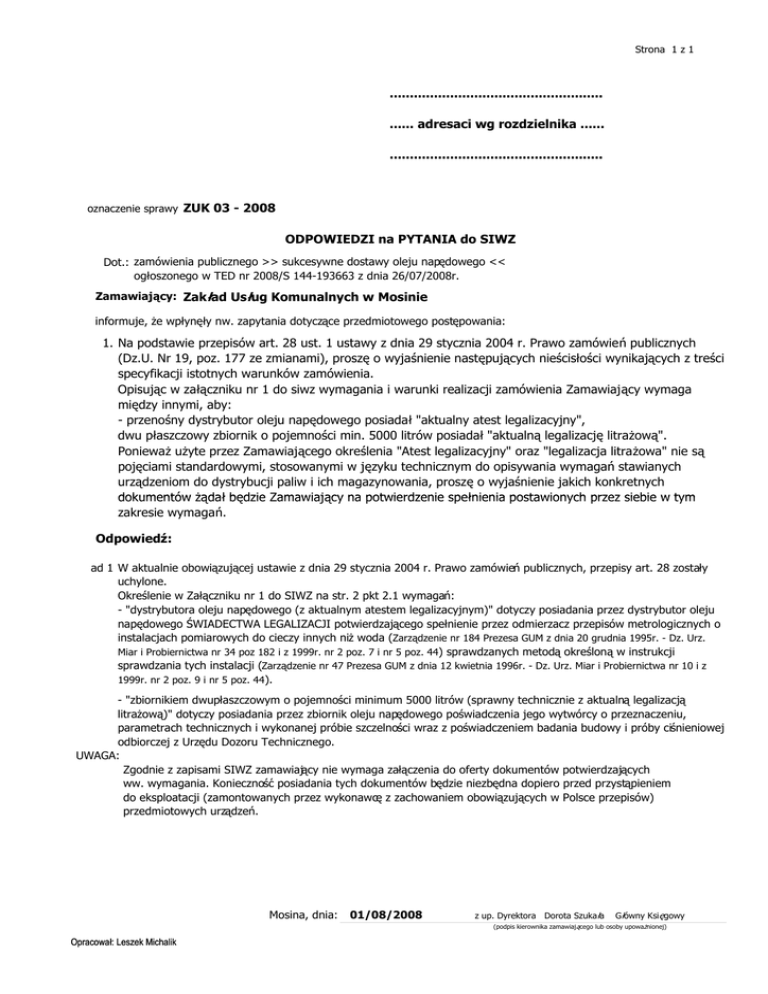 Strona 1 z 1 ..................................................... ...... adresaci wg rozdzielnika ...... ..................................................... oznaczenie sprawy ZUK 03 - 2008 ODPOWIEDZI na PYTANIA do SIWZ Dot.: zamówienia publicznego >> sukcesywne dostawy oleju napędowego << ogłoszonego w TED nr 2008/S 144-193663 z dnia 26/07/2008r. Zamawiający: Zakład Usług Komunalnych w Mosinie informuje, że wpłynęły nw. zapytania dotyczące przedmiotowego postępowania: 1. Na podstawie przepisów art. 28 ust. 1 ustawy z dnia 29 stycznia 2004 r. Prawo zamówień publicznych (Dz.U. Nr 19, poz. 177 ze zmianami), proszę o wyjaśnienie następujących nieścisłości wynikających z treści specyfikacji istotnych warunków zamówienia. Opisując w załączniku nr 1 do siwz wymagania i warunki realizacji zamówienia Zamawiający wymaga między innymi, aby: - przenośny dystrybutor oleju napędowego posiadał "aktualny atest legalizacyjny", dwu płaszczowy zbiornik o pojemności min. 5000 litrów posiadał "aktualną legalizację litrażową". Ponieważ użyte przez Zamawiającego określenia "Atest legalizacyjny" oraz "legalizacja litrażowa" nie są pojęciami standardowymi, stosowanymi w języku technicznym do opisywania wymagań stawianych urządzeniom do dystrybucji paliw i ich magazynowania, proszę o wyjaśnienie jakich konkretnych dokumentów żądał będzie Zamawiający na potwierdzenie spełnienia postawionych przez siebie w tym zakresie wymagań. Odpowiedź: ad 1 W aktualnie obowiązującej ustawie z dnia 29 stycznia 2004 r. Prawo zamówień publicznych, przepisy art. 28 zostały uchylone. Określenie w Załączniku nr 1 do SIWZ na str. 2 pkt 2.1 wymagań: - "dystrybutora oleju napędowego (z aktualnym atestem legalizacyjnym)" dotyczy posiadania przez dystrybutor oleju napędowego ŚWIADECTWA LEGALIZACJI potwierdzającego spełnienie przez odmierzacz przepisów metrologicznych o instalacjach pomiarowych do cieczy innych niż woda (Zarządzenie nr 184 Prezesa GUM z dnia 20 grudnia 1995r. - Dz. Urz. Miar i Probiernictwa nr 34 poz 182 i z 1999r. nr 2 poz. 7 i nr 5 poz. 44) sprawdzanych metodą określoną w instrukcji sprawdzania tych instalacji (Zarządzenie nr 47 Prezesa GUM z dnia 12 kwietnia 1996r. - Dz. Urz. Miar i Probiernictwa nr 10 i z 1999r. nr 2 poz. 9 i nr 5 poz. 44). - "zbiornikiem dwupłaszczowym o pojemności minimum 5000 litrów (sprawny technicznie z aktualną legalizacją litrażową)" dotyczy posiadania przez zbiornik oleju napędowego poświadczenia jego wytwórcy o przeznaczeniu, parametrach technicznych i wykonanej próbie szczelności wraz z poświadczeniem badania budowy i próby ciśnieniowej odbiorczej z Urzędu Dozoru Technicznego. UWAGA: Zgodnie z zapisami SIWZ zamawiający nie wymaga załączenia do oferty dokumentów potwierdzających ww. wymagania. Konieczność posiadania tych dokumentów będzie niezbędna dopiero przed przystąpieniem do eksploatacji (zamontowanych przez wykonawcę z zachowaniem obowiązujących w Polsce przepisów) przedmiotowych urządzeń. Mosina, dnia: 01/08/2008 z up. Dyrektora Dorota Szukała Główny Księgowy (podpis kierownika zamawiającego lub osoby upoważnionej) Opracował: Leszek Michalik