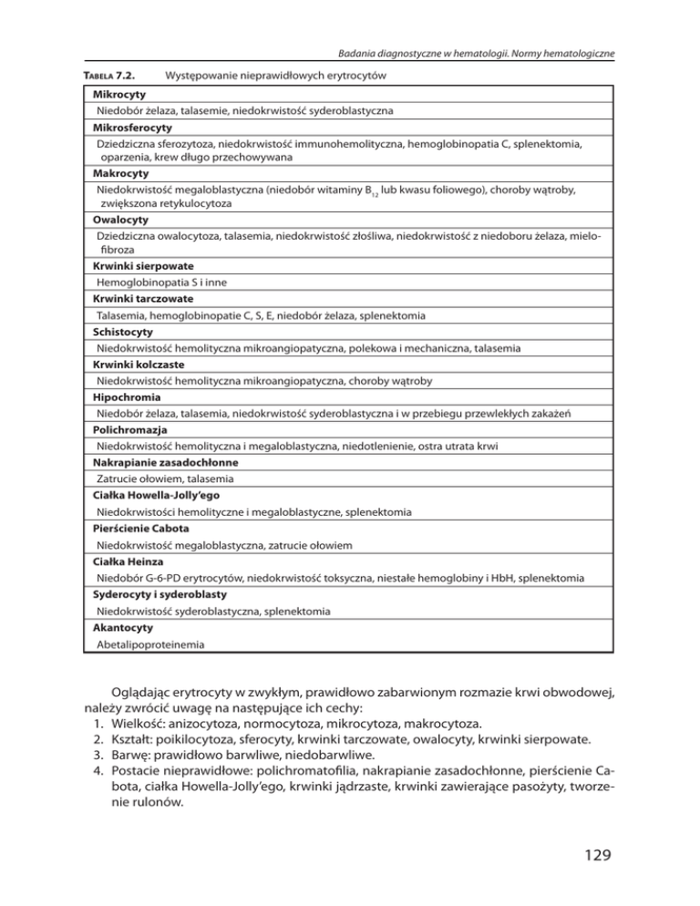 Badania diagnostyczne w hematologii. Normy hematologiczne TABELA 7.2. Występowanie nieprawidłowych erytrocytów Mikrocyty Niedobór żelaza, talasemie, niedokrwistość syderoblastyczna Mikrosferocyty Dziedziczna sferozytoza, niedokrwistość immunohemolityczna, hemoglobinopatia C, splenektomia, oparzenia, krew długo przechowywana Makrocyty Niedokrwistość megaloblastyczna (niedobór witaminy B12 lub kwasu foliowego), choroby wątroby, zwiększona retykulocytoza Owalocyty Dziedziczna owalocytoza, talasemia, niedokrwistość złośliwa, niedokrwistość z niedoboru żelaza, mielofibroza Krwinki sierpowate Hemoglobinopatia S i inne Krwinki tarczowate Talasemia, hemoglobinopatie C, S, E, niedobór żelaza, splenektomia Schistocyty Niedokrwistość hemolityczna mikroangiopatyczna, polekowa i mechaniczna, talasemia Krwinki kolczaste Niedokrwistość hemolityczna mikroangiopatyczna, choroby wątroby Hipochromia Niedobór żelaza, talasemia, niedokrwistość syderoblastyczna i w przebiegu przewlekłych zakażeń Polichromazja Niedokrwistość hemolityczna i megaloblastyczna, niedotlenienie, ostra utrata krwi Nakrapianie zasadochłonne Zatrucie ołowiem, talasemia Ciałka Howella-Jolly’ego Niedokrwistości hemolityczne i megaloblastyczne, splenektomia Pierścienie Cabota Niedokrwistość megaloblastyczna, zatrucie ołowiem Ciałka Heinza Niedobór G-6-PD erytrocytów, niedokrwistość toksyczna, niestałe hemoglobiny i HbH, splenektomia Syderocyty i syderoblasty Niedokrwistość syderoblastyczna, splenektomia Akantocyty Abetalipoproteinemia Oglądając erytrocyty w zwykłym, prawidłowo zabarwionym rozmazie krwi obwodowej, należy zwrócić uwagę na następujące ich cechy: 1. Wielkość: anizocytoza, normocytoza, mikrocytoza, makrocytoza. 2. Kształt: poikilocytoza, sferocyty, krwinki tarczowate, owalocyty, krwinki sierpowate. 3. Barwę: prawidłowo barwliwe, niedobarwliwe. 4. Postacie nieprawidłowe: polichromatofilia, nakrapianie zasadochłonne, pierścienie Cabota, ciałka Howella-Jolly’ego, krwinki jądrzaste, krwinki zawierające pasożyty, tworzenie rulonów. 129 Rozdział 7 Dokładne obejrzenie rozmazu ze zwróceniem uwagi na wyżej wymienione cechy ma dużą wartość diagnostyczną. Niezbędnym warunkiem prawidłowej oceny jest wykonanie cienkiego, dobrze zabarwionego rozmazu. 7.2.3.1. Wielkość W rutynowych badaniach laboratoryjnych wykonywanych przez doświadczonego hematologa zazwyczaj poprzestaje się na jakościowym określeniu wielkości erytrocytów (normo-, mikro- lub makrocyty). Krwinki czerwone nadmiernie małe (średnica poniżej 6 μm) nazywa się mikrocytami. Występują one zwłaszcza w niedokrwistości z niedoboru żelaza. Wykazują zazwyczaj zmniejszenie MCV. Erytrocyty nadmiernie duże, o średnicy ponad 9 μm, nazywa się makrocytami, o średnicy większej niż 12 μm – megalocytami. Występują one zwłaszcza w niedokrwistościach megaloblastycznych. Wykazują również zwiększenie MCV. Nasilenie anizocytozy można oznaczyć od 0 do 4+. 7.2.3.2. Zmiany kształtu krwinek czerwonych (poikilocytoza) Nasilenie poikilocytozy można oznaczyć od 0 do 4+. Sferocytoza Sferocyty sa erytrocytami mającymi mniejszą średnicę, a większą grubość w porównaniu z prawidłowymi komórkami. W prawidłowych erytrocytach (dyskocytach) stosunek średnicy do grubości wynosi 2,5-4,2:1. Poniżej 2,4 świadczy o sferocytozie, a powyżej 4,2 – o nadmiernie płaskich krwinkach (leptocyty). Najlepszym ilościowym pomiarem stopnia sferocytozy jest badanie oporności osmotycznej erytrocytów. Sferocyty łatwiej ulegają lizie w roztworach hipotonicznych. Leptocyty wykazują zwiększoną oporność. W rozmazie krwi obwodowej sferocyty przedstawiają się jako mniejsze i bardziej okrągłe erytrocyty bez widocznego przejaśnienia w środku. Sferocyty nie skupiają się w rulony. Sferocyty stanowią charakterystyczną cechę wrodzonej niedokrwistości hemolitycznej, zwanej dziedziczną sferocytozą. Mogą one również występować w nabytych niedokrwistościach hemolitycznych (immunohemolitycznych) oraz u osób ze znacznie powiększoną śledzioną. Eliptocytoza (owalocytoza) W stanach prawidłowych tylko 10-15% erytrocytów ma kształt owalny (długość 8-10 μm). Zwiększony ich odsetek stwierdza się w wielu rodzajach niedokrwistości (niedokrwistość z niedoboru żelaza, niedokrwistości megaloblastyczne, osteomieloskleroza, talasemia), a zwłaszcza w dziedzicznej owalocytozie ponad 50% populacji erytrocytów ma kształt owalny. W osteomielosklerozie erytrocyty mają często kształt kropli łez. Leptocyty i krwinki tarczowate Są to nieprawidłowe cienkie erytrocyty, wykazujące nadmiernie duże środkowe przejaśnienie. Niekiedy może być zabarwiony tylko wąski rąbek hemoglobiny na obwodzie krwinki i w samym środku (krwinki tarczowate). Leptocyty i krwinki tarczowate wykazują zwiększoną oporność na hemolizę w roztworach hipotonicznych. Dowodzą one zaburzeń w syntezie hemoglobiny lub obecności nieprawidłowych hemoglobin. Występują w ciężkiej niedokrwi- 130