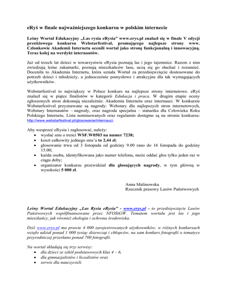 eRyś w finale najważniejszego konkursu w polskim internecie Leśny Wortal Edukacyjny „Las rysia eRysia” www.erys.pl znalazł się w finale V edycji prestiżowego konkursu Webstarfestival, promującego najlepsze strony www. Członkowie Akademii Internetu ocenili wortal jako stronę funkcjonalną i innowacyjną. Teraz kolej na werdykt internautów. Już od trzech lat dzieci w towarzystwie eRysia poznają las i jego tajemnice. Razem z nim zwiedzają leśne zakamarki, poznają mieszkańców lasu, uczą się go słuchać i rozumieć. Doceniła to Akademia Internetu, która uznała Wortal za przedsięwzięcie dostosowane do potrzeb dzieci i młodzieży, a jednocześnie pomysłowe i atrakcyjne dla tak wymagających użytkowników. Webstarfestival to największy w Polsce konkurs na najlepsze strony internetowe. eRyś znalazł się w piątce finalistów w kategorii Edukacja i praca. W drugim etapie oceny zgłoszonych stron dokonują niezależnie: Akademia Internetu oraz internauci. W konkursie Webstarfestival przyznawane są nagrody: Webstary dla najlepszych stron internetowych, Webstary Internautów – nagrody, oraz nagroda specjalna – statuetka dla Człowieka Roku Polskiego Internetu. Lista nominowanych oraz regulamin dostępne są na stronie konkursu: http://www.webstarfestival.pl/glosowanie/internauci. Aby wesprzeć eRysia i zagłosować, należy: • wysłać sms o treści WSF.W0503 na numer 7238; • koszt całkowity jednego sms’a to 2,44 zł; • głosowanie trwa od 3 listopada od godziny 9.00 rano do 16 listopada do godziny 15.00; • każda osoba, identyfikowana jako numer telefonu, może oddać głos tylko jeden raz w ciągu doby; • organizator konkursu przewidział dla głosujących nagrody, w tym główną w wysokości 5 000 zł. Anna Malinowska Rzecznik prasowy Lasów Państwowych Leśny Wortal Edukacyjny „Las Rysia eRysia” - www.erys.pl - to przedsięwzięcie Lasów Państwowych współfinansowane przez NFOSiGW. Tematem wortalu jest las i jego mieszkańcy, jak również ekologia i ochrona środowiska. Dziś www.erys.pl ma prawie 4 000 zarejestrowanych użytkowników, w różnych konkursach wzięło udział ponad 1 000 tysiąc dziewcząt i chłopców, na sam konkurs fotografii o tematyce przyrodniczej przesłano ponad 700 fotografii. Na wortal składają się trzy serwisy: • dla dzieci ze szkół podstawowych klas 4 – 6, • dla gimnazjalistów i licealistów oraz • serwis dla nauczycieli. W serwisach znajdują się: • Kilkadziesiąt gier, zabaw i prezentacji. Można wybrać się na wirtualny spacer po lesie, można się wcielić w rolę leśnika i spróbować wyhodować samodzielnie las lub oznaczyć, z jakiego drzewa pochodzi liść lub owoc, który znaleźliśmy podczas leśnych spacerów. • Słownik, który pozwala sprawdzić znaczenie słów używanych przez przyrodników i leśników. • Leśnoteka - multimedialna encyklopedia. W niej opisy najważniejszych gatunków ssaków, ptaków, gadów, płazów, owadów i roślin żyjących w polskich lasach, wzbogacone o zdjęcia, nagrania głosów i filmy. • „Blog Leśniczego”. Jeśli ktoś chce otrzymać z pierwszej ręki informacje na temat życia lasu i leśnika, powinien koniecznie zajrzeć do „Bloga Leśniczego”, który co tydzień opisuje swoje przygody z jeleniami, drzewami i ... grzybiarzami. Na aktywnych internautów czeka również forum. • Konkursy z atrakcyjnymi nagrodami. Coroczne konkursy fotograficzne, konkursy wiedzy oraz na najlepsze blogi o tematyce przyrodniczej. • Galeria fotografii. Gdzie do umieszczanych przez dzieci prac komentarz i fachowe porady pisze uznany fotografik przyrody Piotr Pukos. • W serwisie dla nauczycieli zostały zamieszczone: o zbiór scenariuszy zajęć, z kartami pracy (dostosowanych do wykorzystania wiedzy z wortalu), o forum dyskusyjne dla nauczycieli, Nauczyciele mogą też zapytać leśnika o zjawiska zachodzące w lesie i o urządzenia leśnej infrastruktury. Autorami treści zamieszczonych na stronach eRysia są leśnicy, którzy na co dzień zajmują się edukacją. Autorem szaty graficznej jest rysownik Barnaba Majewski. W encyklopedii leśnej zostały wykorzystane zdjęcia Antoniego Kasprzaka, fotografika-leśnika. Wydawnictwo Forest udostępniło skany liści, kwiatów, owoców, nasion i pędów drzew. Wszystko poskładała w całość firma InternetArt, która stworzyła mechanizm strony.